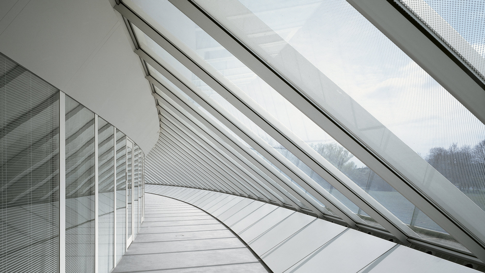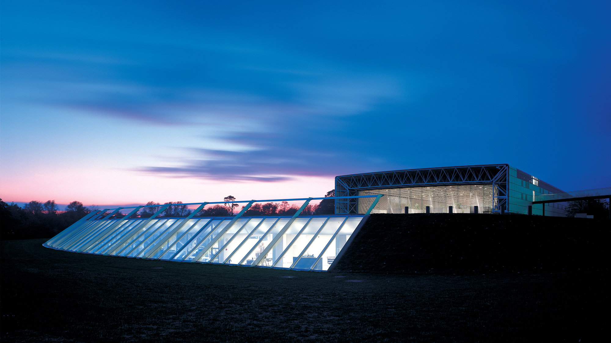 The solution lay in the natural topography of the site, with the ground to the east and south of the existing building falling away towards a lake. This slope allowed the extended basement to emerge naturally into the open, and to have its own glazed frontage onto the lake. Spaces for the study collection and workshops form a rectangular continuation of the basement, while cellular offices fan out to the south-east in the form of a glazed crescent incised into the grassy bank. Behind the glass a naturally lit circulation zone gives access to offices. The exterior gives little hint of what lies underneath. Approaching from the original building, a level grass lawn punctuated by rooflights and a narrow ramp disappearing beneath the turf provide a clue; but only from the lake is the full extent of the wing apparent in the great inclined sweep of fritted glass.