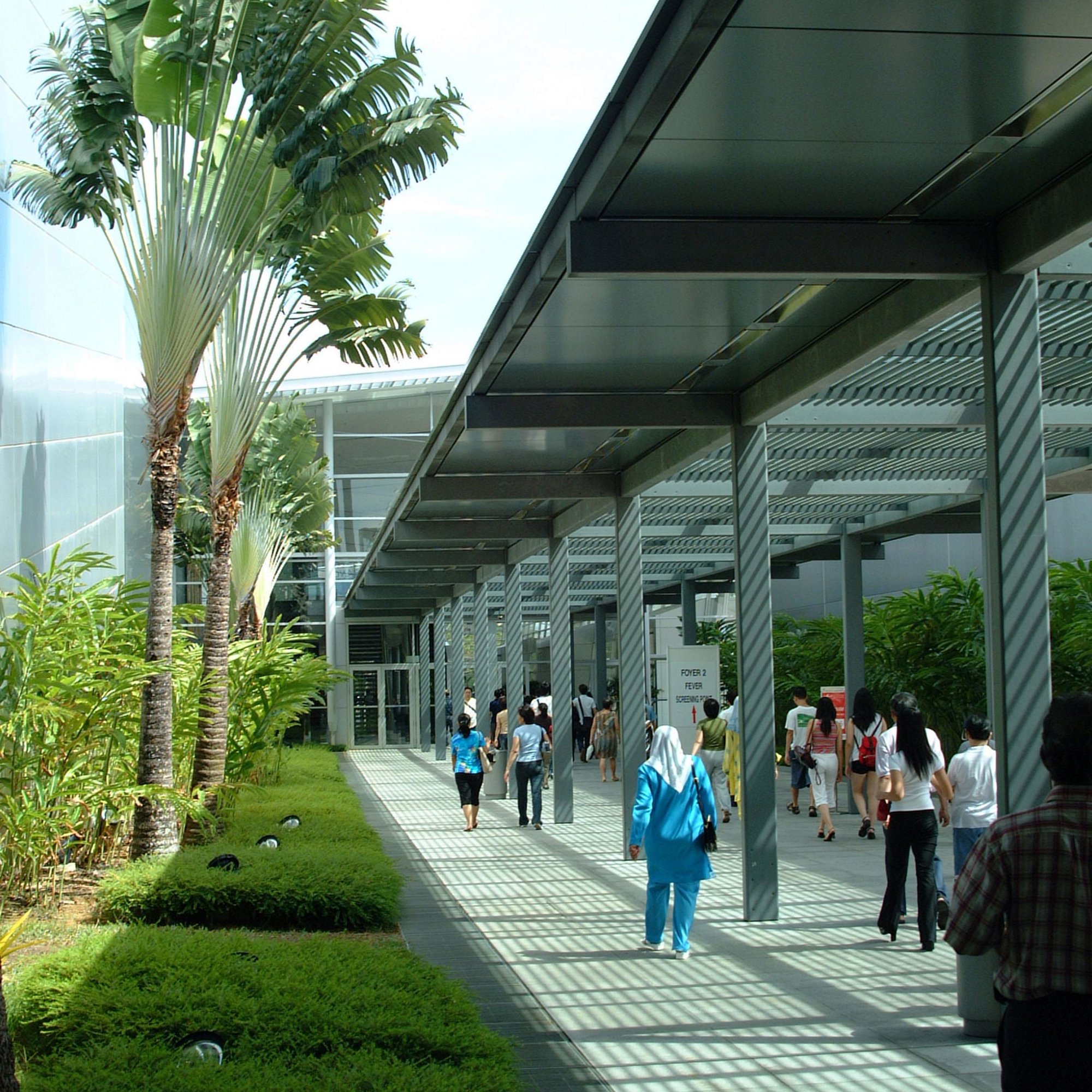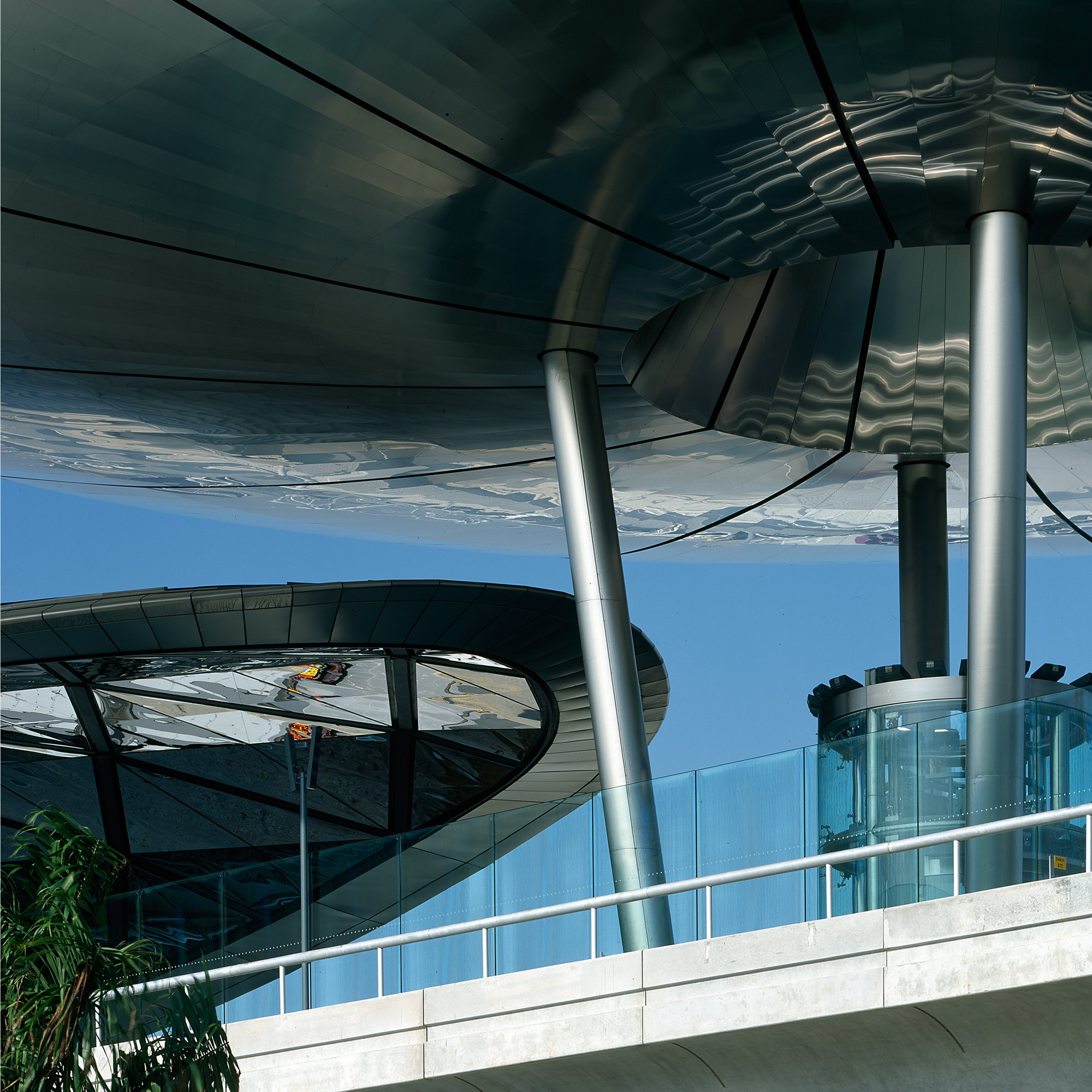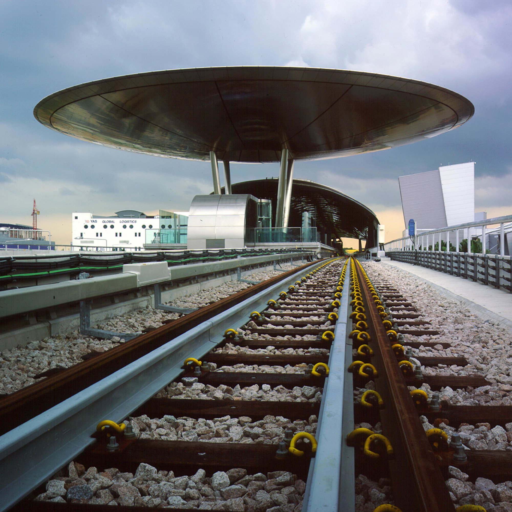 The station is announced externally by two highly sculptural roof elements, which overlap to dynamic visual effect and appear to hover weightlessly above the heavy concrete base. A 40-metre-diameter disc, clad in stainless steel, shelters the ticket hall and marks the station entrance, while a 130-metre-long, blade-like form, sheathed in titanium, covers the platforms, its reflective soffit constantly animated with the reflections of passengers and passing trains. The station is used by very large numbers of people at peak times and so creating clear sight lines and a strong sense of orientation were fundamental to its design. At ground level, the concourse is open, with views on one side to the street, and on the other side to a lush tropical garden created between the station and the Expo Centre. The elevated platforms are reached from the concourse and ticket office at street level by lift or escalators. Enclosure is kept to a minimum and passengers can look up through a long cut in the floor structure to glimpse the trains coming and going overhead.