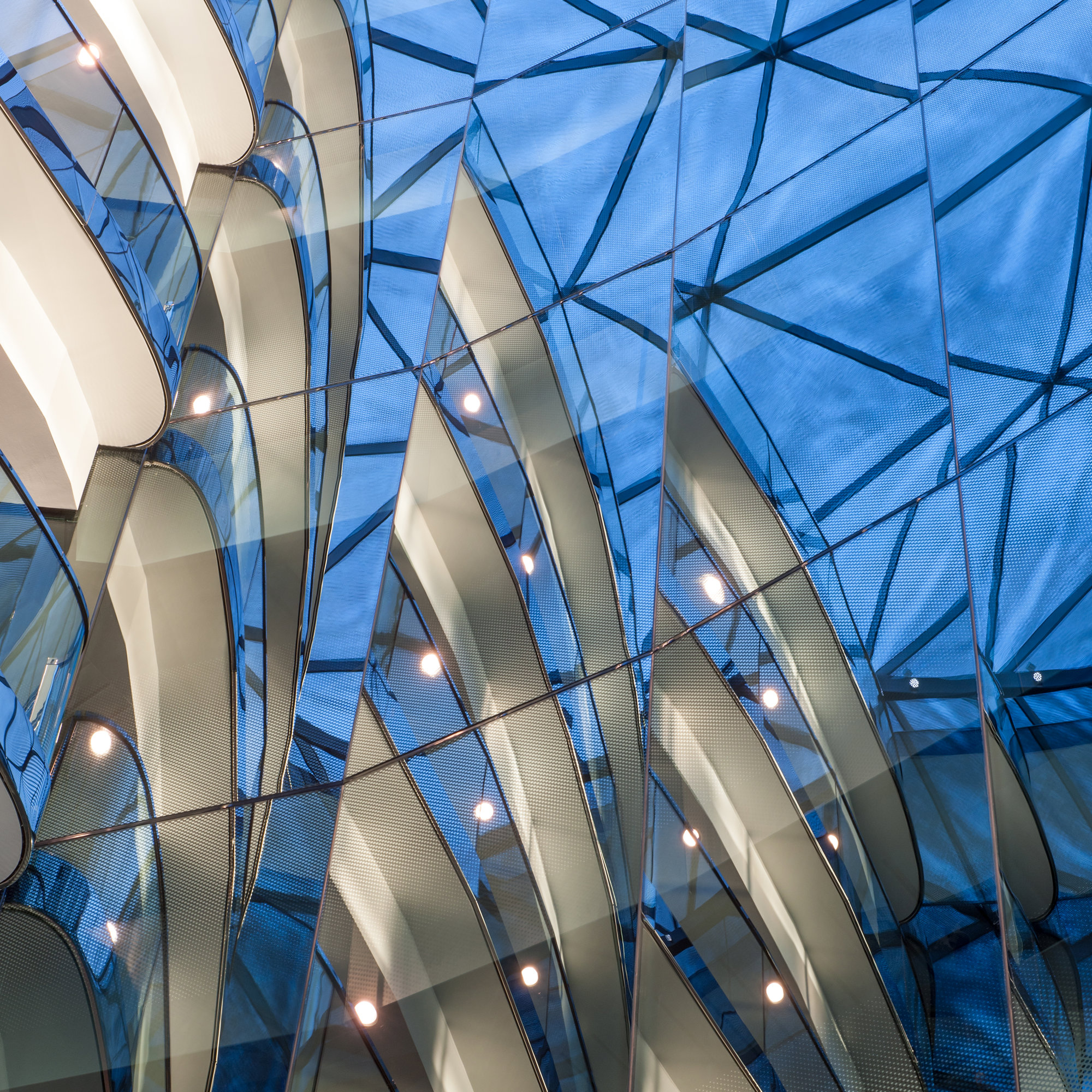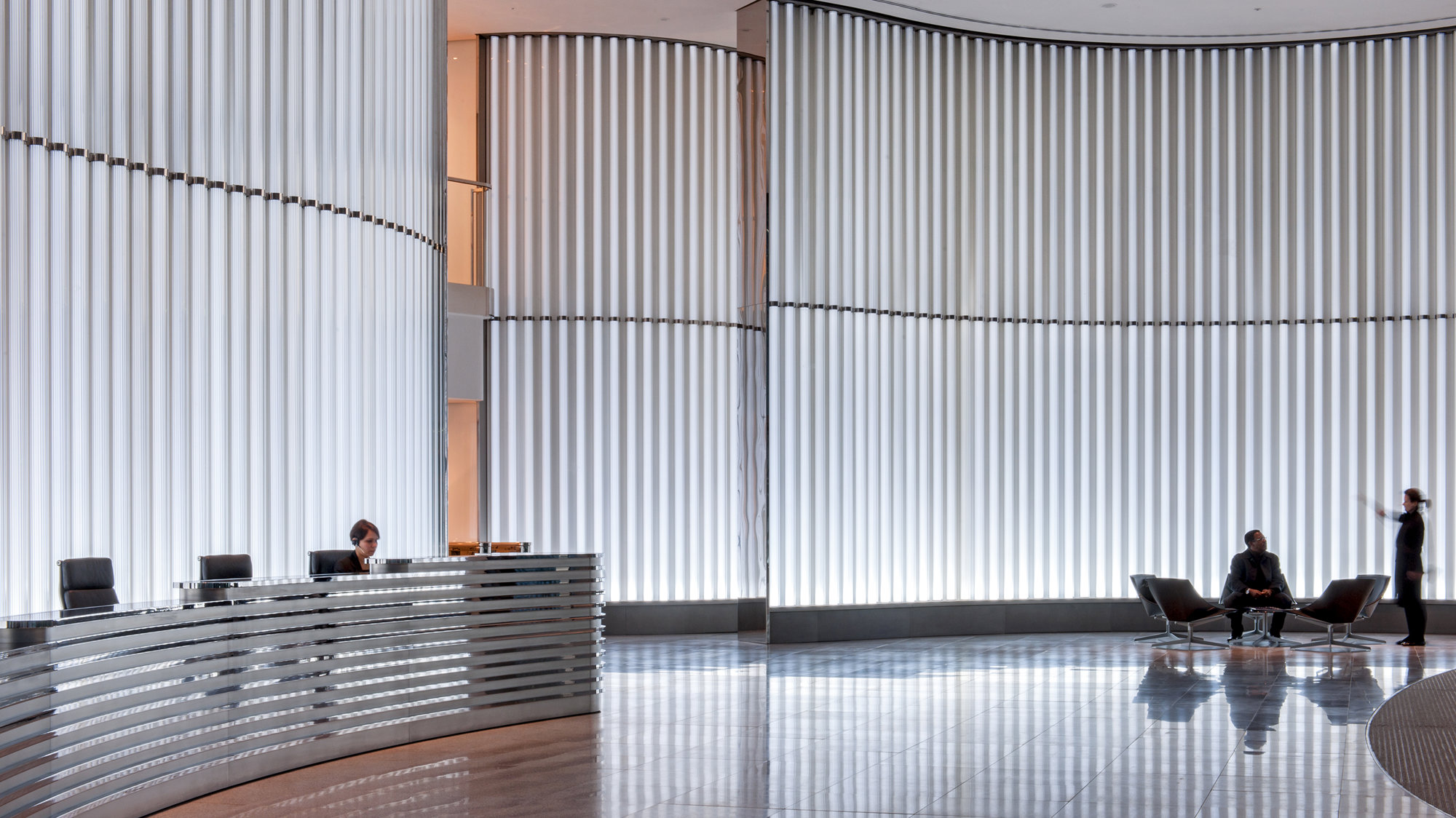 Intended as the headquarters building for a major corporation, the building establishes a distinctive presence while respecting the scale of the neighbouring buildings. The line of the facade follows the curve of Walbrook, the processional route that runs alongside Mansion House, while a setback at the fifth floor aligns with the cornice of St Stephen Walbrook. The facade is articulated as a series of bays, which refer to the domestic scale of the buildings that originally stood here and have the effect of extending the site boundary to optimise the plan area. While the scheme's massing is determined by the historical fabric of the city, the horizontal bands of reflective brise soleil are a contemporary statement in an area where planning guidance has traditionally favoured the use of stone. Made of a glass-fibre-reinforced polymer - a material more commonly used in the bodywork of cars - the louvres wrap the entire building, unifying the main volume with the receding upper levels, so that from the street the facade appears as a continuous arc.