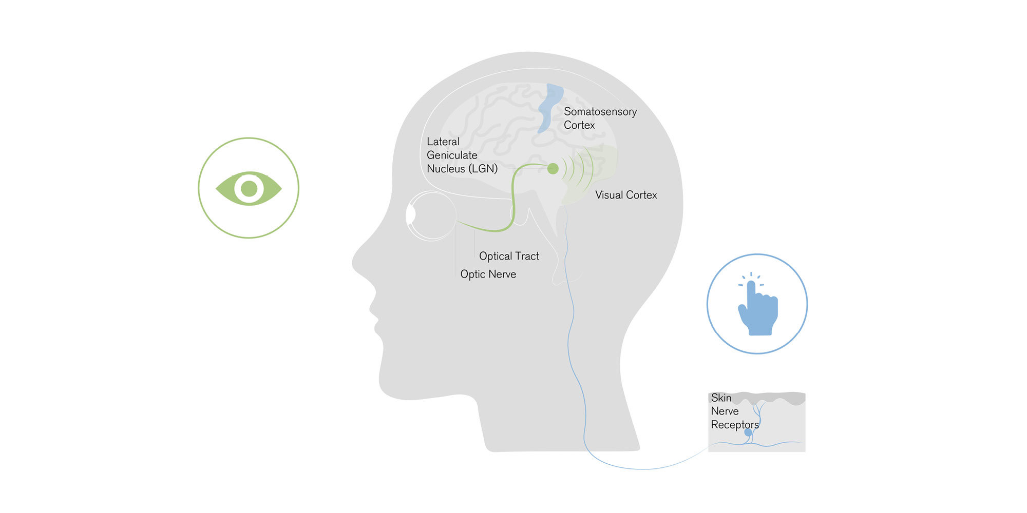 Part of the sensorimotor system showing how what we see reaches the lateral geniculate nucleus at the back of our brain in a region called the visual cortex; and the information about what we touch passes through our skin and its receptors until it reaches the brain’s somatosensory cortex. © Foster + Partners