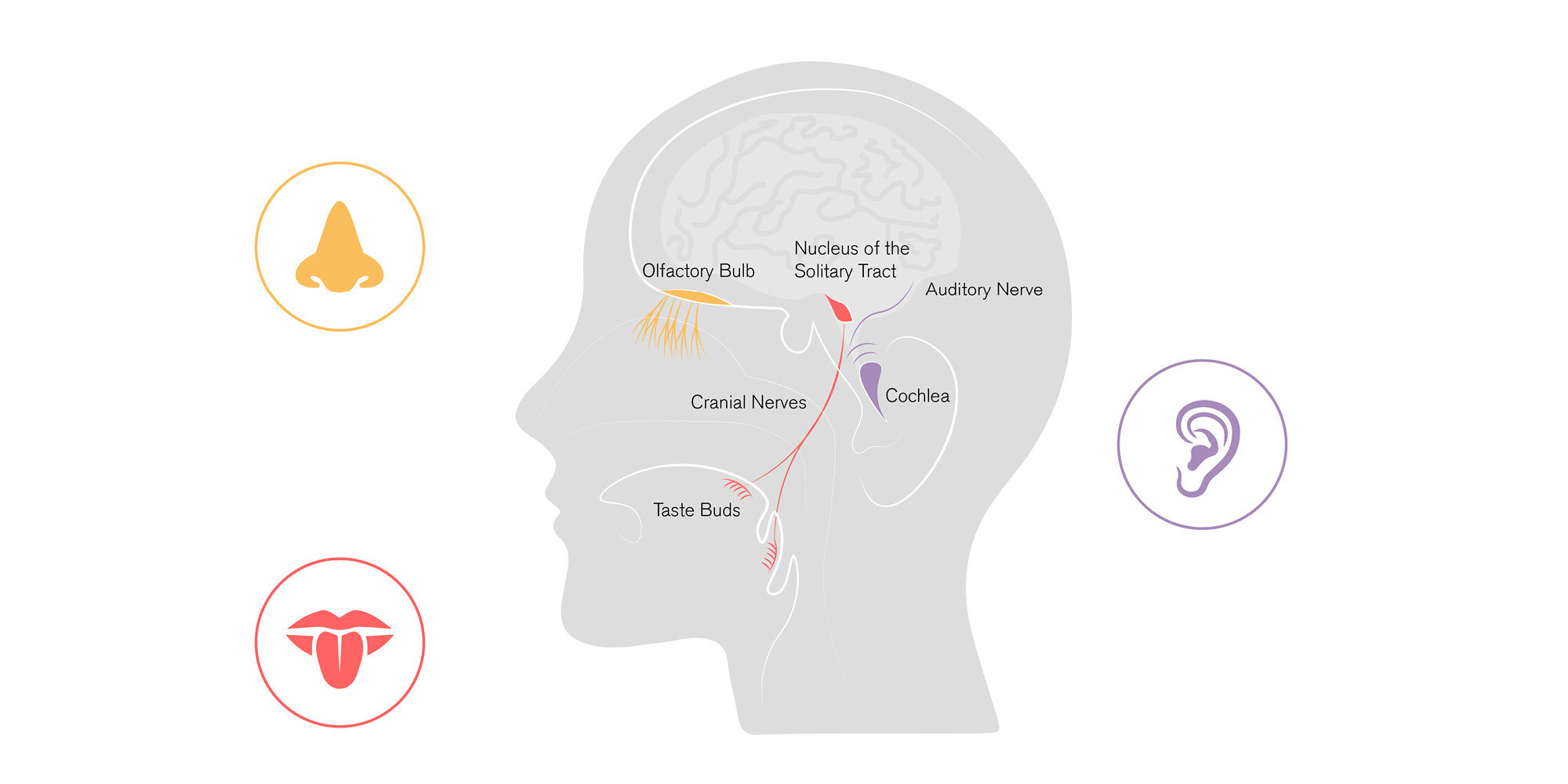 Part of the sensorimotor system showing how what we smell travels along the olfactory bulb and reaches internal areas of the brain; what we taste passes through the cranial nerves and the nucleus of the solitary tract; and what we hear reaches our brain passing through the cochlea and the auditory nerve. © Foster + Partners