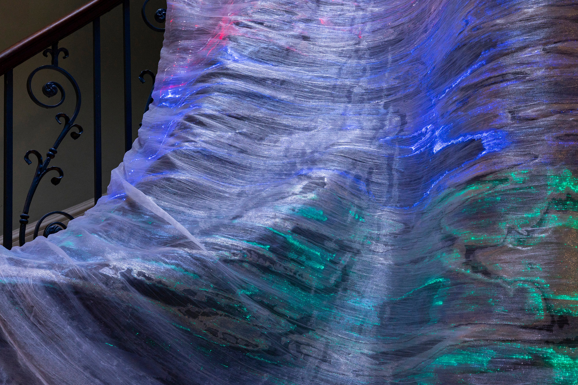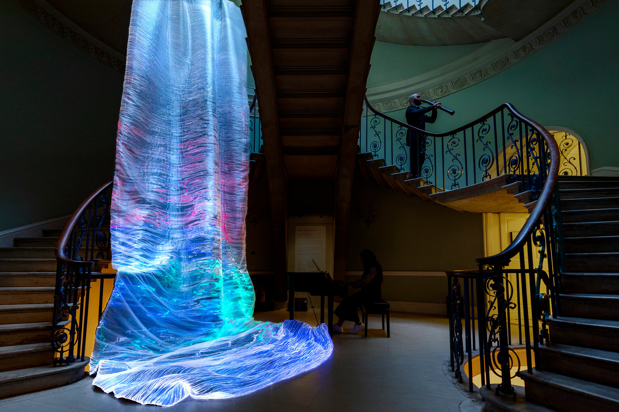 The installation was a spectacular textile waterfall set against the backdrop of the Nelson Stair at Somerset House, designed in a Neo-Palladian style by the Swedish-Scottish architect Sir William Chambers. Visitors were invited to listen to music while wearing an EEG (electroencephalogram) headset that recorded their brain waves and visually translated them in colour and in light onto the fabric installation. They were also translated into live-generated natural sounds, like birdsong or flowing rivers, to promote relaxation through multisensory engagement.
