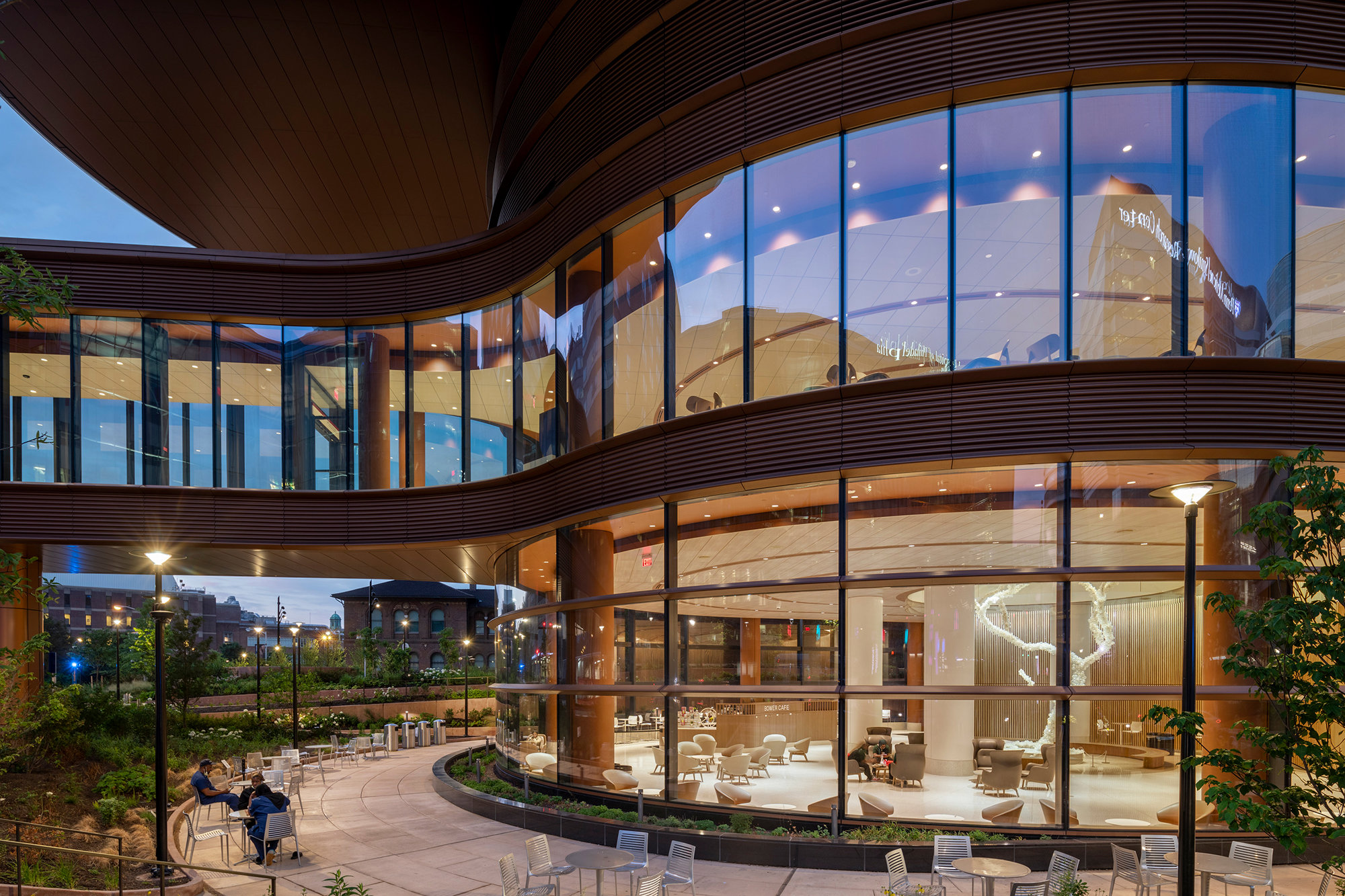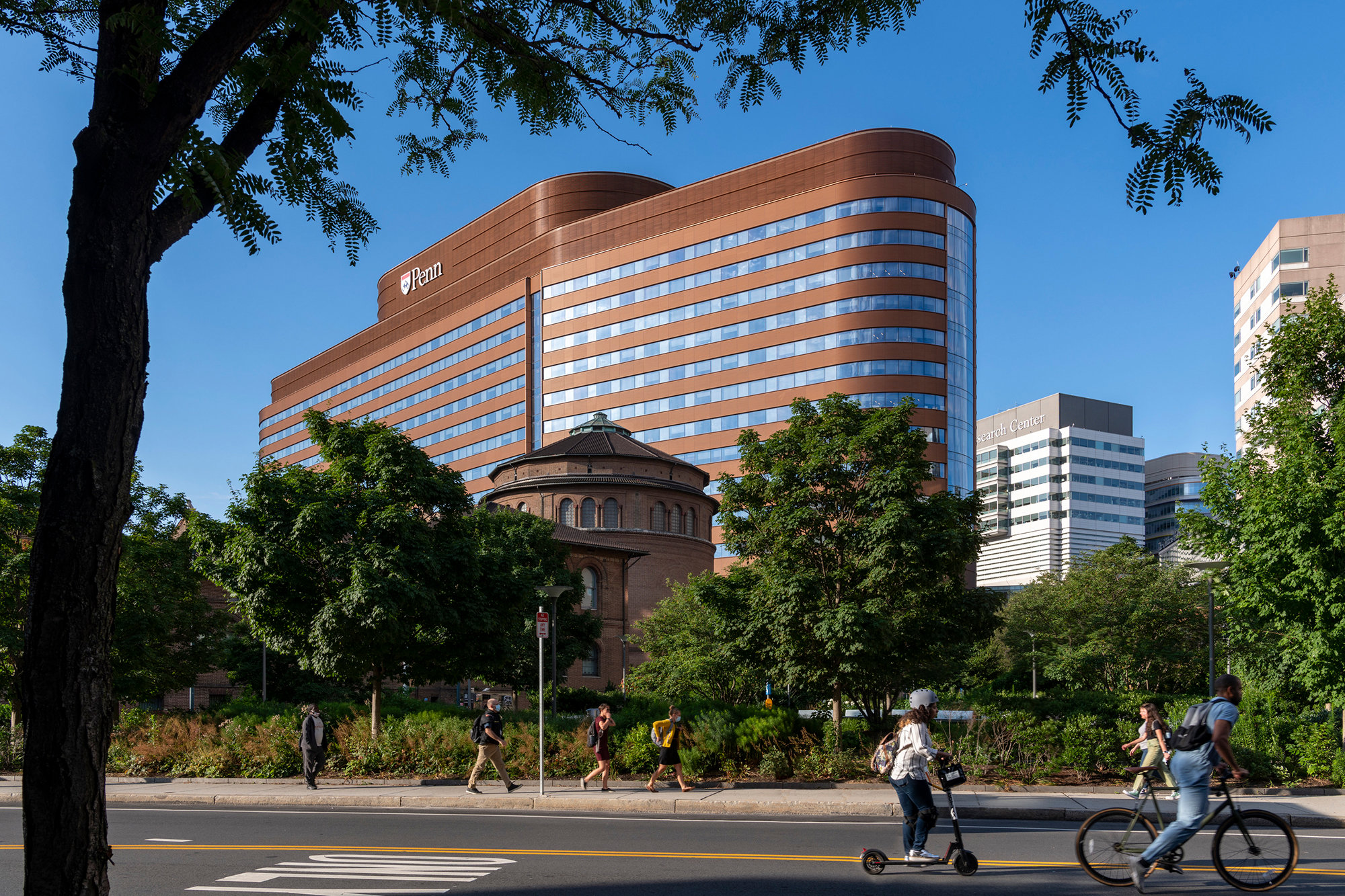 Penn Patient Pavilion, University of Pennsylvania. The Pavilion was designed with the nearby Penn Museum in mind, adopting a curved exterior that respects the existing urban architecture. A pedestrianised route to the train station was also formed as part of a broader urban plan that connected the Pavilion with the surrounding area. © Nigel Young / Foster + Partners