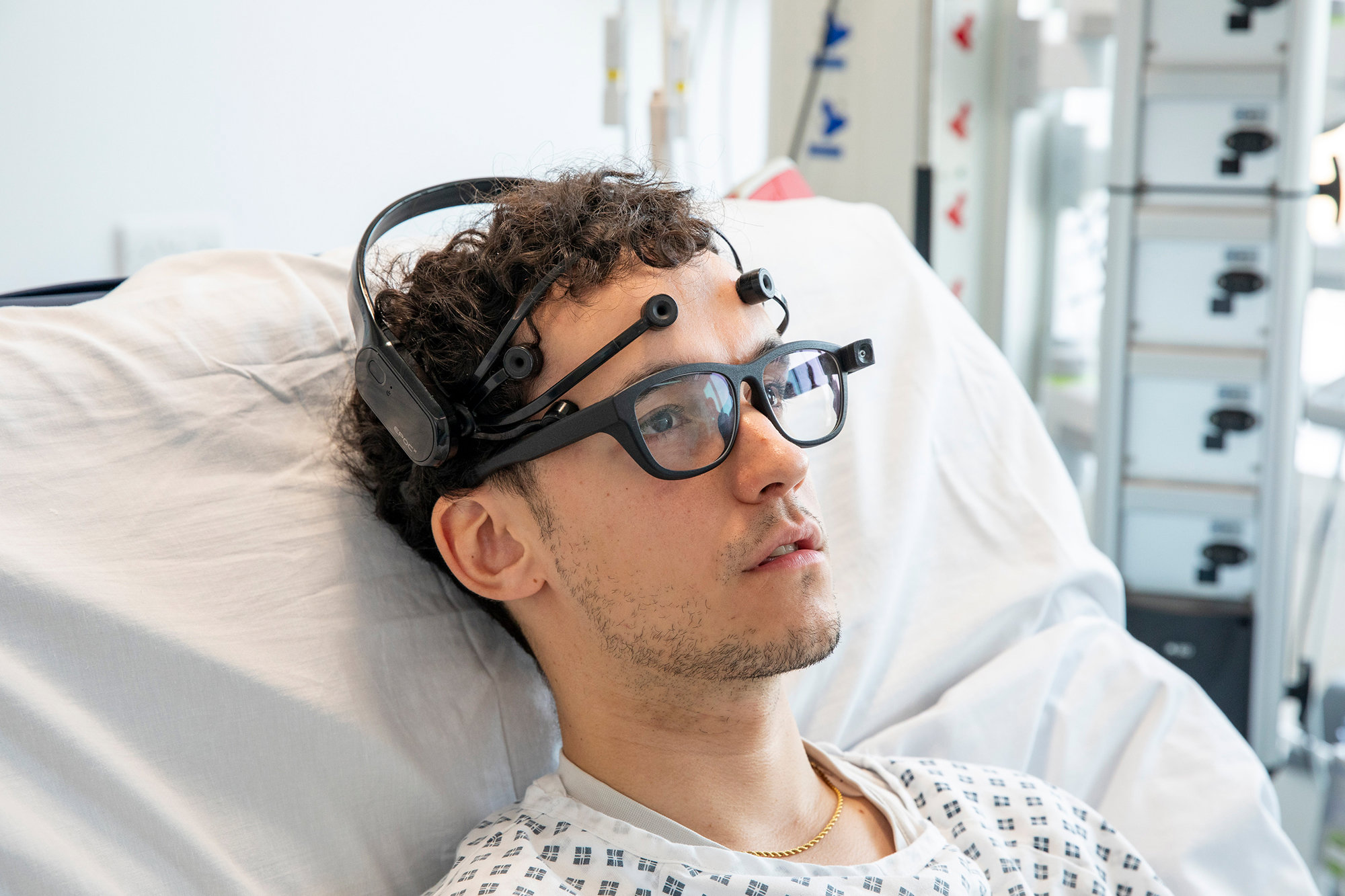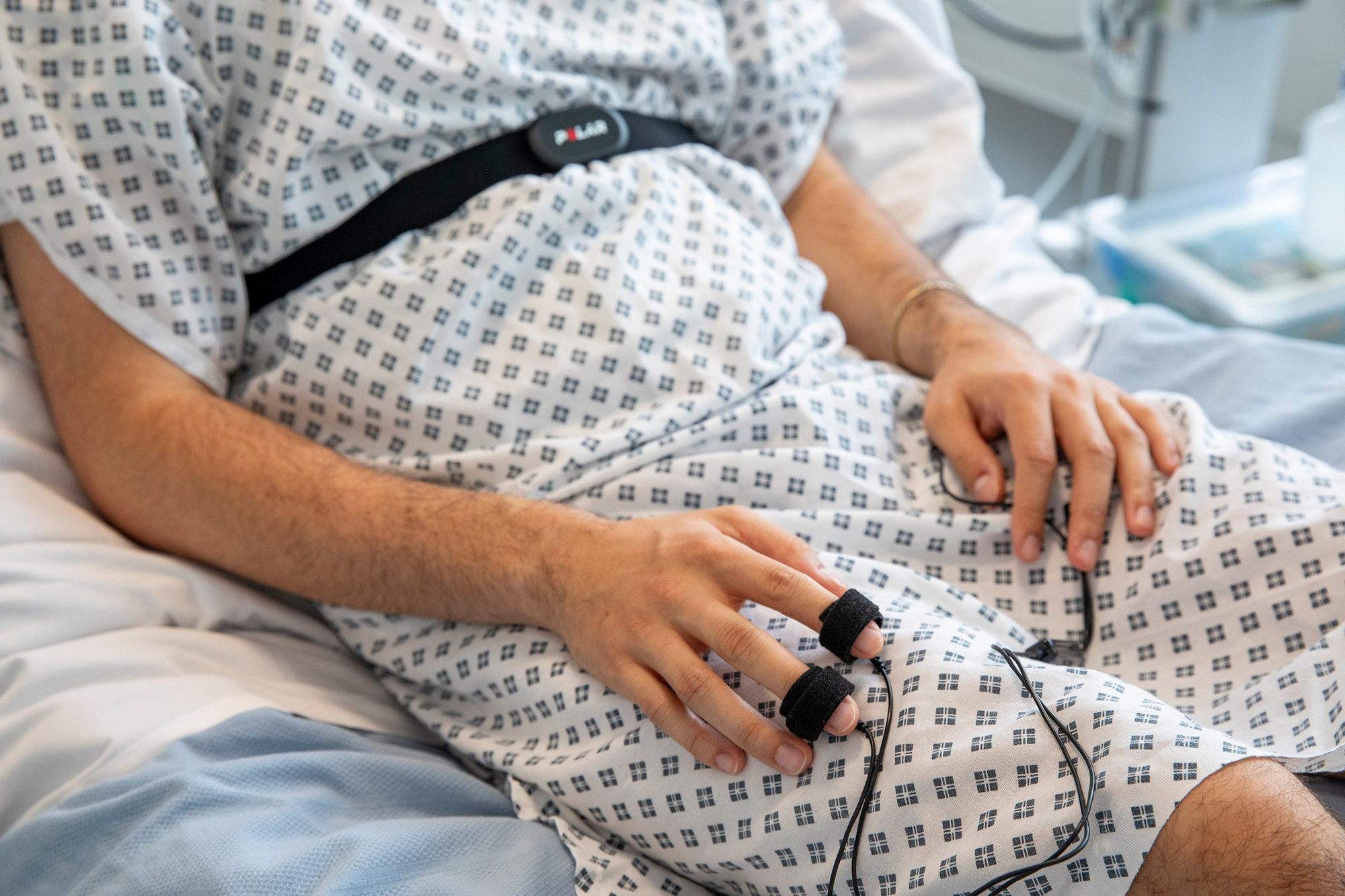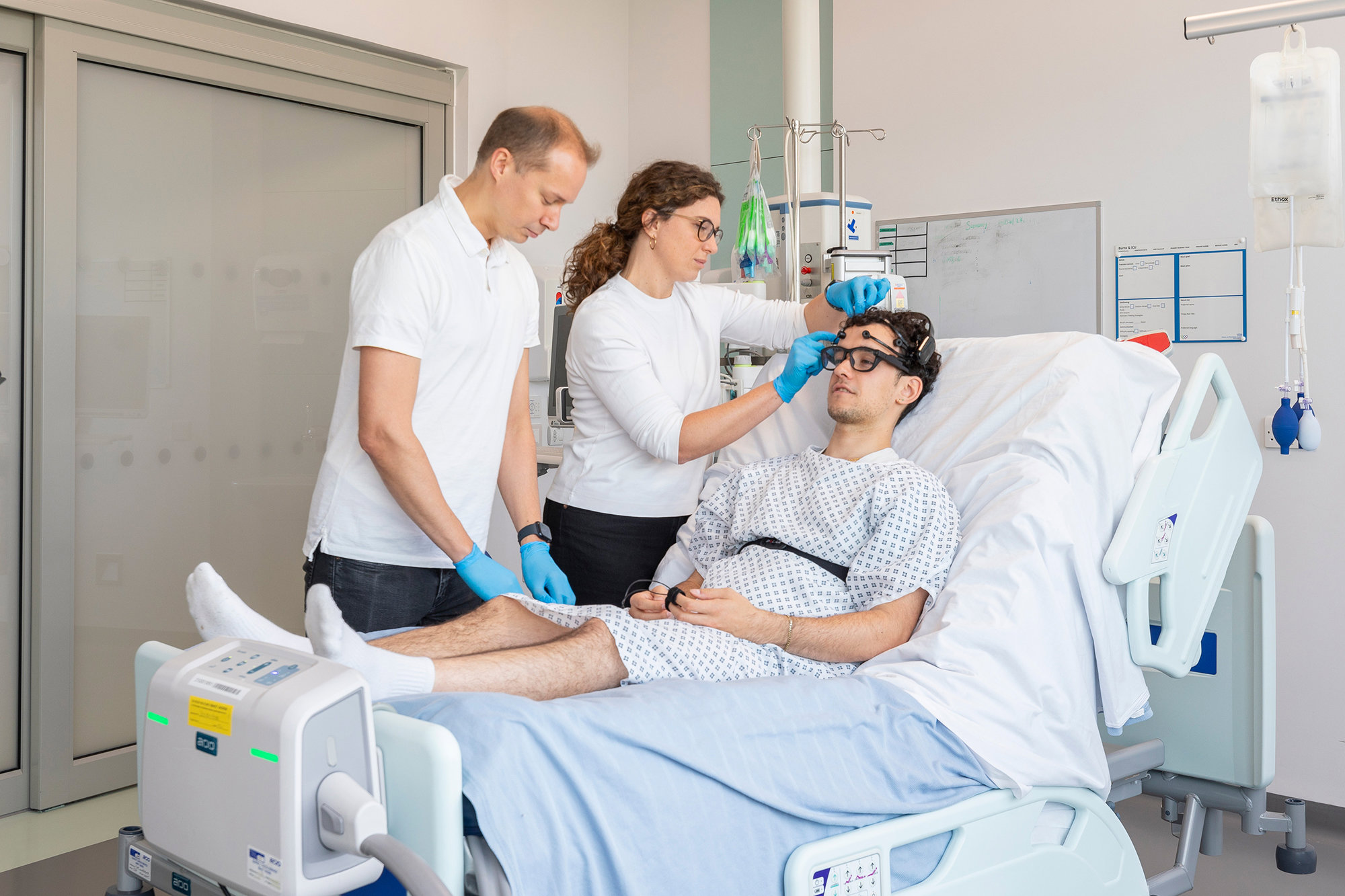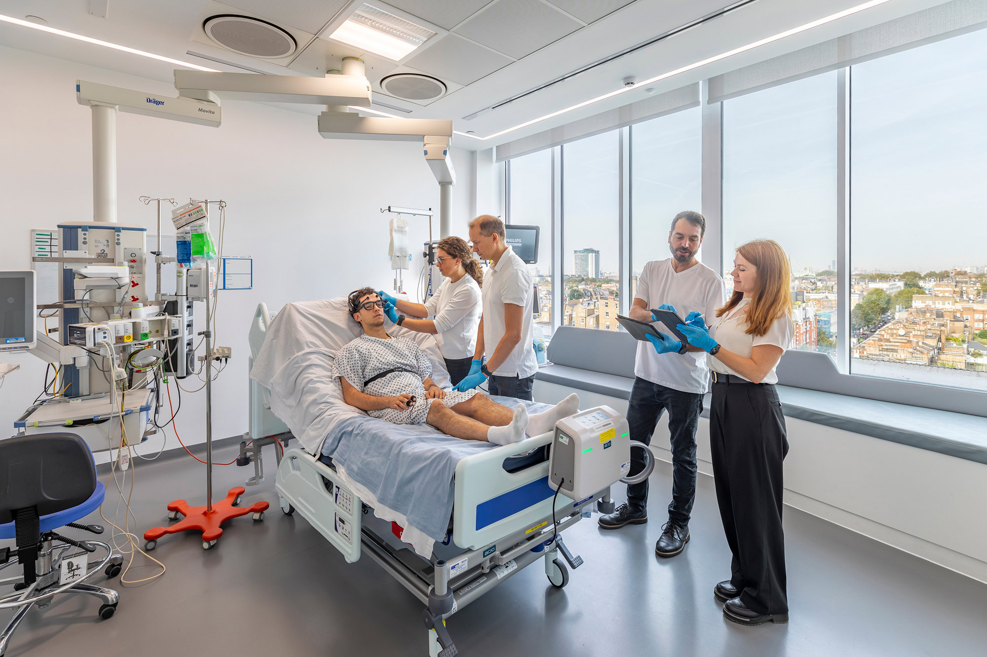 Images of the patient room used for the study in Chelsea and Westminster Hospital. The ‘patient’ figure wears an electroencephalogram device (EEG) on their head, eye-tracking glasses, a heart rate variability monitor (HRV) on their chest, and an electrodermal activity sensor (EAS) on their fingers. © Aaron Hargreaves / Foster + Partners