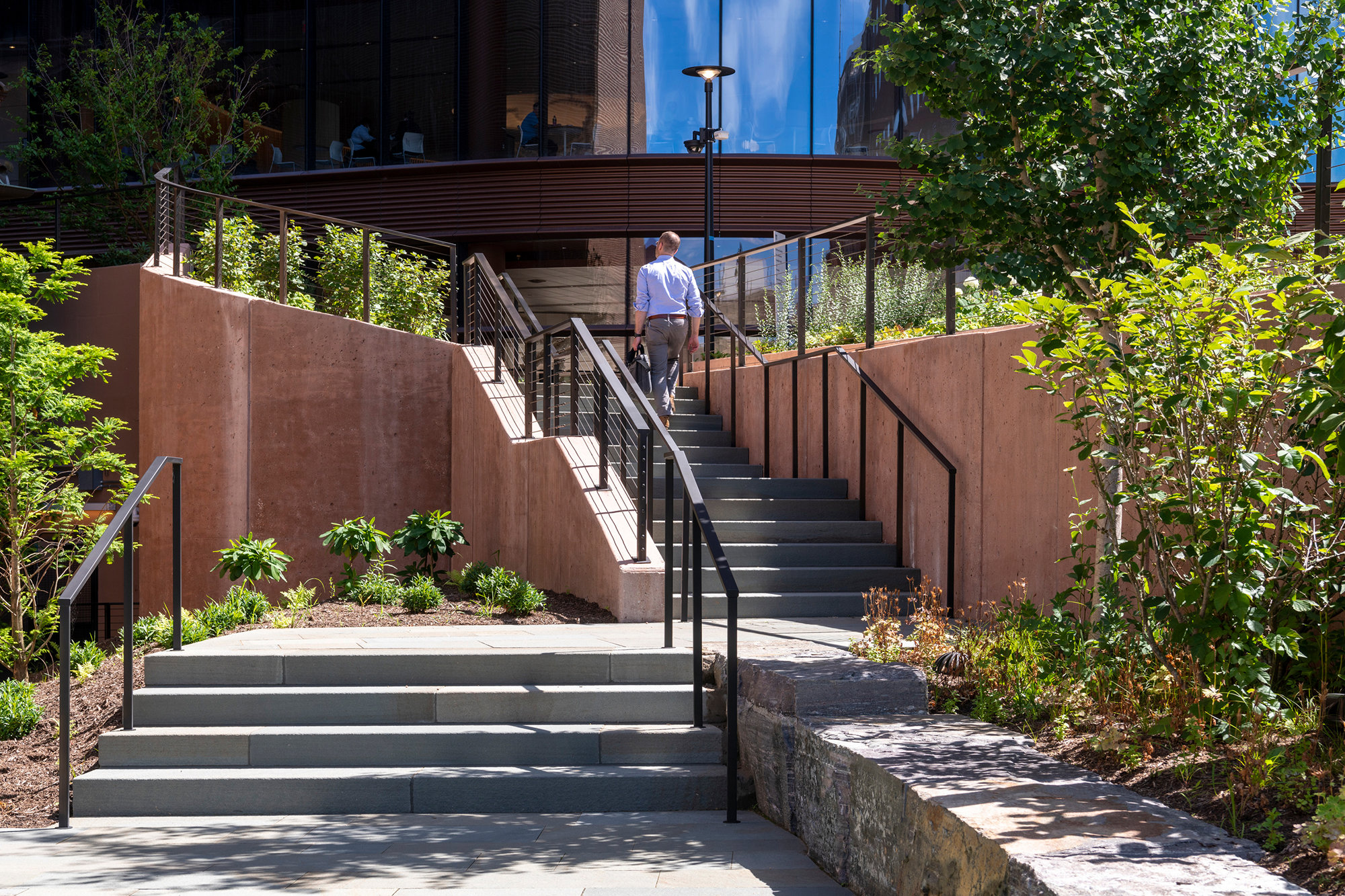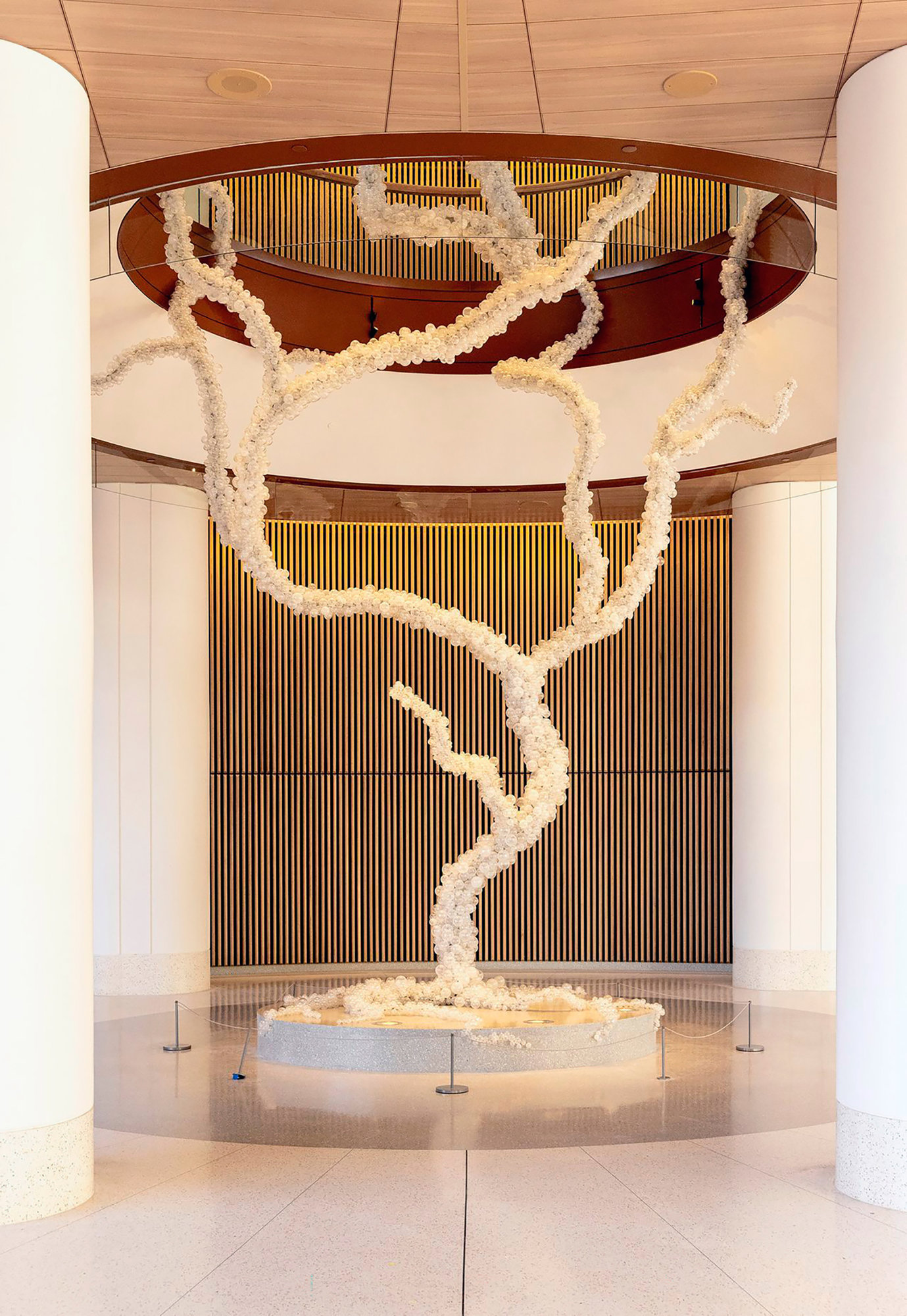 As well as designing in ways that reduce stress, and allow time and space to ‘gather, talk, or simply reflect,’ art also plays a noticeable role in Foster + Partners’ neuroarchitectural approach to design. Artworks are installed in the Penn Pavilion and serve as a vehicle for ‘transmitting cultural values and creating inclusivity,’ as Marcos Nadal and Chatterjee comment, making it quietly appropriate for a building within which people are asked to care for one another. American designer and sculptor Maya Lin’s Decoding the Tree of Life in the atrium of the building uses a spiralling form to communicate across disciplines. As Lin said: ‘I want to make you aware of your surroundings in the Pavilion, in this beacon of scientific advancement, connecting you to the physical and natural world around you while symbolizing the very essence of life – DNA.’
