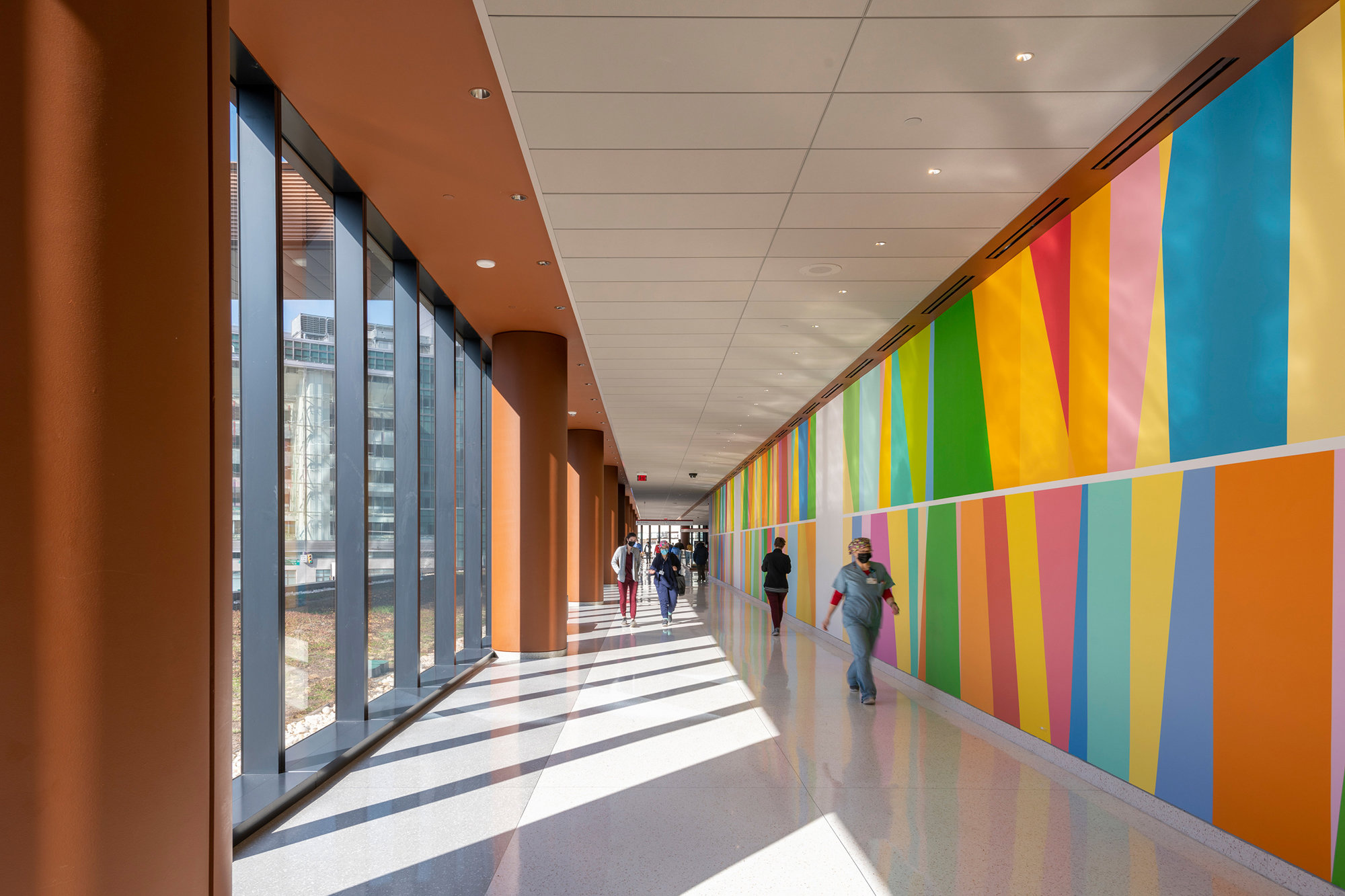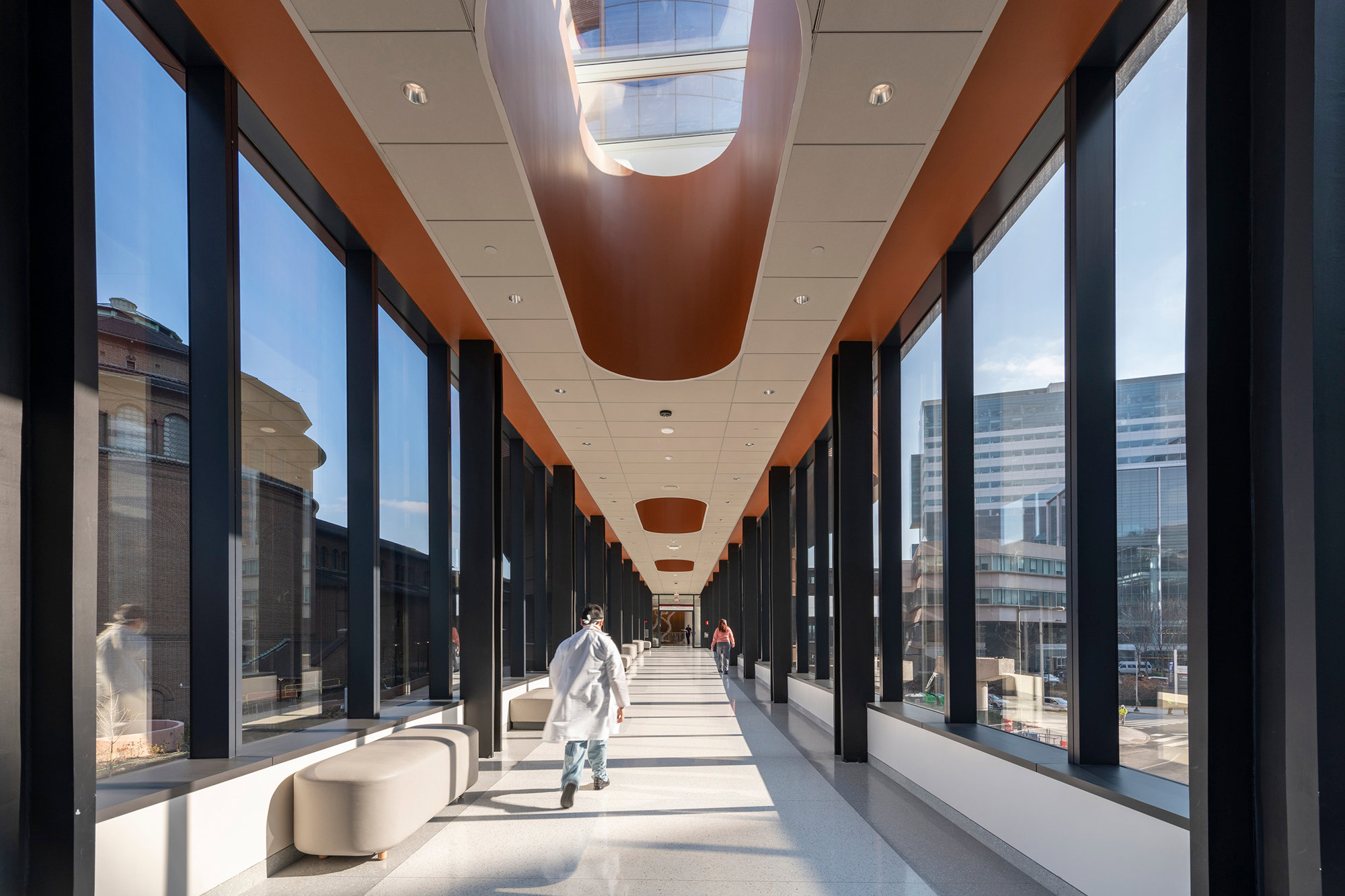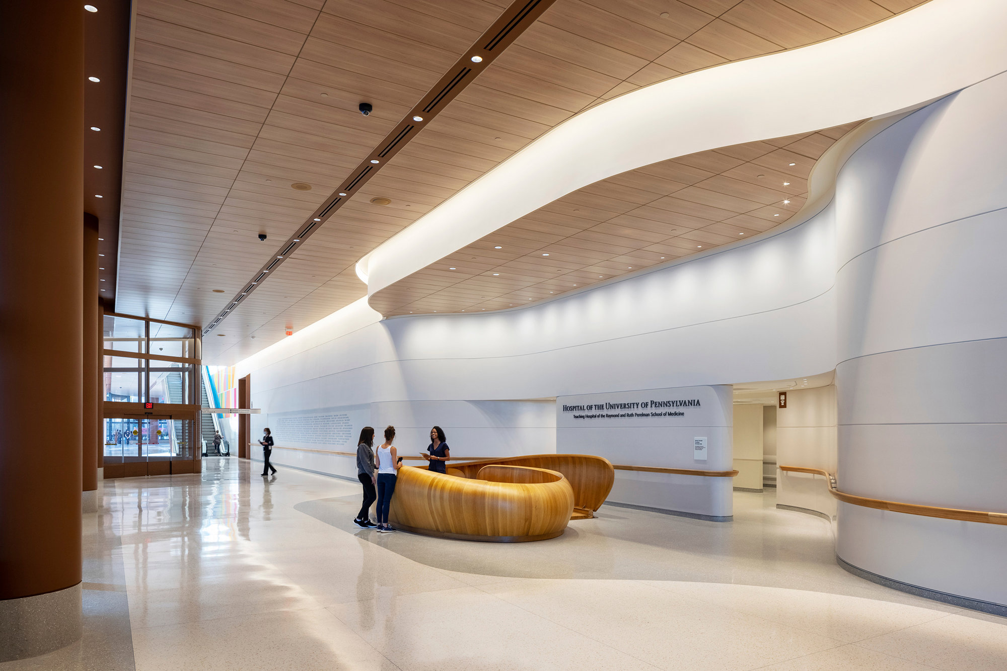 The Penn Pavilion accommodates an impressive, cutting-edge range of research and care facilities. Comprising 500 private patient rooms with adjustable acuity levels, from intensive care units to fundamental in-patient amenities, the facility offers ample space for patient families to stay overnight. The Pavilion’s design also connects the outside and inside by prioritising natural light and vistas for patients, visitors and staff. This contributes to a calming atmosphere, since constant artificial lighting can disrupt circadian rhythms, heightening stress and confusion.