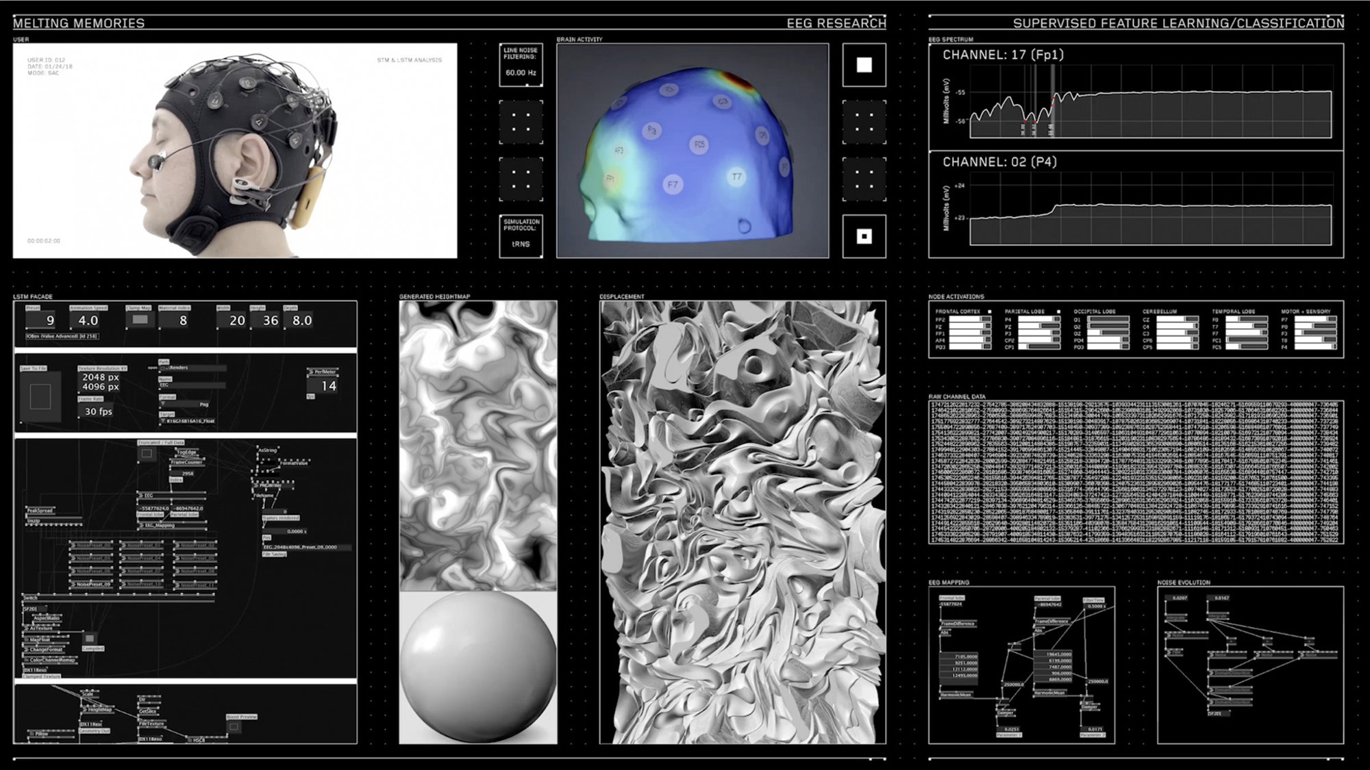 In Melting Memories, participants were instructed to focus on specific long-term memories during an EEG recording process. This data constitutes ‘the building blocks for the unique algorithms that the artist needs for the multi-dimensional visual structures on display.’