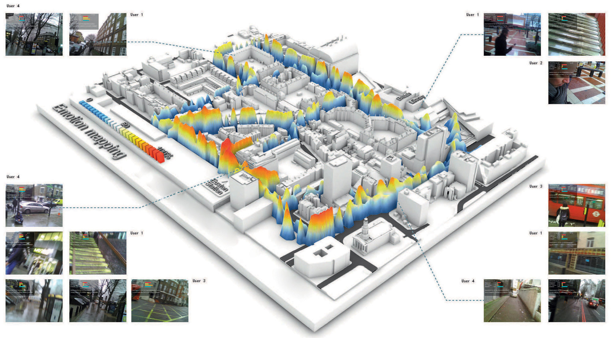 Participants’ stress, excitement and meditative levels were recorded using an EEG headset. These levels changed with the urban fabric, as people moved through crowded or confined areas into more open spaces.
