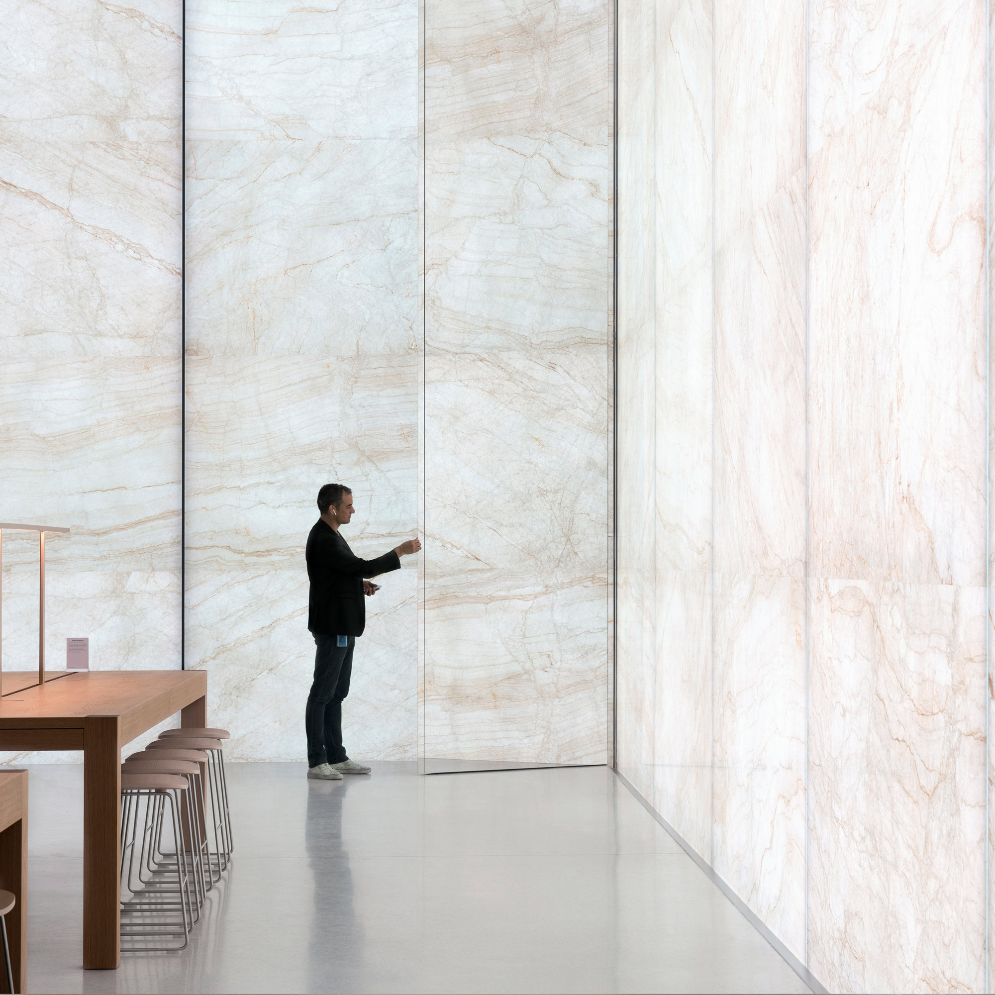 The store is conceptualized as a ‘paper lantern’ that glows mysteriously. Visitors entering the store are treated to a magical experience, surrounded by glowing stone panels that shimmer throughout the day as the sun brings them to life, while at night the cube radiates a warm glow, contrasting against the bright lights of Macau. The first-of-its-kind glass-stone composite façade comprises five layers of glass integrated with incredibly thin layers of stone, which gives the building its distinctive materiality – appearing as translucent stone walls, akin to stained-glass. The structural frame is supported by just three corner columns wrapped in mirrored stainless-steel that reflect the patterns and colors of the façade, dematerializing the structure and blending seamlessly with the surrounding environment.