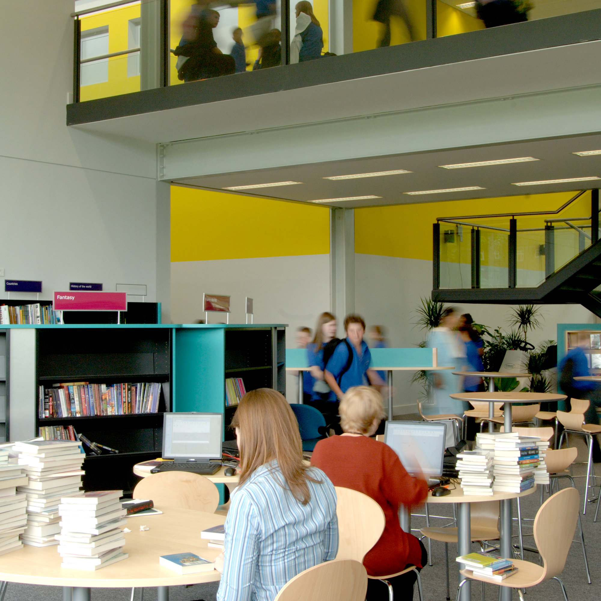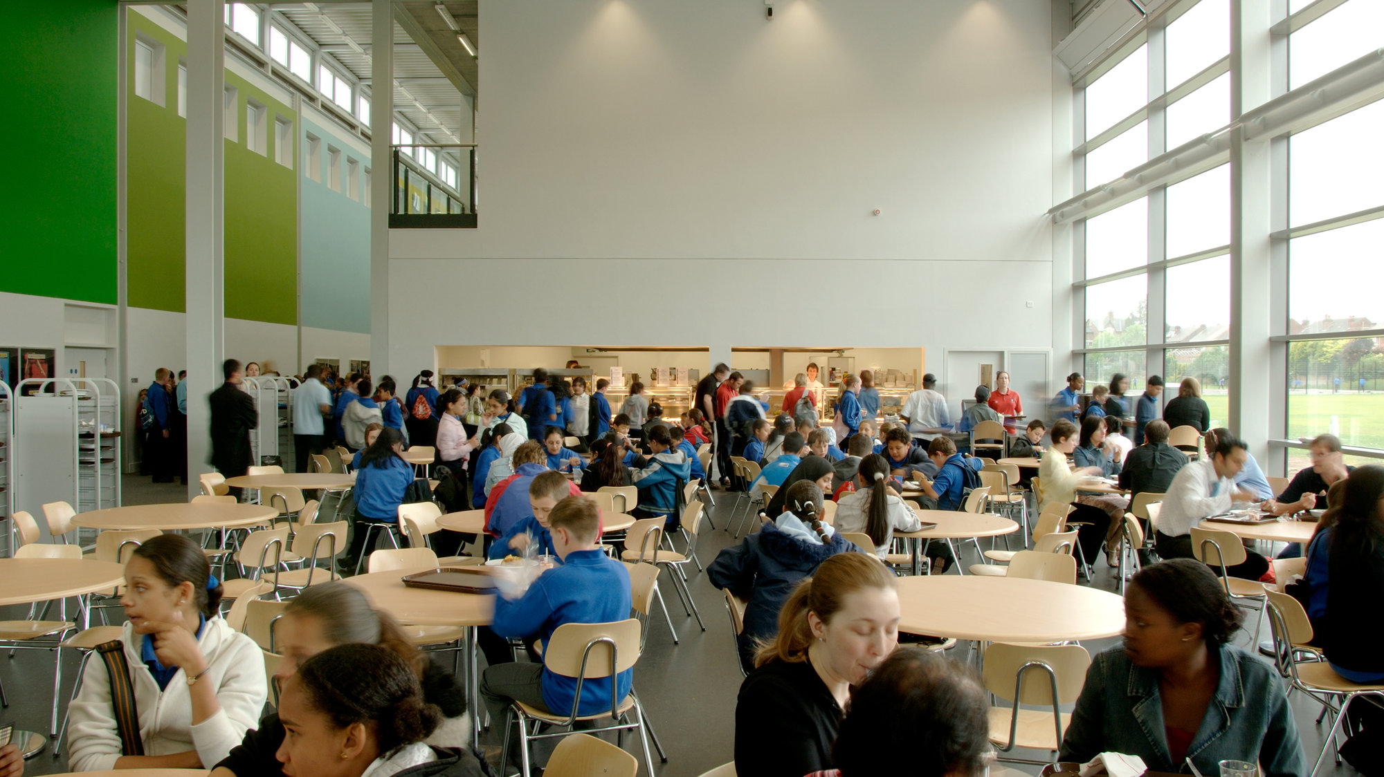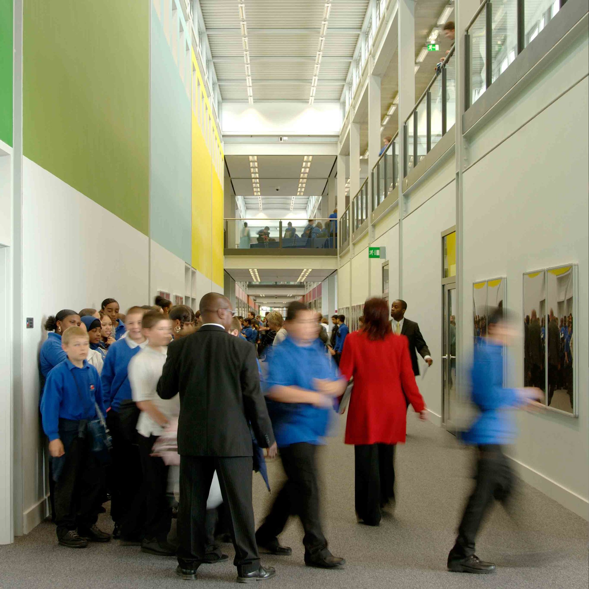 A simple rectangle on plan, the teaching spaces extend from a long central atrium, bounded at each end by double-height spaces, containing a restaurant, entrance hall, library and internet café. Breaking down the scale of the Academy into three ‘houses’, the elevated balconies define self-contained units, each with its own resource area and staff room. The theatre and sports facilities are grouped together in the east of the building, away from the teaching areas, to allow easy out-of-hours use by the local community. Classroom doors are glazed and an installation of coloured panels by artist, Sophie Smallhorn runs through the main circulation route, between each structural bay. The steel frame encloses a glass facade and internal walls are non load-bearing, so can be moved in future to suit changing requirements.