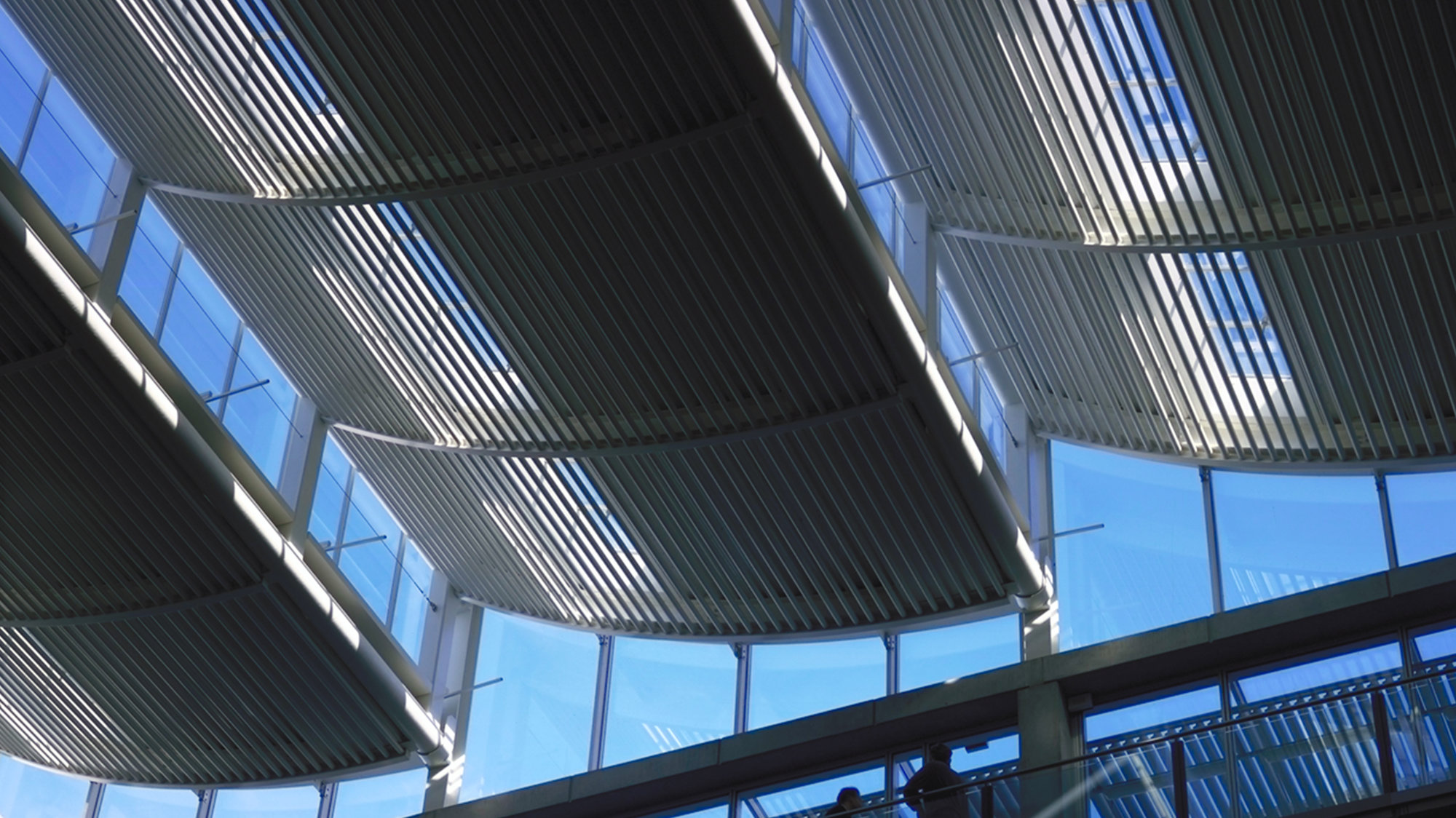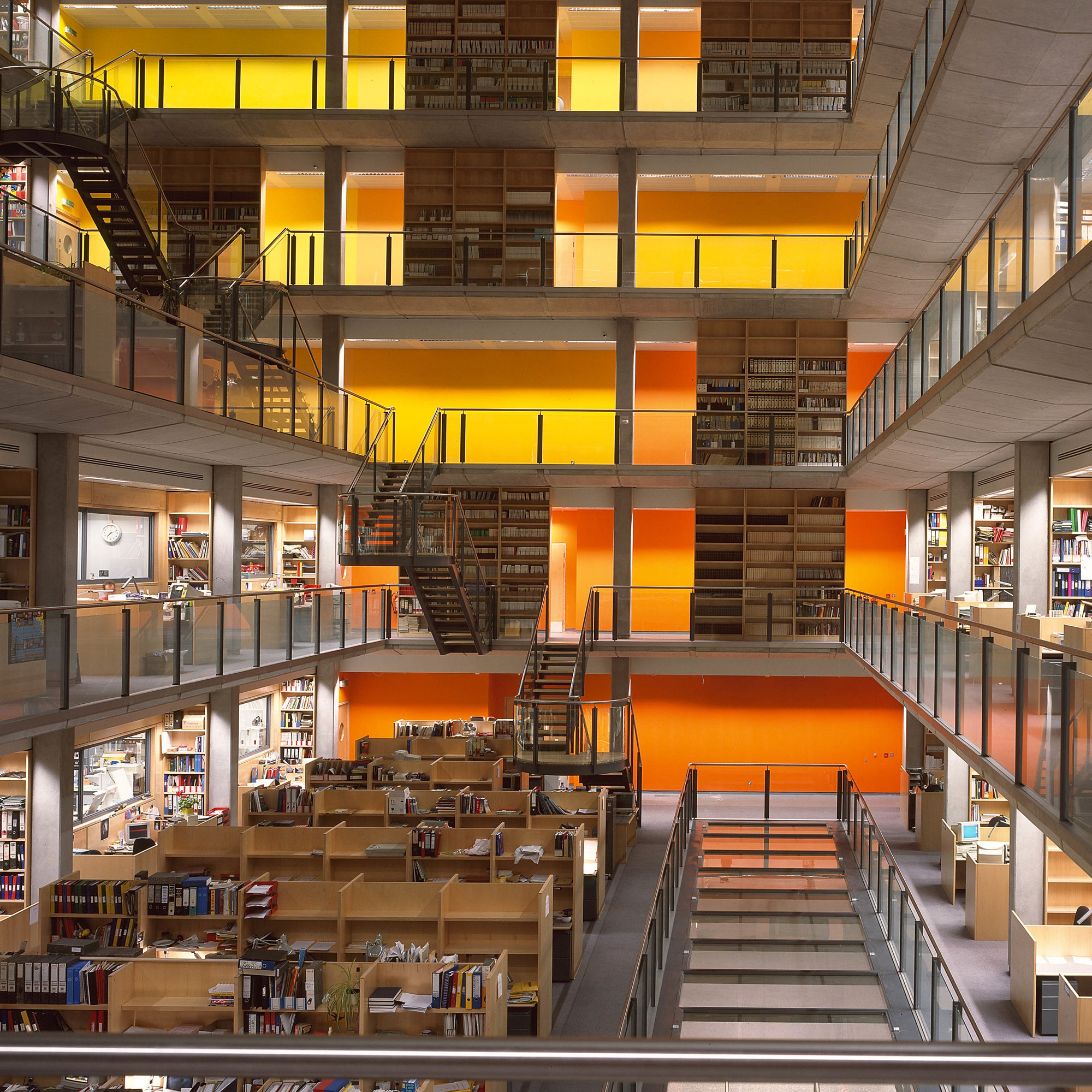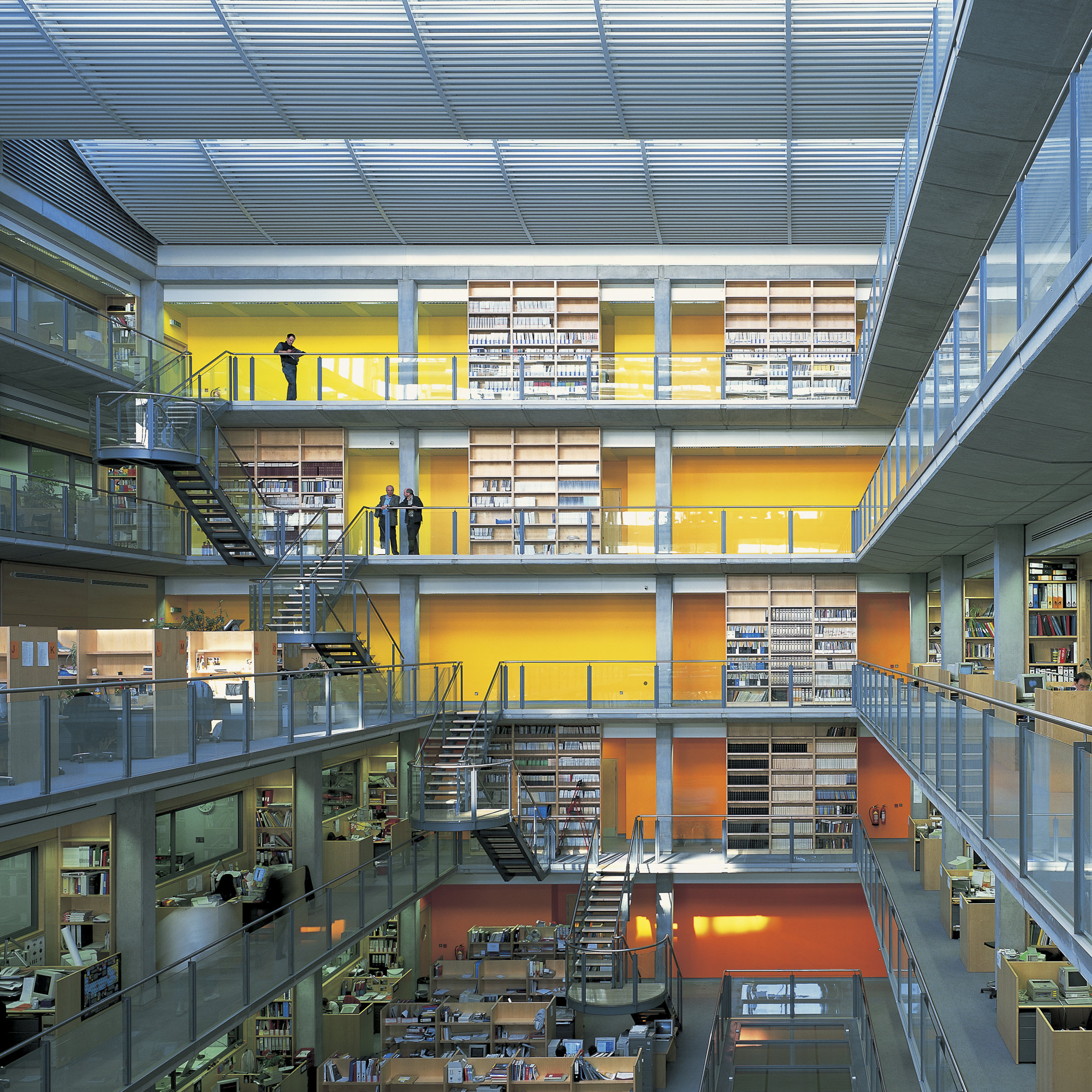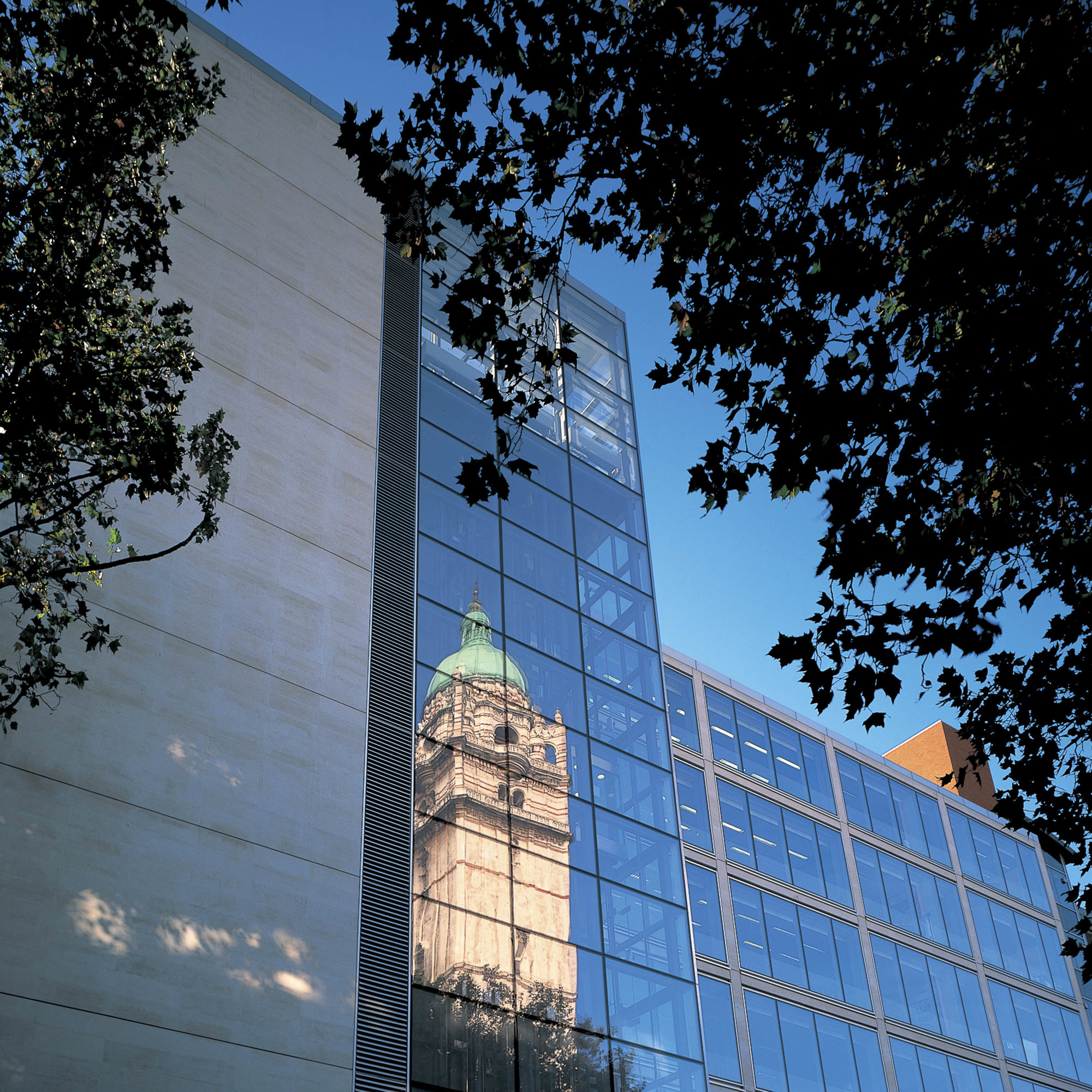 The forum widens as it rises, forming open-plan terraces for research students on the second and fourth floors, where the perimeter is lined with study carrels. Sculpted rooflights introduce a combination of north light for optimum working conditions and controlled sunlight to bring sparkle into the building. Fully glazed at its northern end - the site’s only open aspect - the forum looks onto the Queen’s Lawn and Queen’s Tower, the last fragment of the 1890s campus.