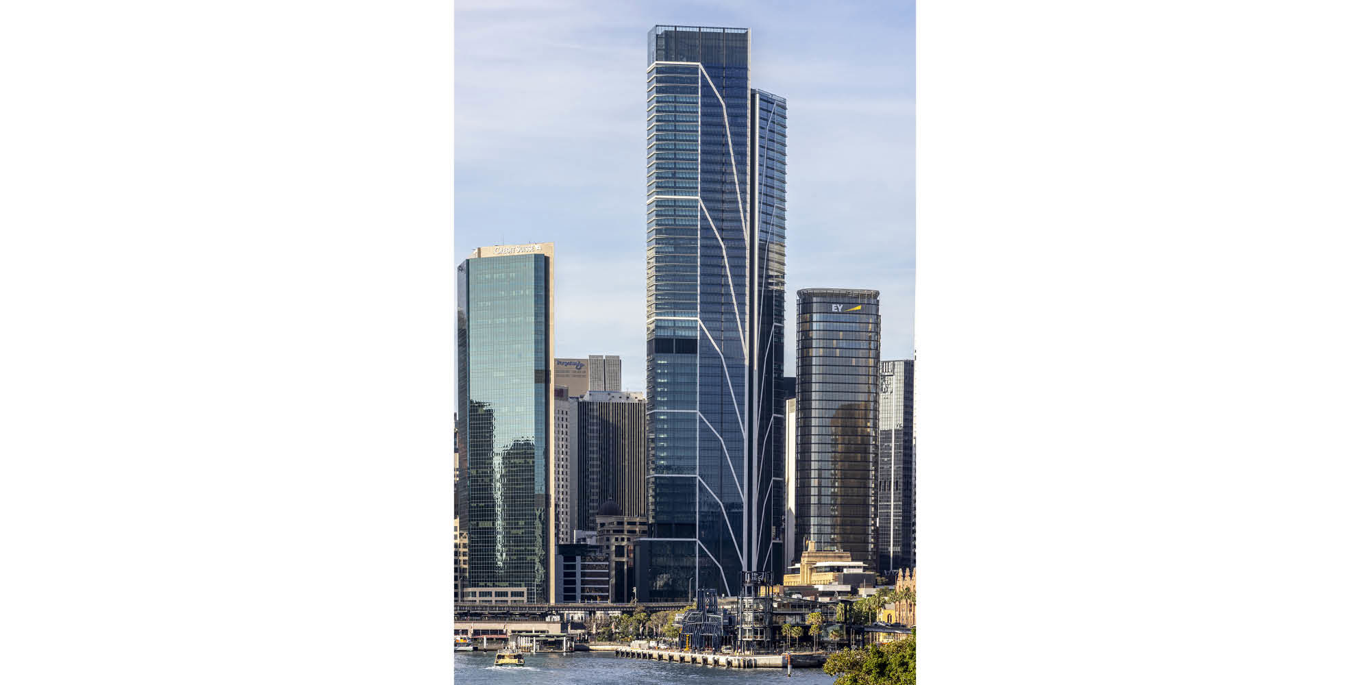 The tower makes a distinctive contribution to Sydney’s skyline with its innovative façade – a series of external cross-braces derived from structural stress diagrams. The south façade is broken into three bays with the concrete cores 'book-ending' the three transparent banks of lifts that animate the façade. The entire elevation is vertically articulated to modulate its visual impact on the skyline. The expressed structure also allows flexibility in interior layouts with the core offset to one side.