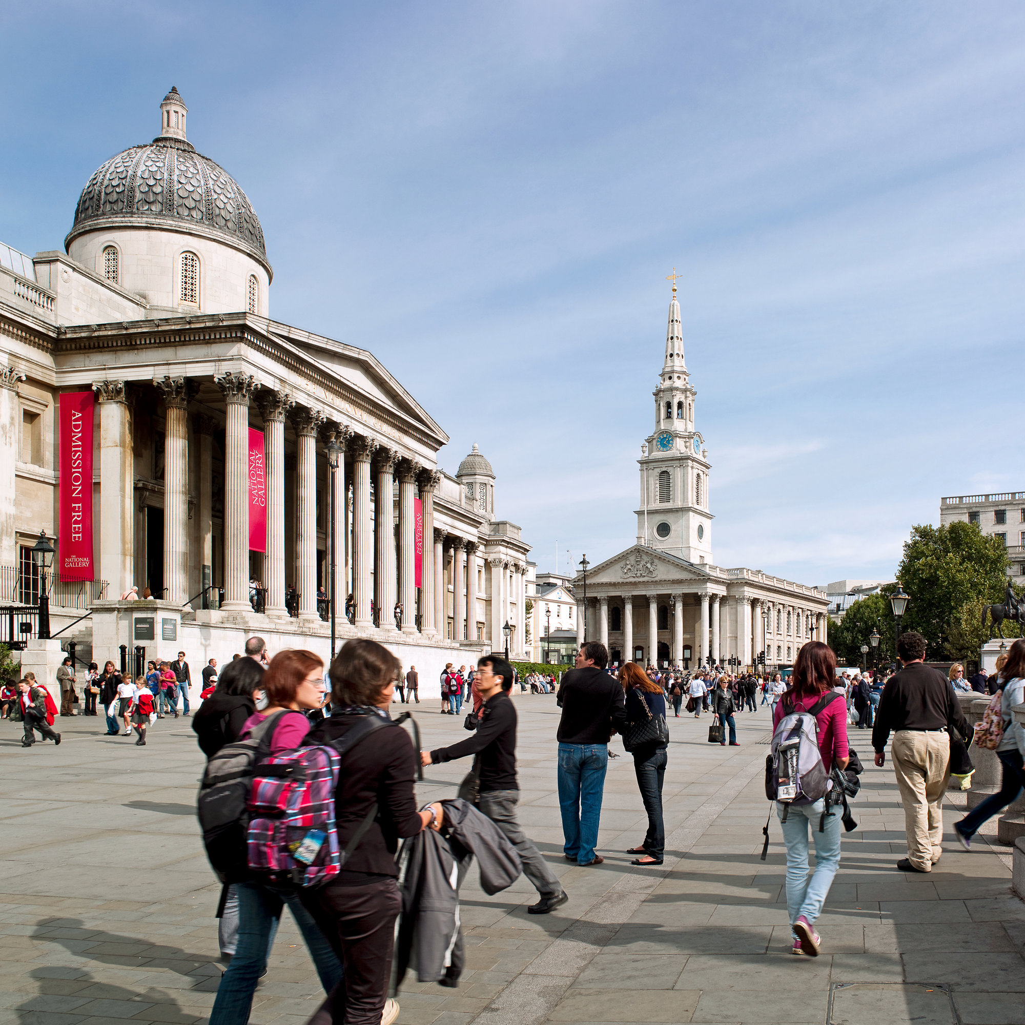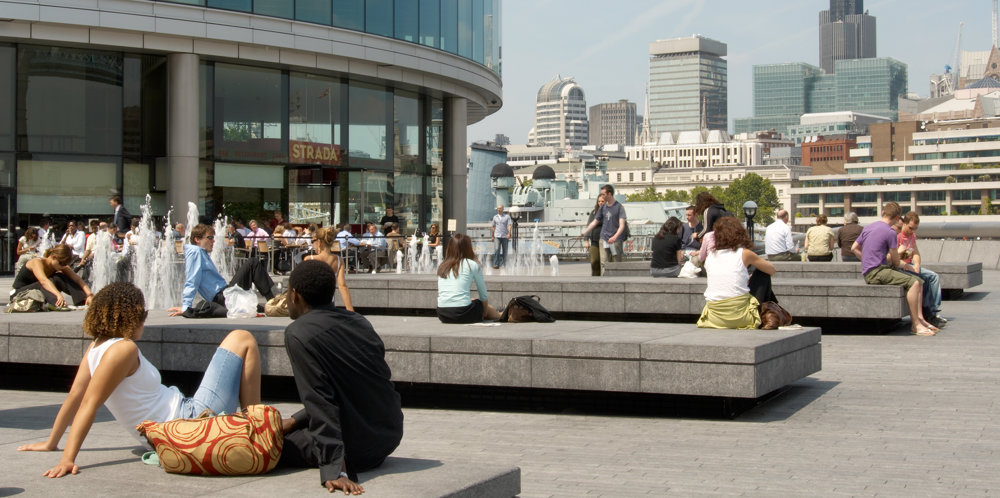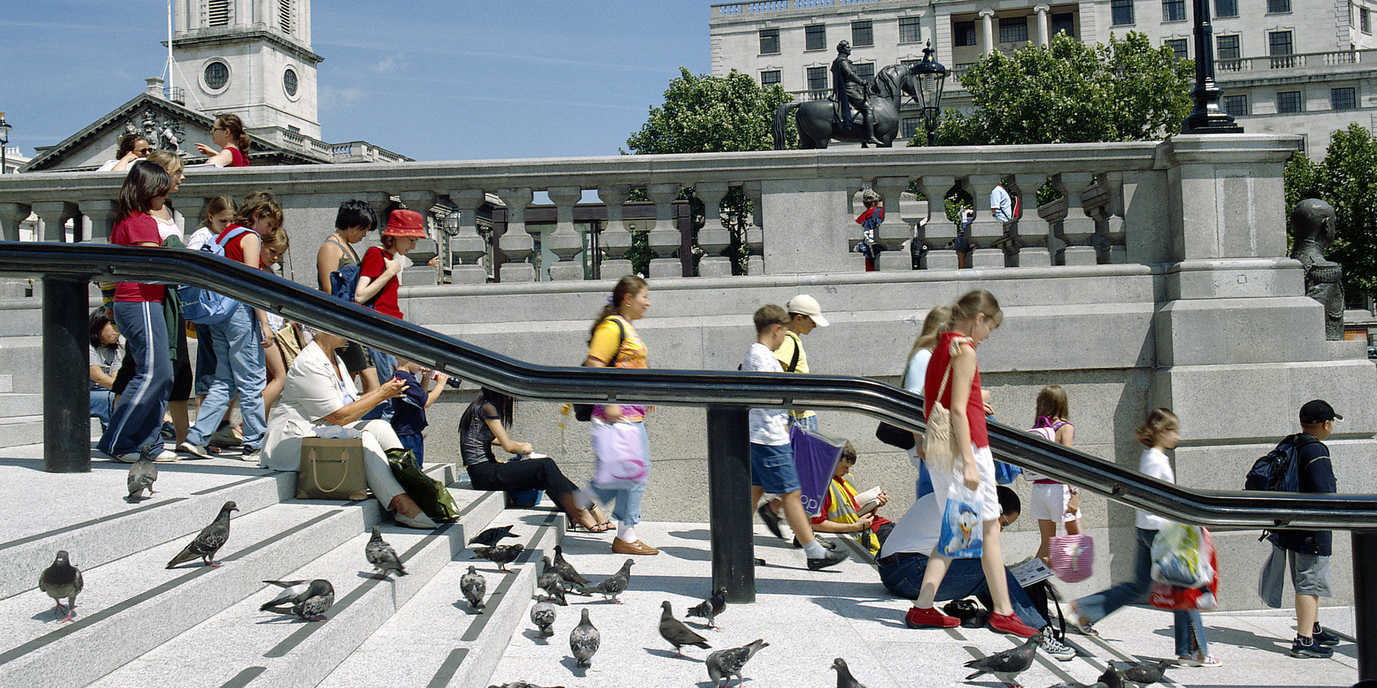 Trafalgar Square was laid out in the 1840s by Charles Barry. Dominated by Nelson’s Column, it is lined by fine buildings, including the church of St Martin-in-the-Fields and South Africa House to the east, Canada House to the west, and the National Gallery to the north. Yet, despite its grandeur, by the mid-1990s, the square had become choked by traffic, the central area visited only by those willing to risk life and limb. There was an obvious need and support for change. Proposals were developed after consultations involving 180 separate institutions and thousands of individuals. The most significant move was the closure of the north side of the Square to traffic and the creation of a broad new terrace, which forms an appropriate setting for the National Gallery and links it via a flight of steps to the body of the square. Below the terrace, a new café with outdoor seating provides a much-needed visitor amenity.