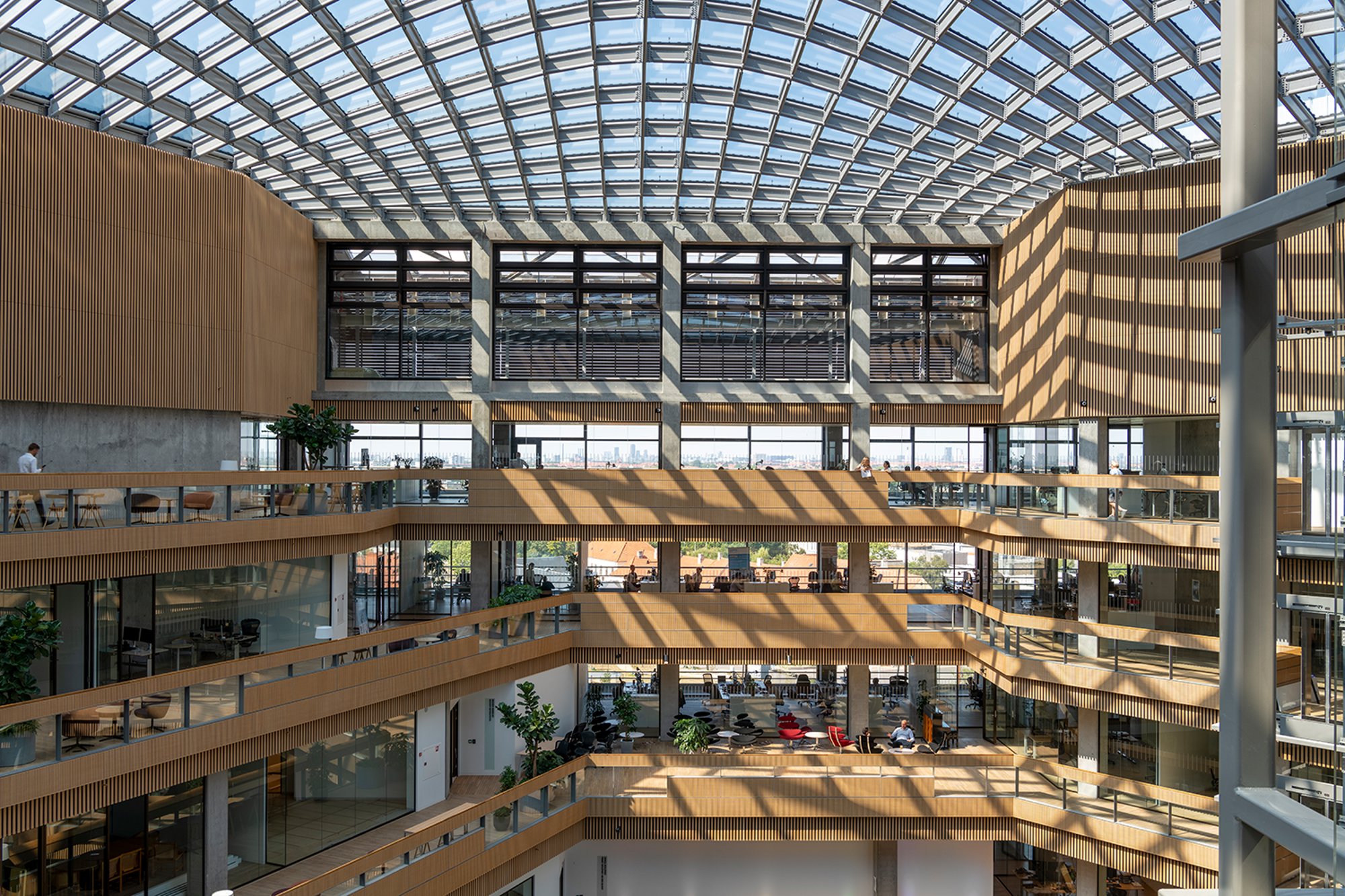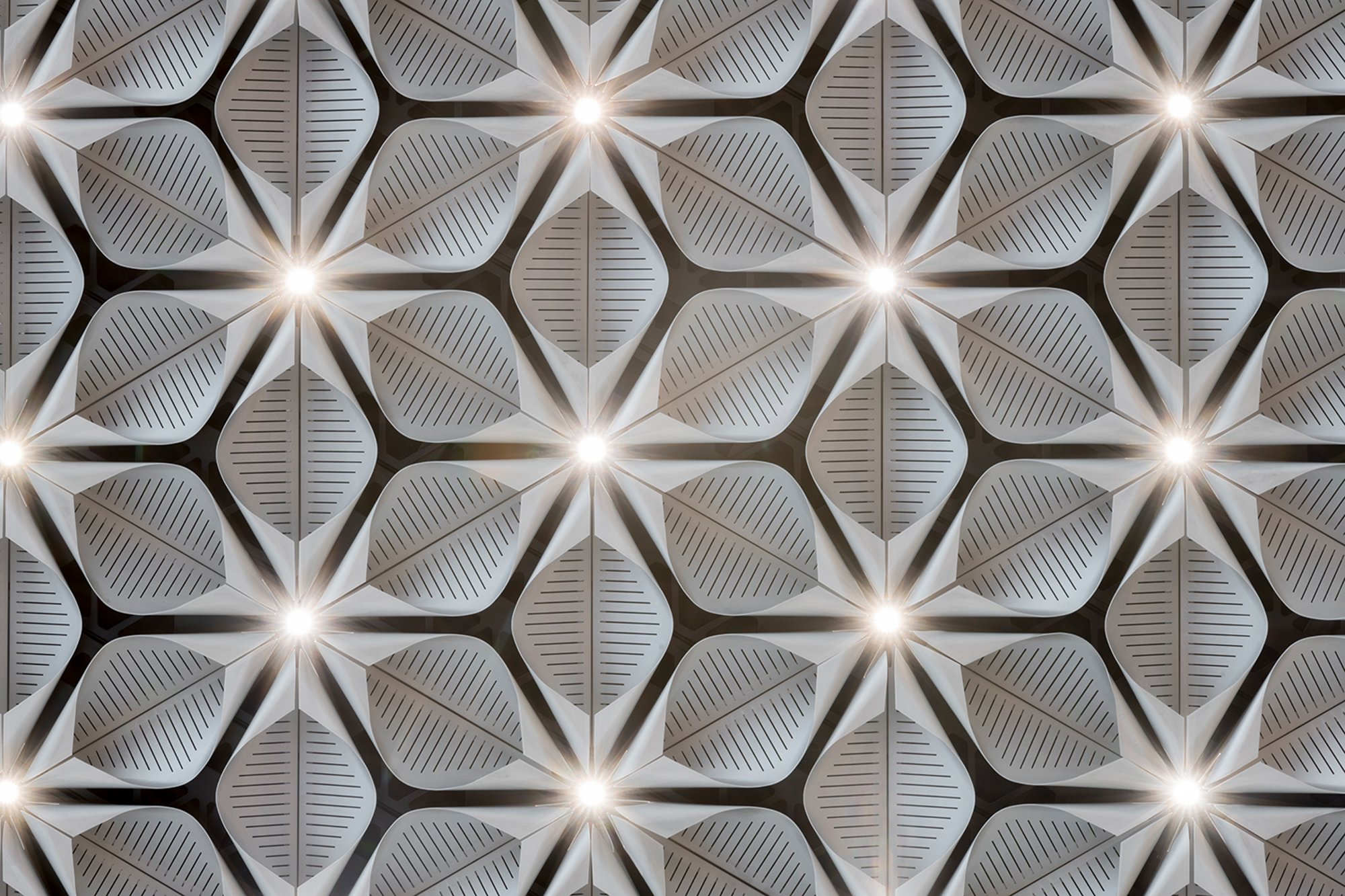 Inside, between the office floors, is the multifunctional integrated panel ceiling, with its unique aluminium ‘petal’ design. These unique petals were shaped to maximise the cooling potential of the radiant ceiling, while allowing sound to pass through to the acoustic absorption installed behind, on the soffit, thus allowing for control of reverberation within the space. The petals also scatter sound, thus improving privacy – always a challenge in an open-plan environment.