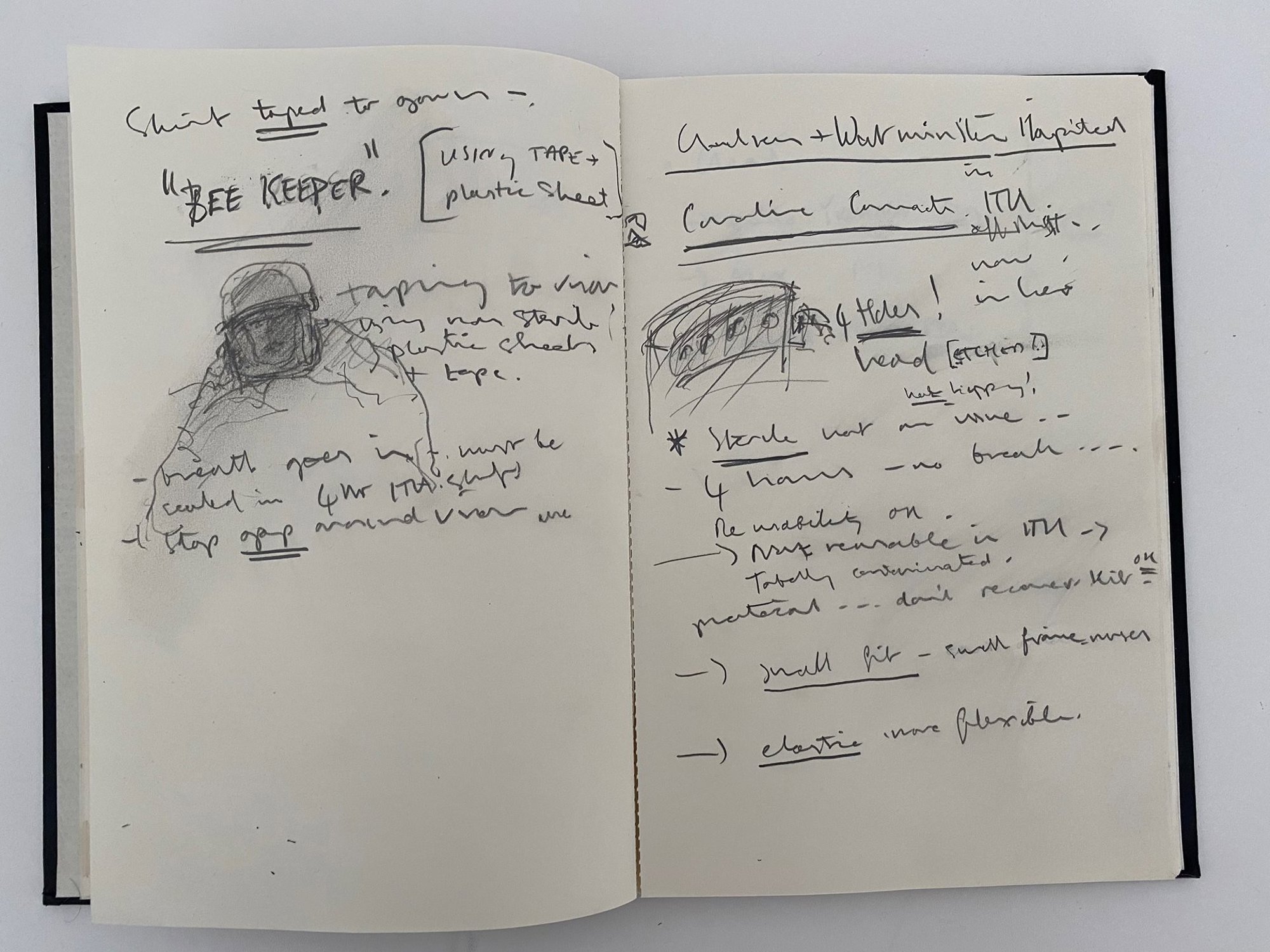 A page in Grant Brooker’s sketchbook documents the feedback received from one of the doctors at Chelsea and Westminster Hospital, given immediately after finishing her night shift. The holes in the headband of our initial prototypes made circular marks on the doctors’ and nurses’ forehead, and so these were subsequently removed from the final design. Image courtesy of Grant Brooker © Foster + Partners