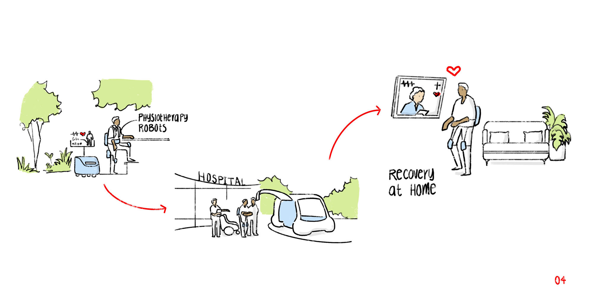 SLIDE FOUR: Once the patient has recovered from the immediate effects of their surgery, they begin their rehabilitation plan with the help of a robotic exoskeleton. This robot-assisted therapy, combined with remote monitoring of the exoskeleton’s motion and frequent check-ins from the patient's local healthcare team have helped to significantly improve their mobility and reduce symptoms. This has resulted in a significantly improved quality of life and a return to relative normality for the patient. © Foster + Partners
