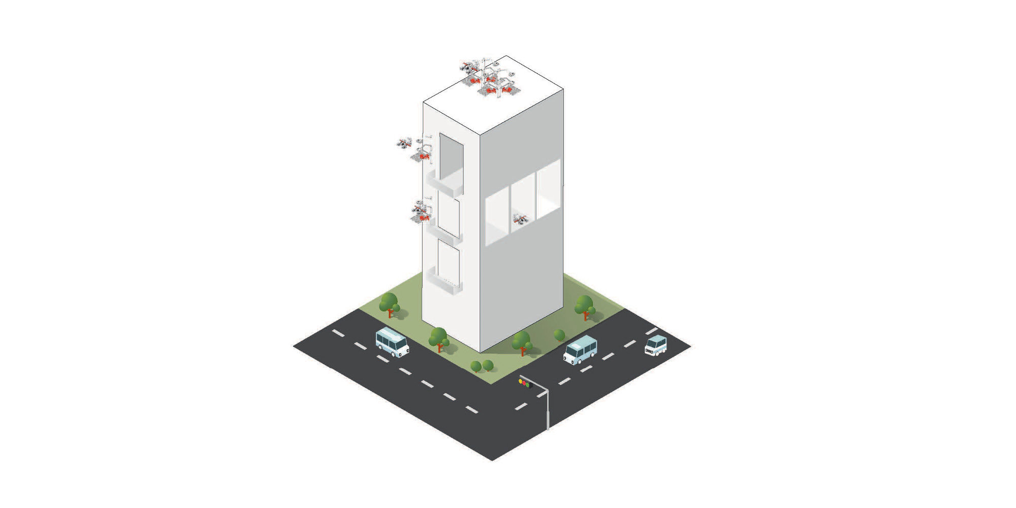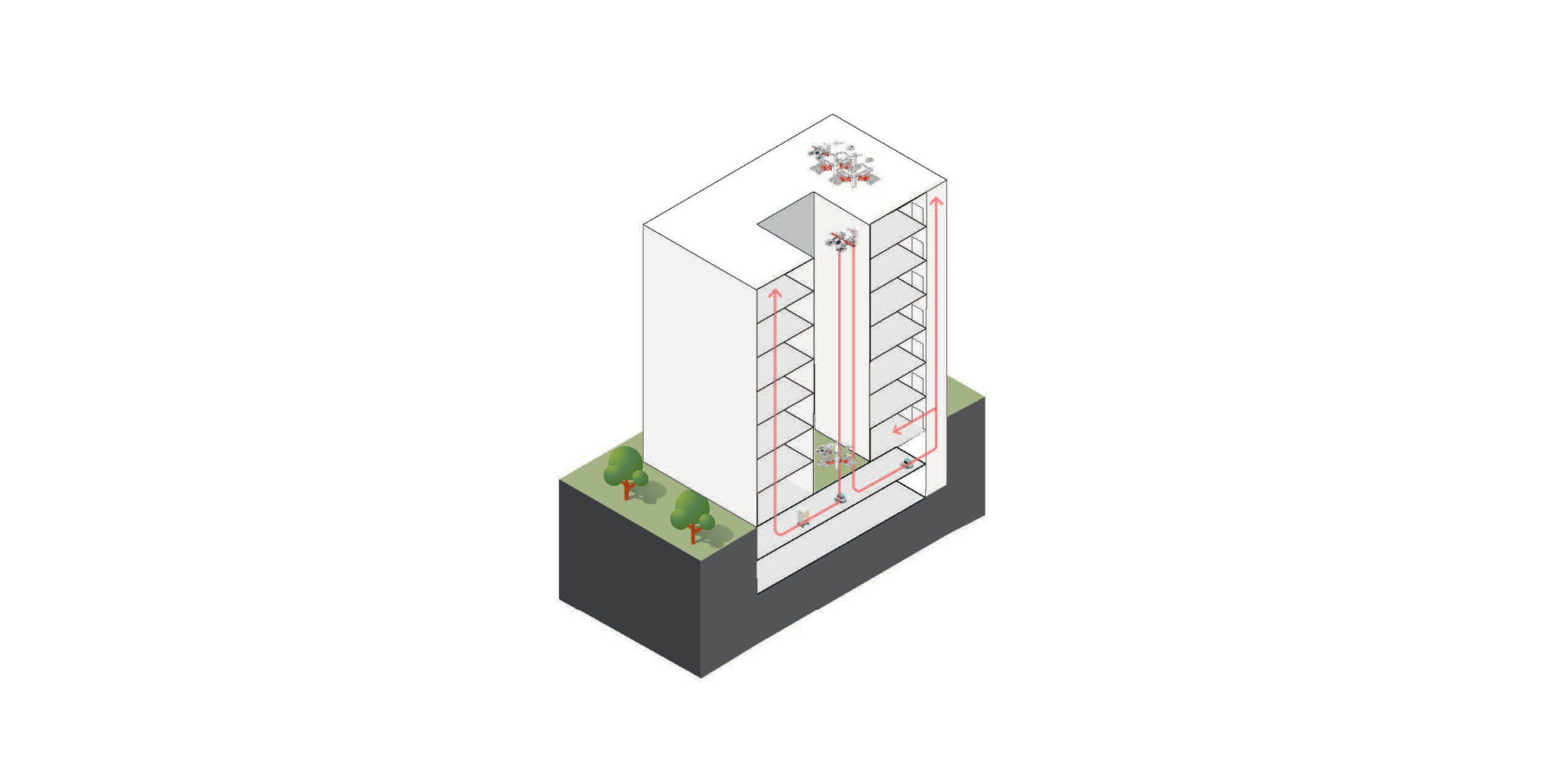In high-rise contexts, facade-level integration can be achieved through features such as balconies or garage openings, but these can still be on the periphery of where staff and patients are located. Delivery deeper into floorplans would enable more convenient parcel handovers, but poses a greater challenge. Drop-shafts from roof-level delivery points address upper-levels of the building, while other options for lower level floors include allocating intermediate service levels, perforating the building structure to create drone access space, or creating a handover point to the internal goods handling robots at a convenient location such as the basement. This improves the speed of parcel handover, by bringing deliveries closer to their destination. Designers must carefully consider these options, as they involve a trade-off between clinical and non-clinical services.
