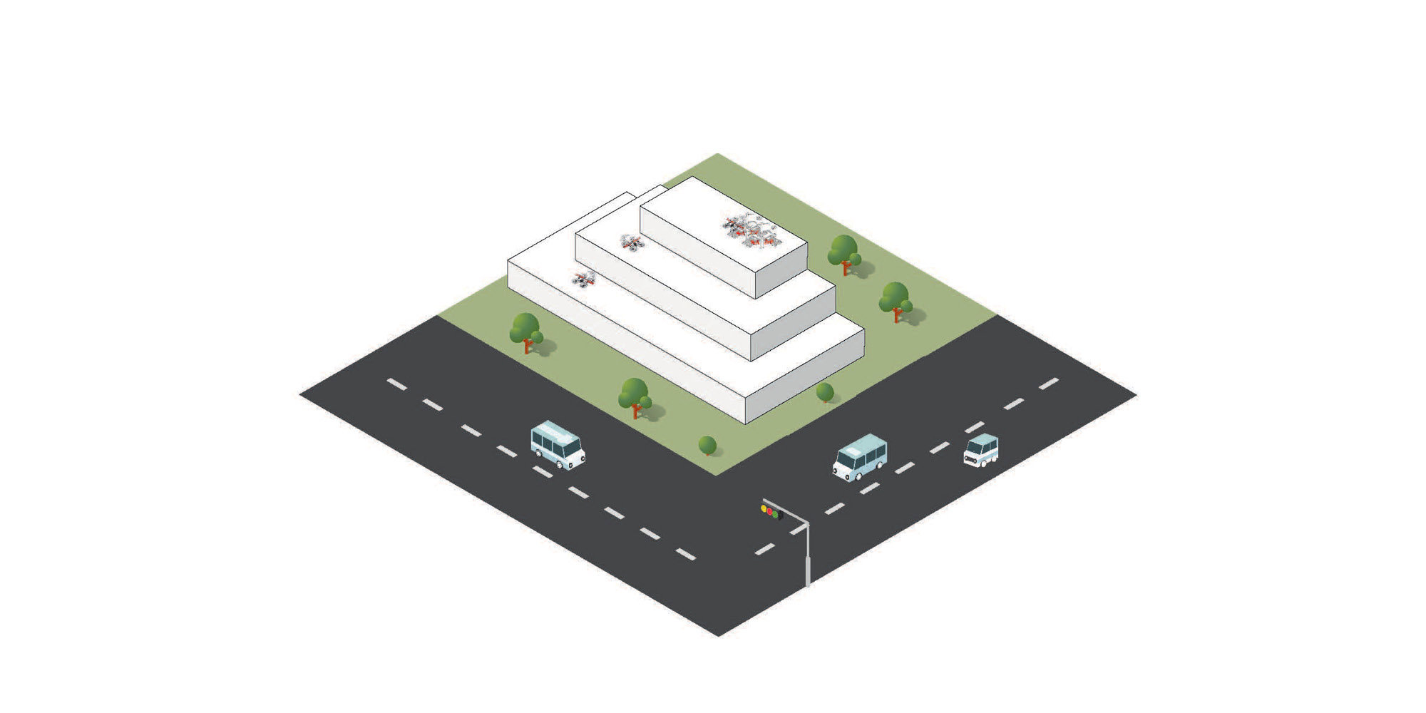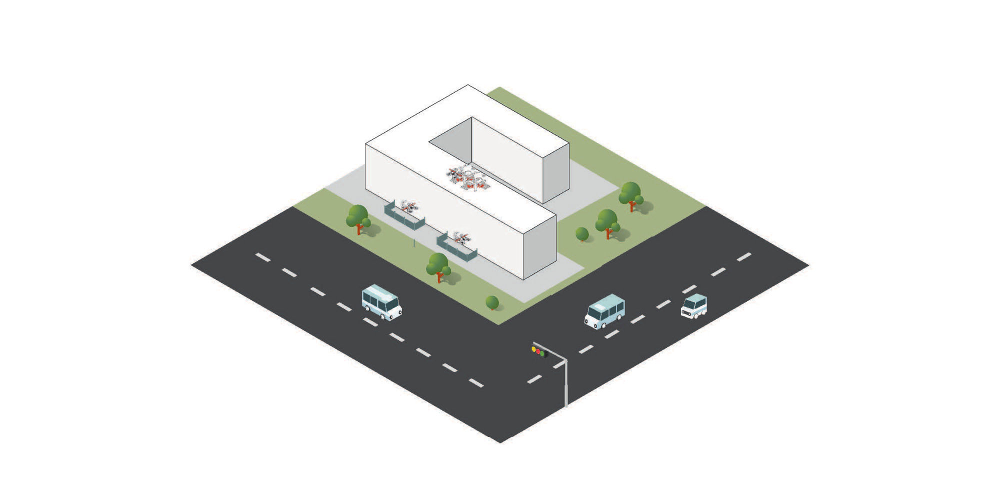 Drone delivery is also dependent on building form. Roof-level and ground-level package handover between drones and staff is not ideal as it can result in longer walking distances and retrieval times - with ground-level delivery raising particular security and safety concerns. For designers, there are many potential approaches for deeper integration of drone deliveries. A low-rise building profile with a stepped roof increases the landing space available for drones, and allows staff on each floor to access drones to exchange goods. However, a stepped roof cuts into the floor plan, and an increase in landing space for the drones results in a decrease in floor space – which likely impacts the number and layout of patient rooms. Another low-rise building profile, without a stepped roof, has a different set of outcomes: while the floorplan is more effective, the roof space and therefore landing space for drone delivery and handover is limited.