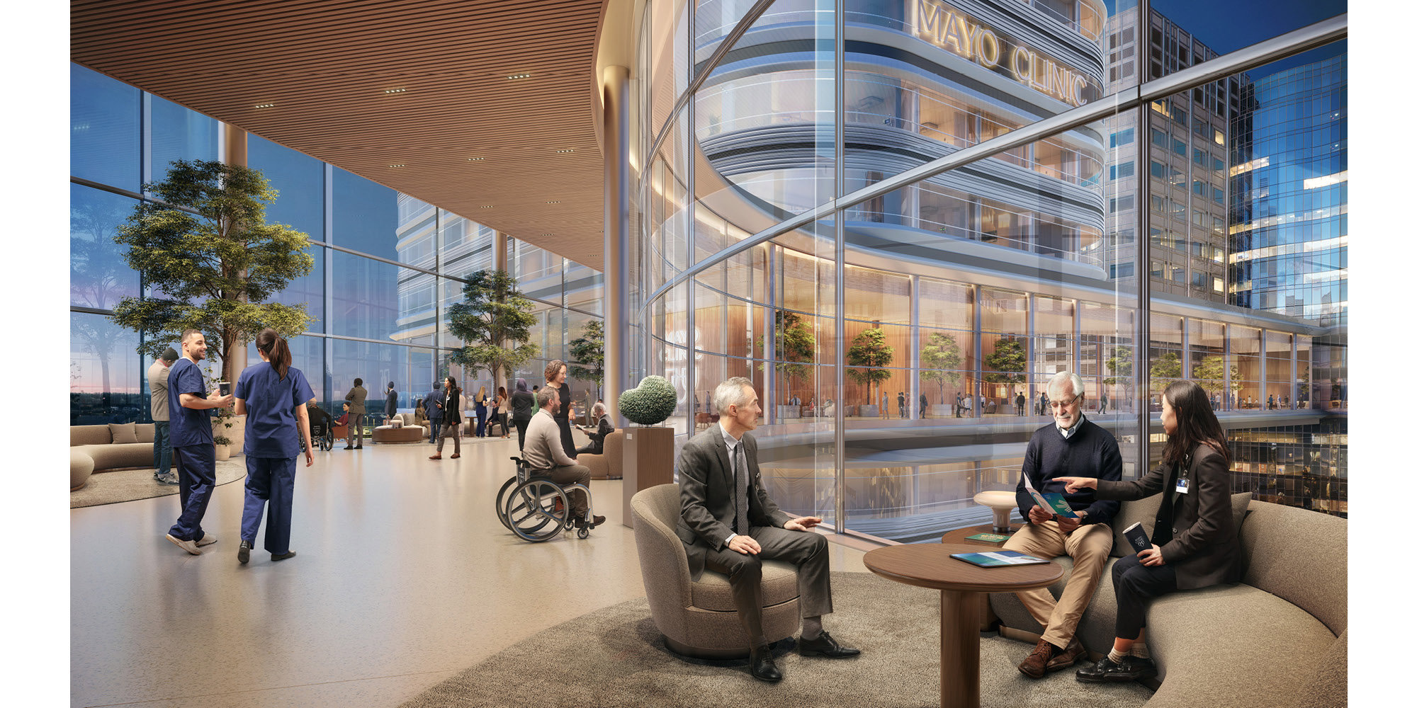 Equipped with an ecology of approaches, and applying much of the thinking discussed here, Foster + Partners is currently designing Mayo Clinic in Rochester, Minnesota. Designed with a methodology rooted in interdisciplinarity, the Mayo Clinic will adopt a universal grid, along with generous floor-to-floor heights, that will allow clinical spaces to change over time and respond as healthcare continues to evolve. Care environments will be served behind the scenes by highly flexible technological infrastructure containing mechanical, data and robotic delivery systems that support pioneering treatments while allowing prioritisation of human connections. The seamless integration of digital capabilities blurs traditional distinctions between inpatient, outpatient, and virtual care to support patients throughout their healthcare journey.
