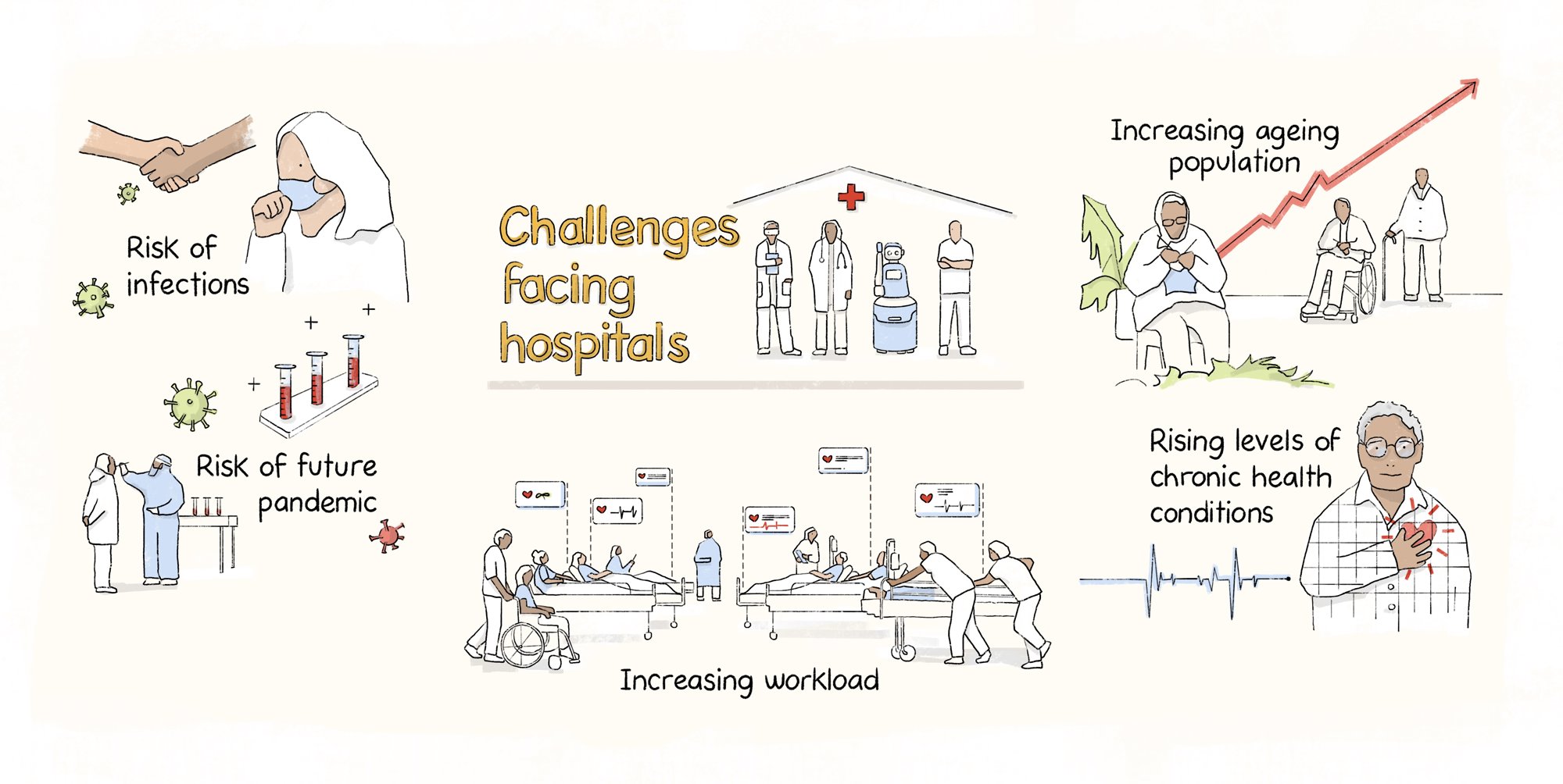 Hospitals face a wide range of complex and interlinked challenges. Robotics will play a pivotal role, not only in elevating patient outcomes by delivering the highest quality of care, but also in enriching the experiences of patients, caregivers, and staff.