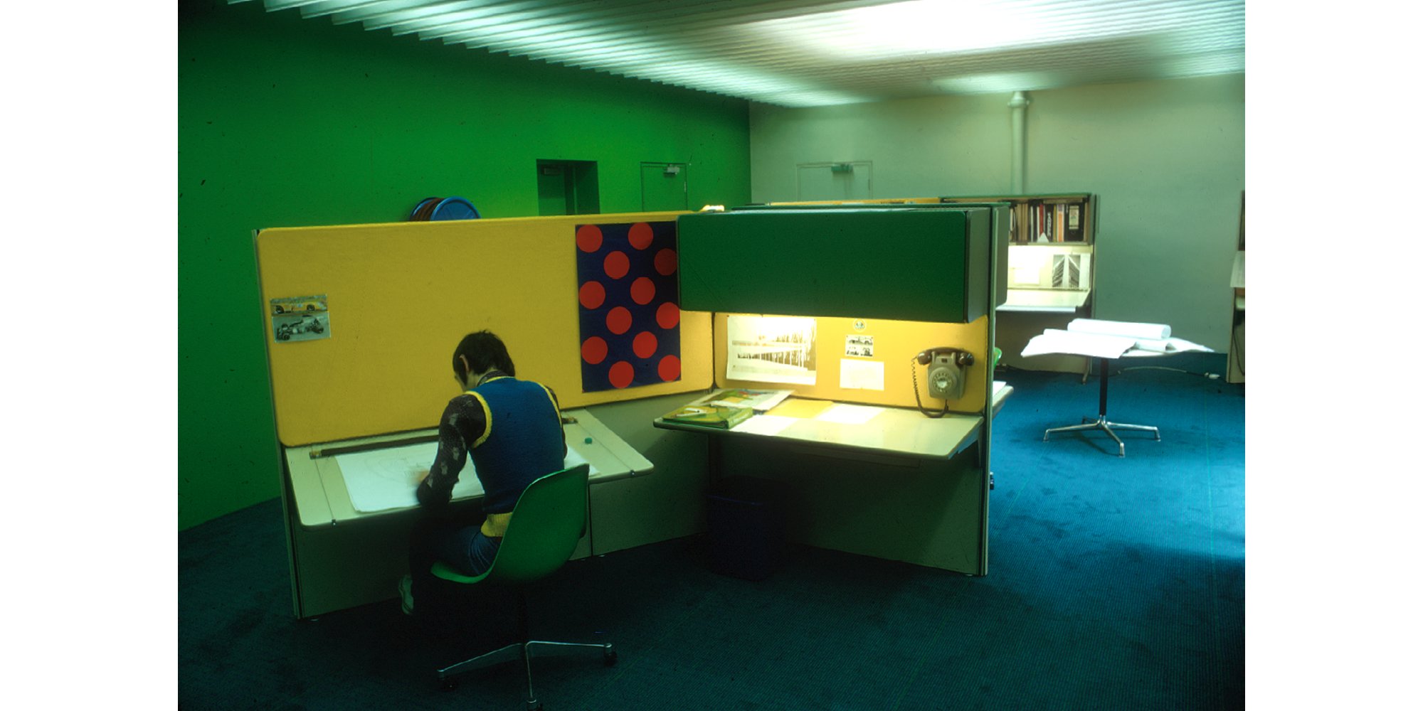 An architect at the drafting table - part of the Herman Miller action-office system - in the Fitzroy Street studio, 1971-1981.
