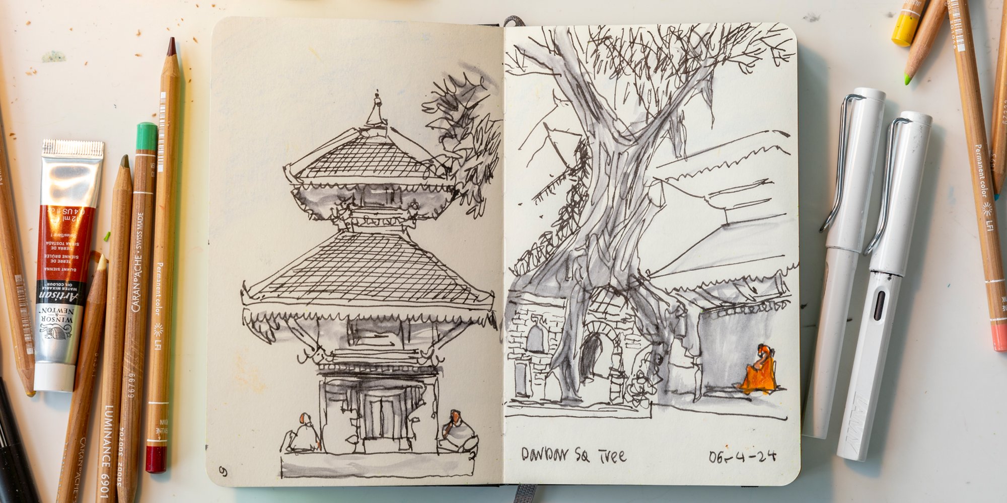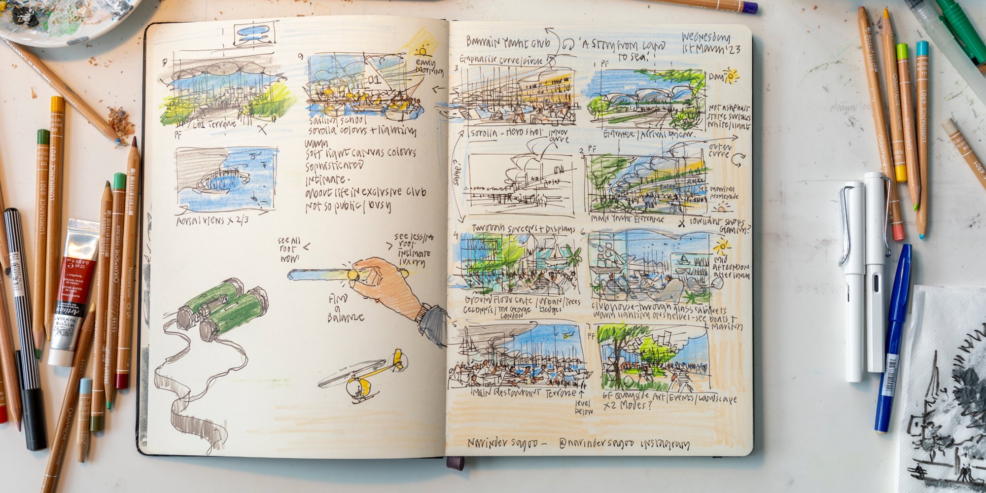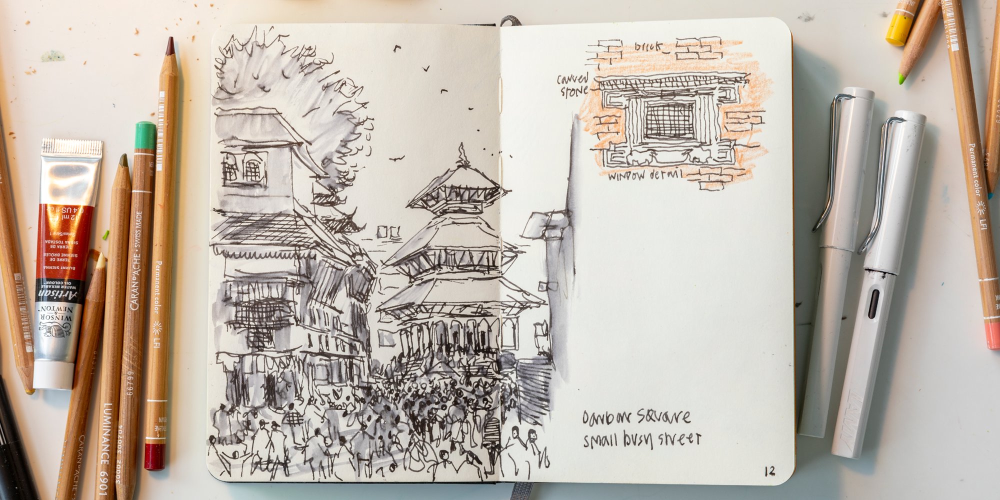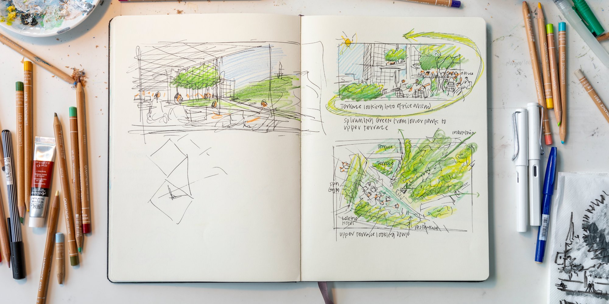 Sketchbook from Narinder Sagoo's recent trip to Nepal in support of [CHARITY NAME]. Sketching, for Narinder, is a tool for creativity and expression that can bypass the constraints of verbal language. © Aaron Hargreaves / Foster + Partners