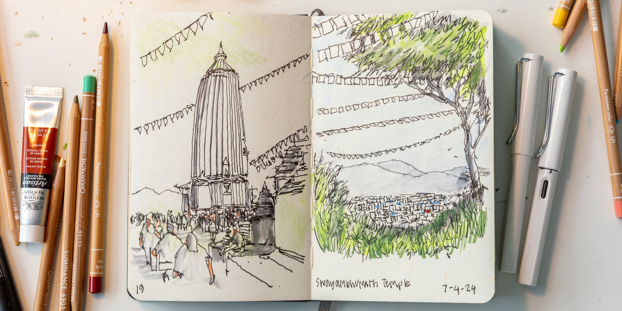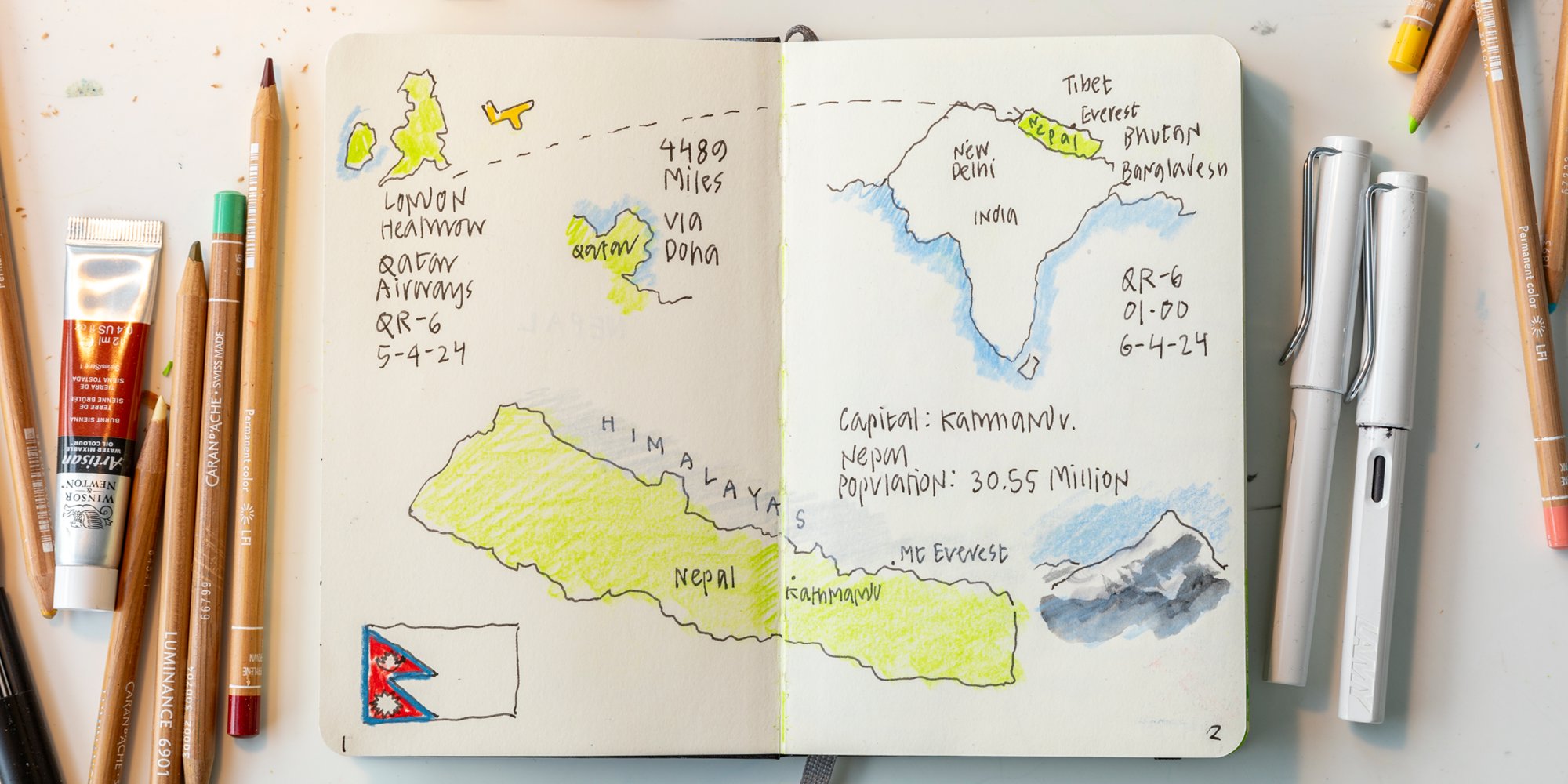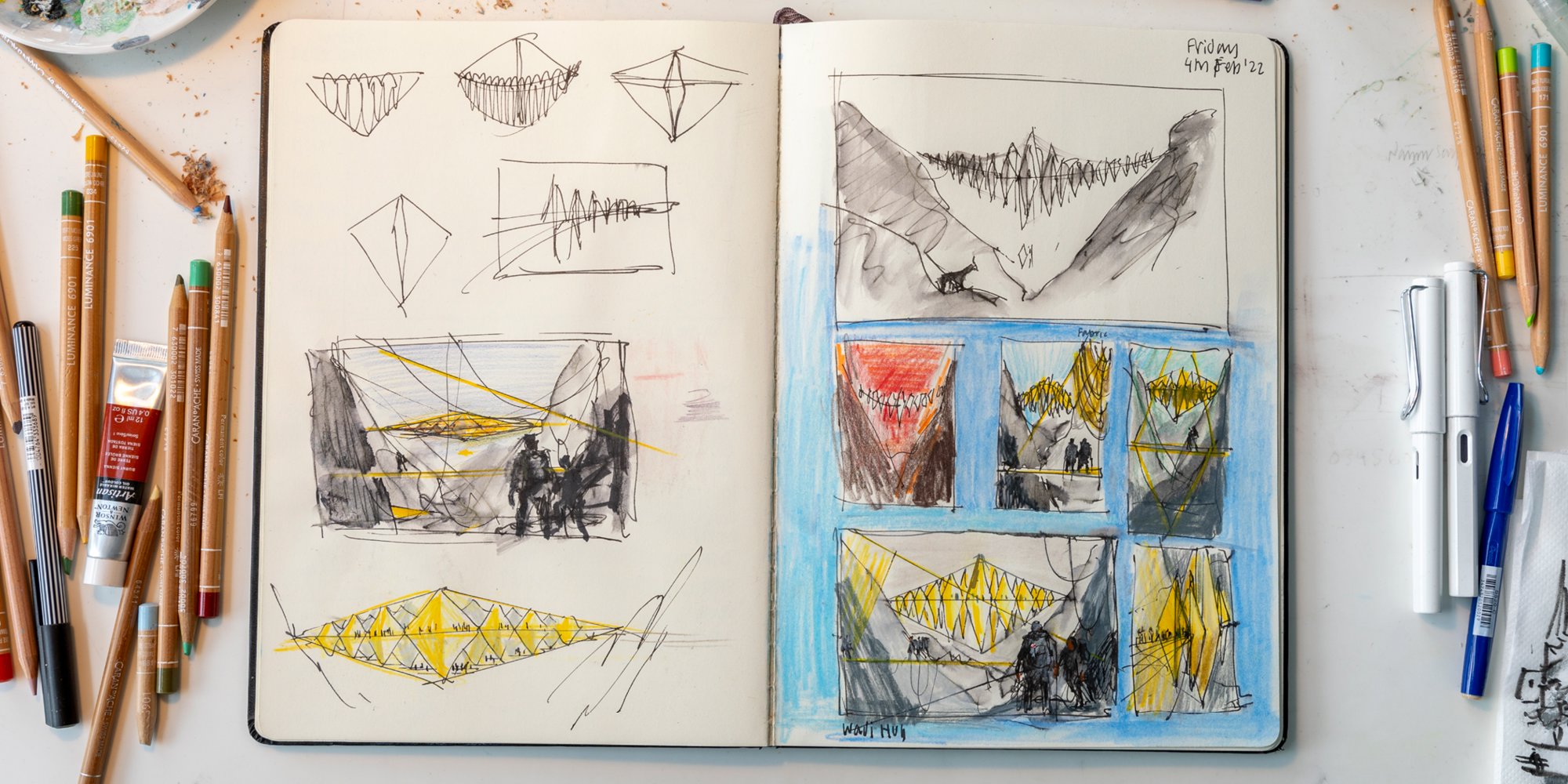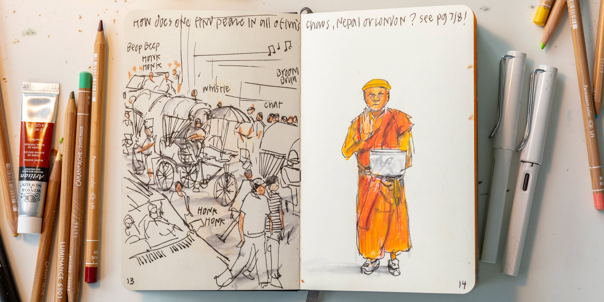 Sketchbook from Narinder Sagoo's recent trip to Nepal in support of [CHARITY NAME]. Sketching, for Narinder, is a tool for creativity and expression that can bypass the constraints of verbal language. © Aaron Hargreaves / Foster + Partners