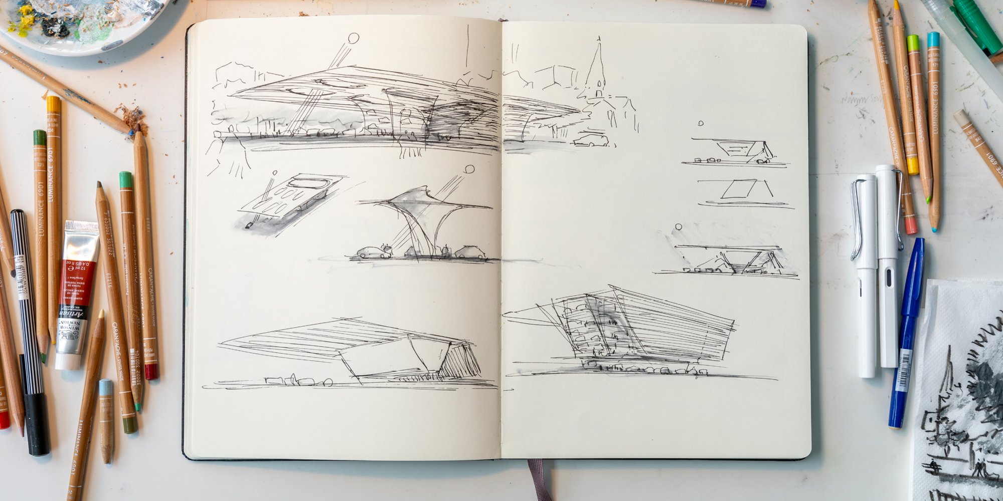 Within this field, an extraordinary range of avenues present themselves – from the mathematical and perspectival, to the abstract and playful – though perhaps a useful starting point is that architectural drawing is a visual representation of a creative idea. As the varied output of a studio like Foster + Partners illustrates: a highly technical, elaborate plan is as much a form of architectural drawing as the freehand, rapid sketch of that same completed presentation.