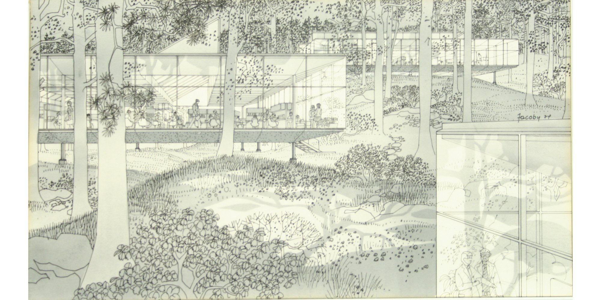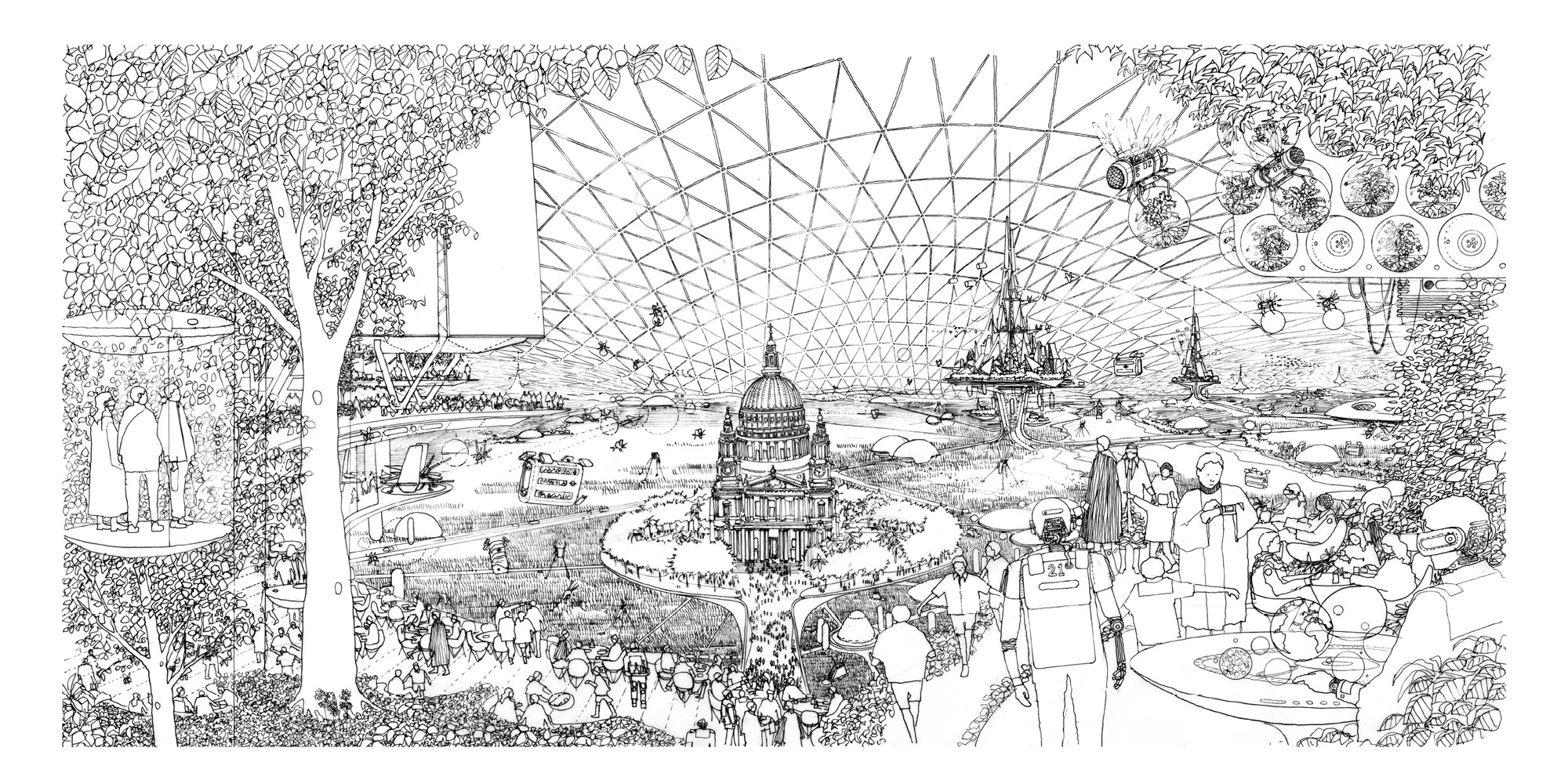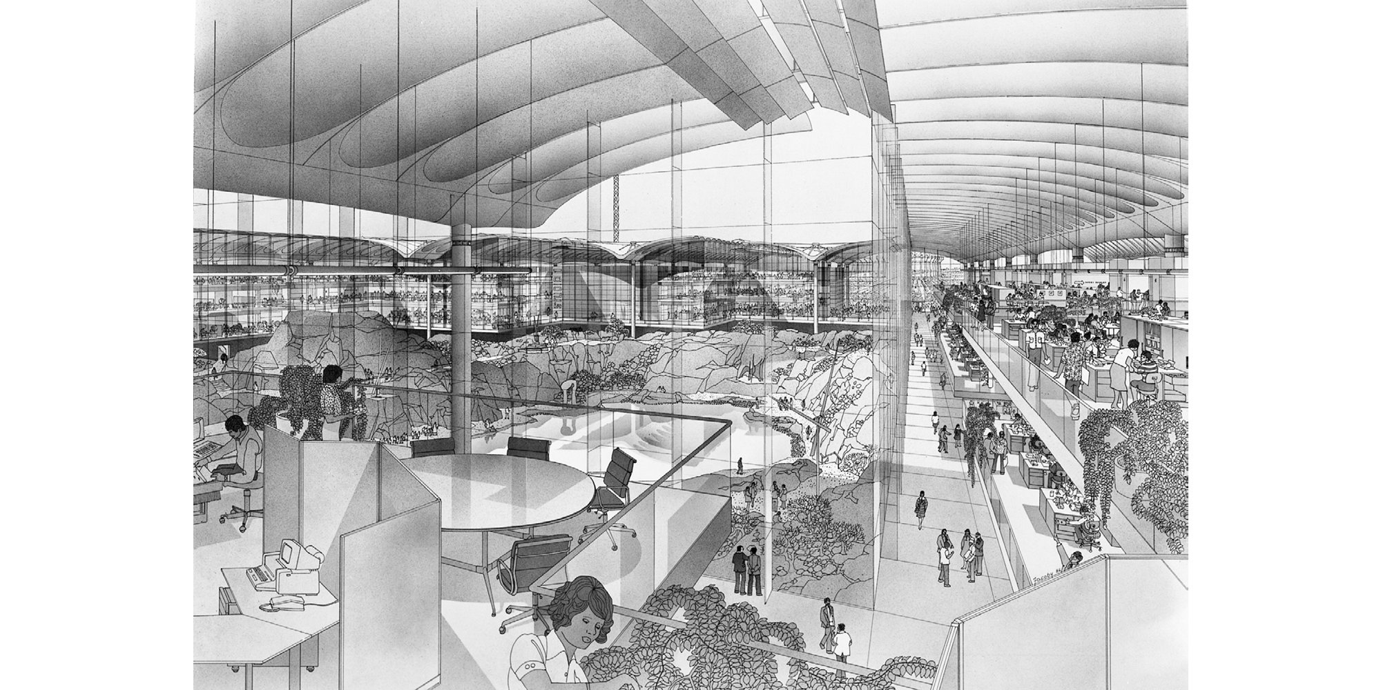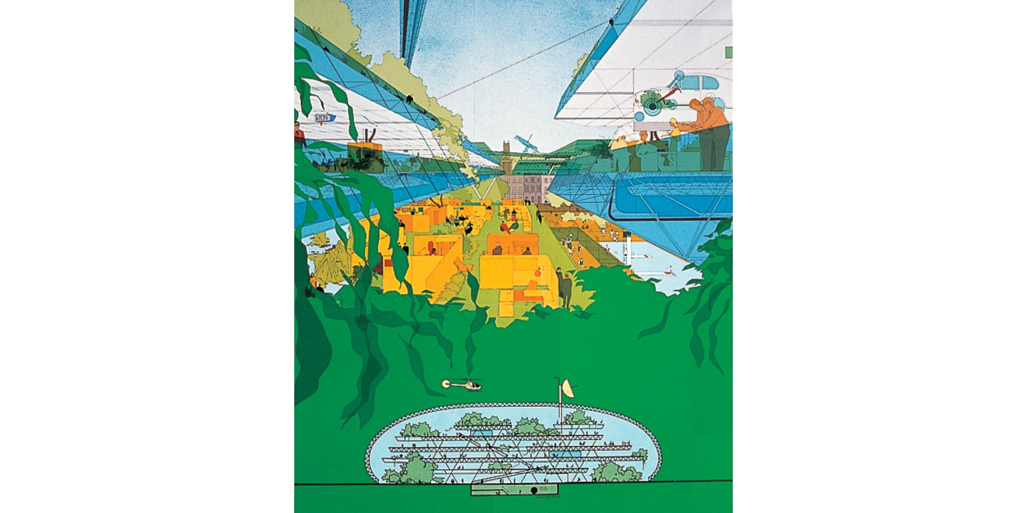 Drawing by Birkin Haward for the Climatroffice, a project that evolved from a discussion between Norman Foster and Buckminster Fuller during a break in a work session on the Samuel Beckett Theatre, Oxford. © Birkin Haward / Foster + Partners