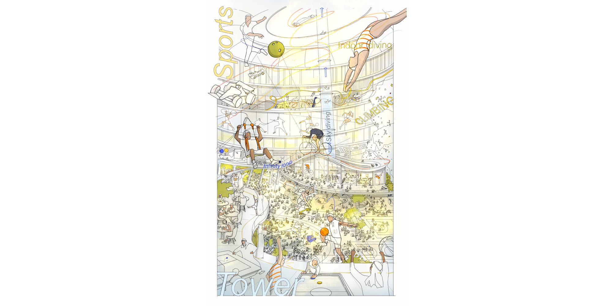Alongside Jordan, artists like Nicte develop an initial concept drawing into a two-dimensional sketch that, in turn, might then be animated. This requires close collaboration with the architectural and urban design teams to outline plans and faithfully reproduce them in ways that are visually engaging and that begin to make sense. Nicte’s diagrammatic sketches and animations display thinking in action and are often used to demonstrate how different systems in a design might interact – that is, how a design will function. Arrows and captions, for example, are not themselves drawn to be built but are graphic tools for articulating the design that will be built. People and places can be outlined without needing to be ‘coloured in’. Movement can be gestured towards, and symbols can be used to clarify an idea. In this way, Nicte’s drawings work with a conceptual freedom that allows the processes underpinning a design to be suspended and revealed, not as a final object, but as an essential ‘working out’ step in the process.