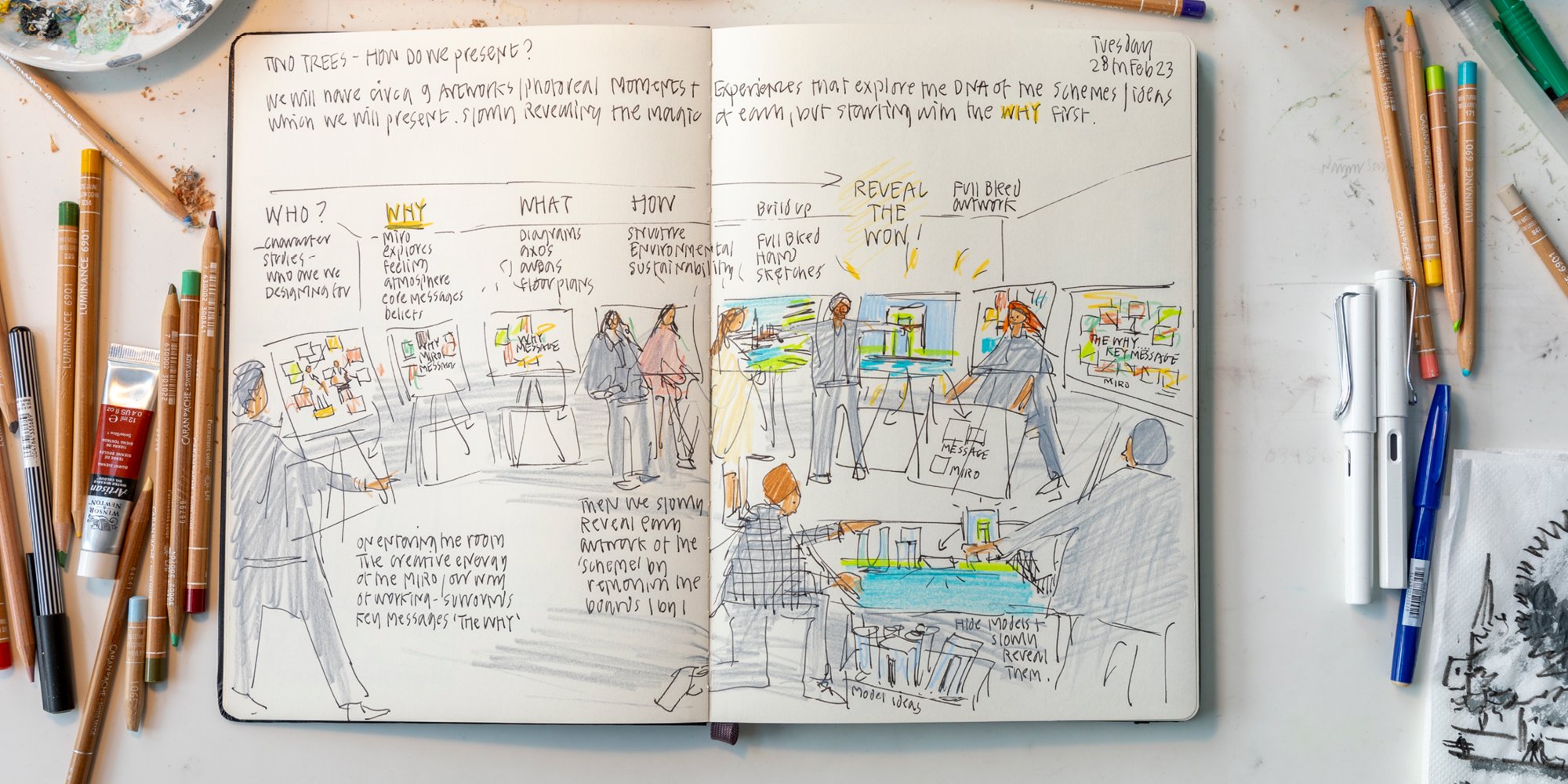 The team are often (though not exclusively) brought into projects to visually communicate and perhaps even help steer a design as it develops. They respond to projects with an impressive range of drawing materials and techniques. As Narinder explains, ‘different speeds and tools suit different intellectual and emotional processes.’ The seemingly small act of switching from a pencil to a pen – or between pens of different point sizes – has significant consequences on the work produced. Shifts between analogue and digital techniques, as well as the introduction of animation and acoustic components to a working definition of ‘drawing’, have further diversified the field. One client might appreciate an impressionistic concept sketch that colours the mood of a site. Others might prefer a photorealistic image that allows them to ‘time-travel’ into a project that is years away from completion. A third might not know what they want until they see it, leaving the team to decide how best to represent an idea. The team have to gauge which response would work best for the architects and clients, and at what moment within the design process to offer these responses - and avoid the common mistake of presenting a single solution too early. Design is not a monoculture; it is an ecosystem.