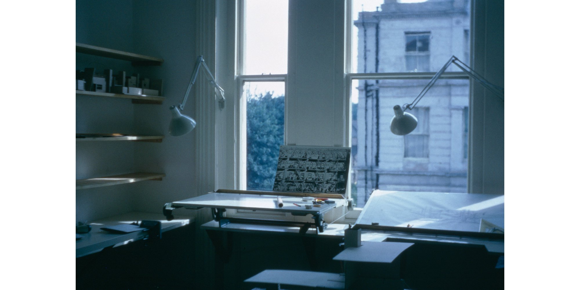 Drafting tables set against the window in the original Foster Associates office in Hampstead Hill Gardens, London - the apartment of Norman and Wendy Foster (1967-1970).