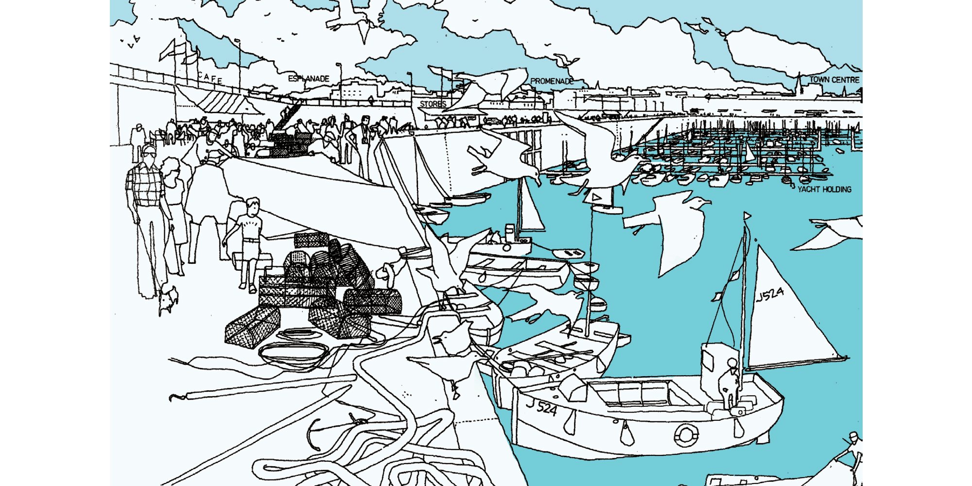 Drawing by Birkin Haward for the unrealised St Helier Harbour Masterplan, Jersey, Channel Islands. © Birkin Haward / Foster + Partners