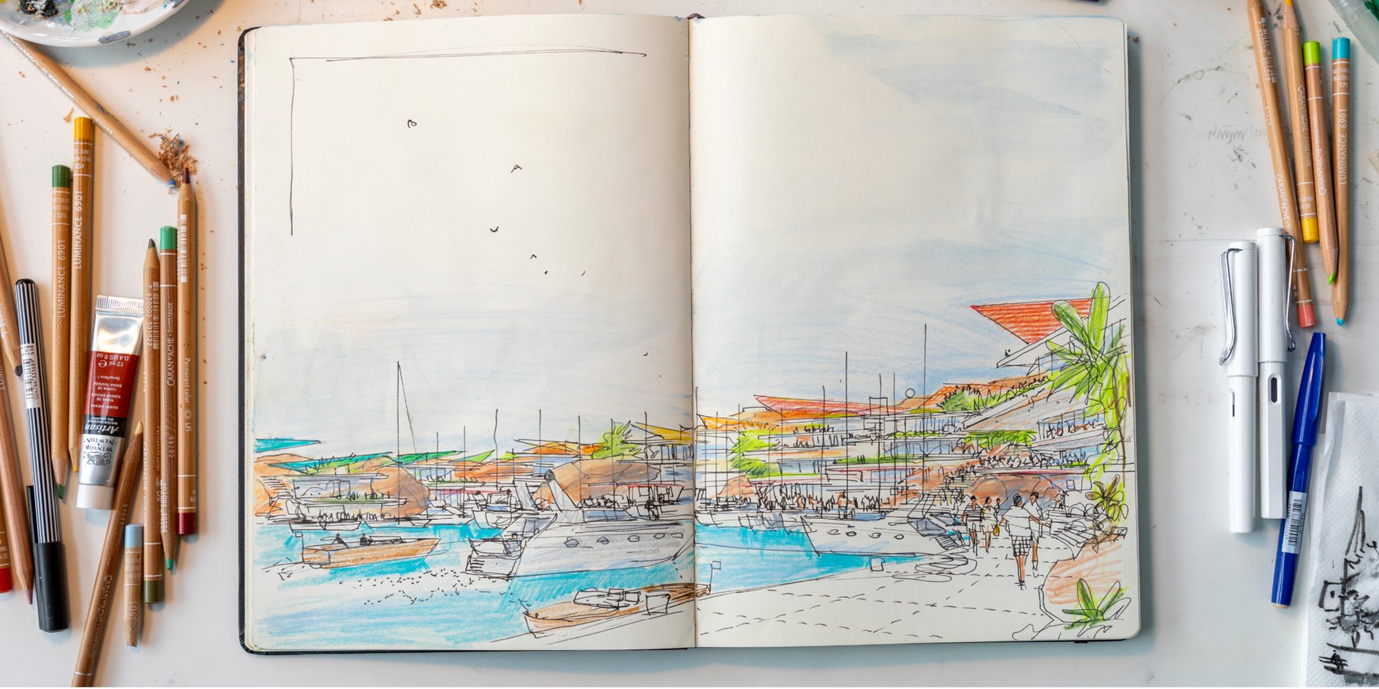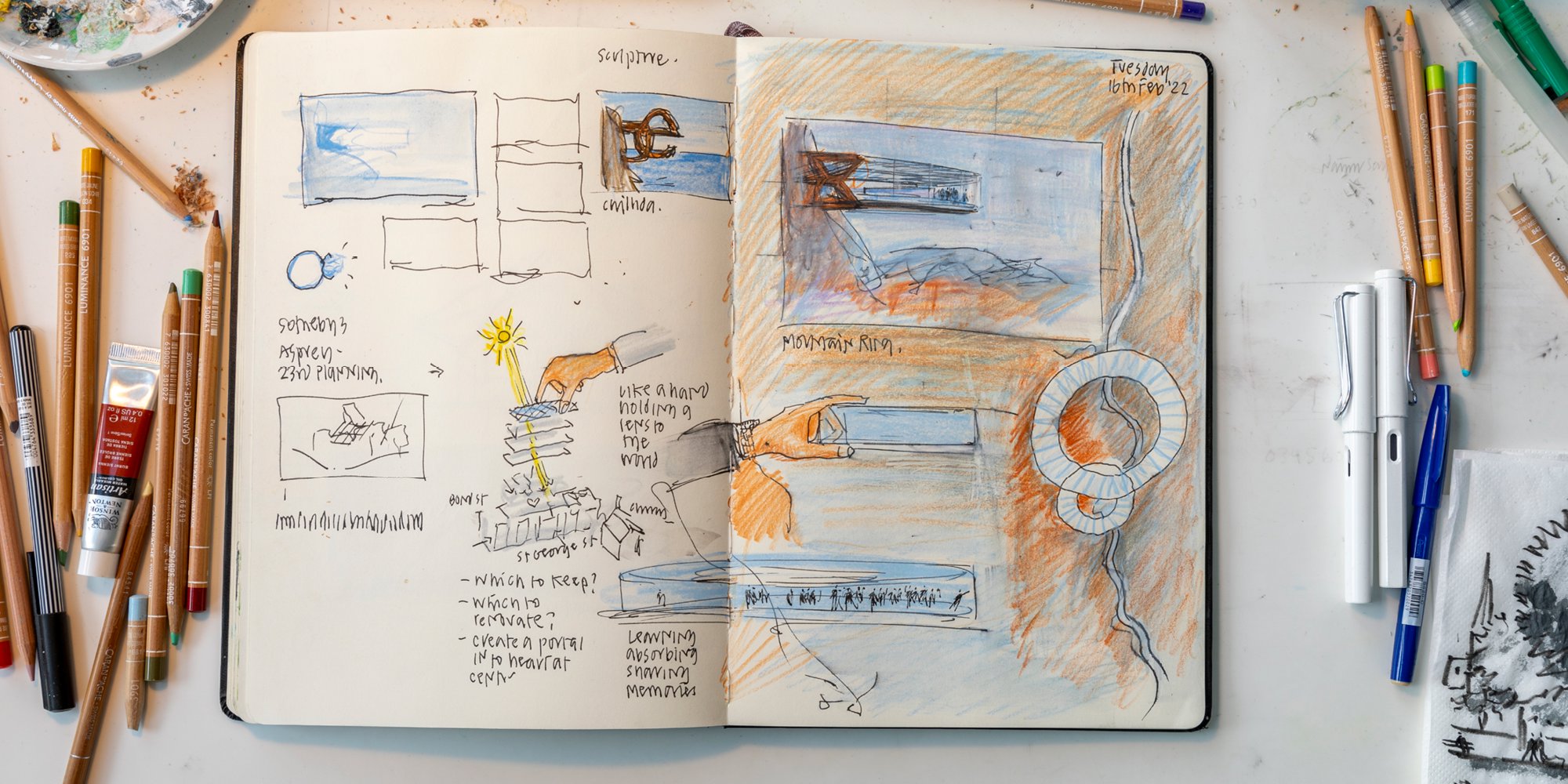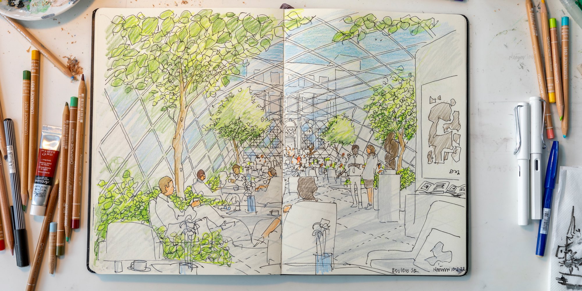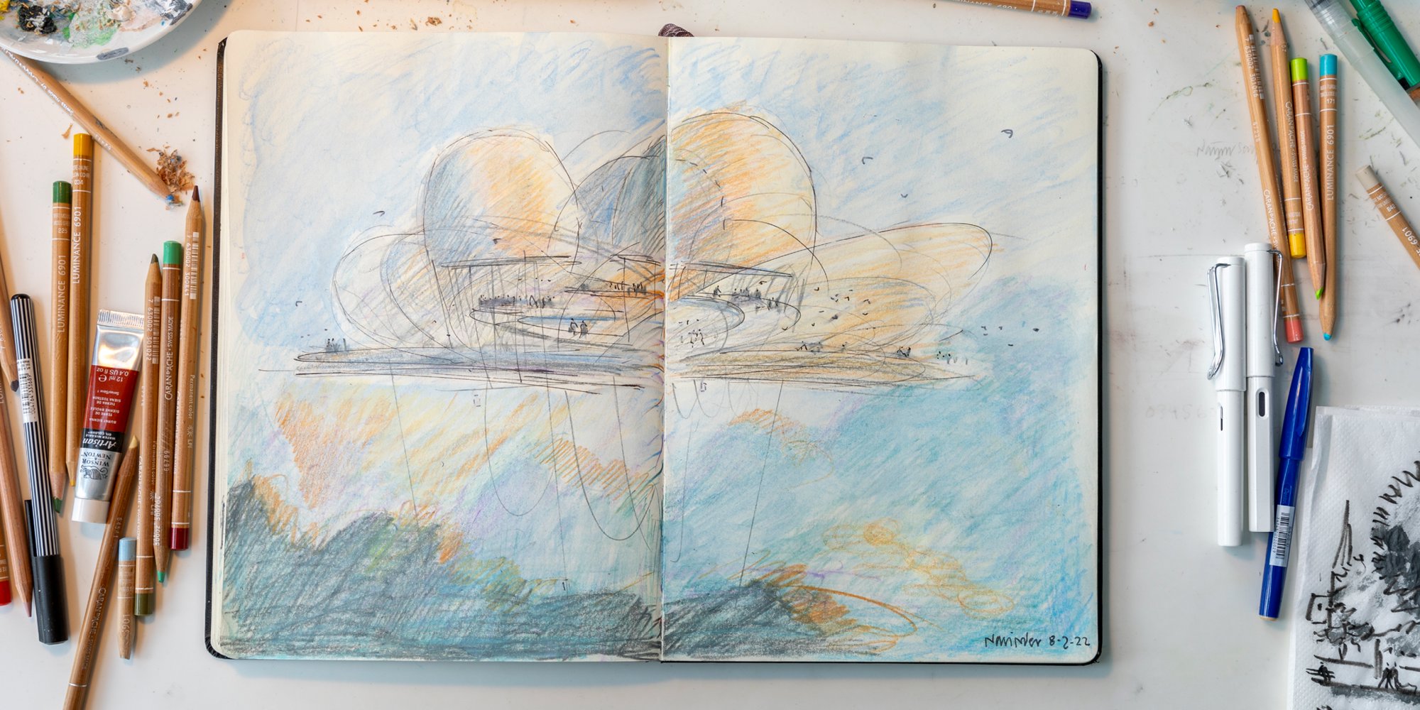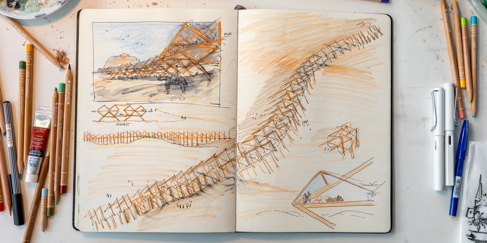 Architecture and drawing go hand-in-hand – a phrase that underlines the manual history of both the building and the sketch. As technologies and mediums for drawing expanded, so have the definition and use of the architectural drawing. Members of the Design Communications team at Foster + Partners reflect on their place in the practice of drawing in the Foster + Partners studio, and its ability to question what might be possible for a design.