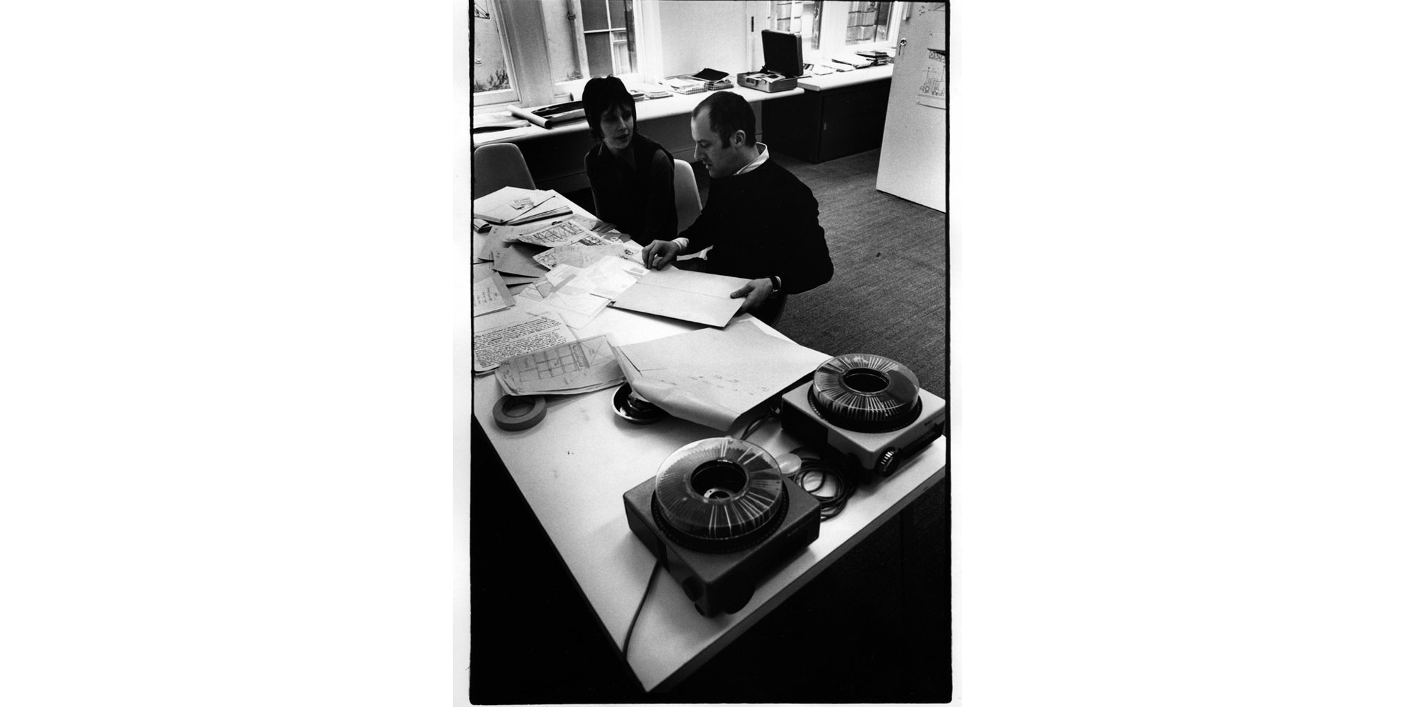 Norman and Wendy Foster review drawings in the Covent Garden studio in Bedford Street, 1970-1971.