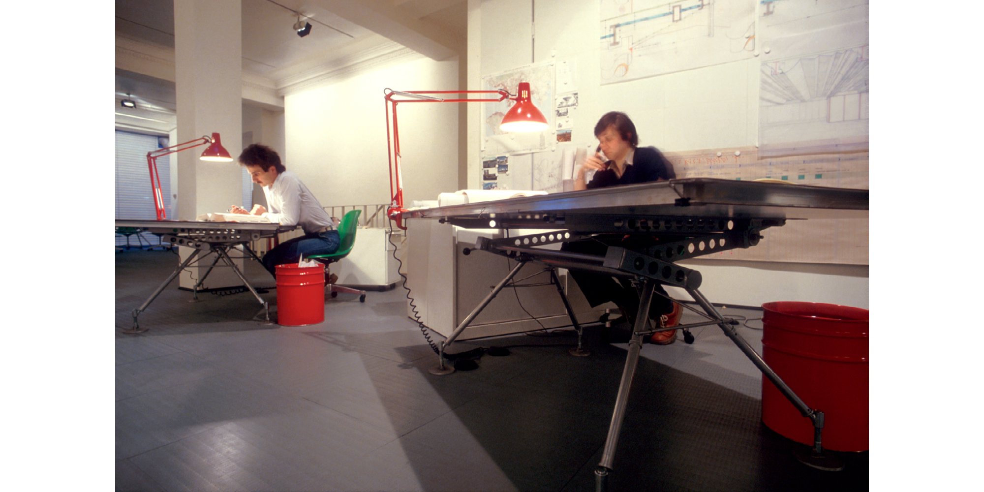For their next studio, on Great Portland Street (1981-1990), the practice developed its own prototype desking system, which could tilt to the desired angle of a drafting table. This system would go on to influence a custom range for the Renault Distribution Centre (Swindon, UK, 1982) and the Nomos furniture system for Tecno (1986).