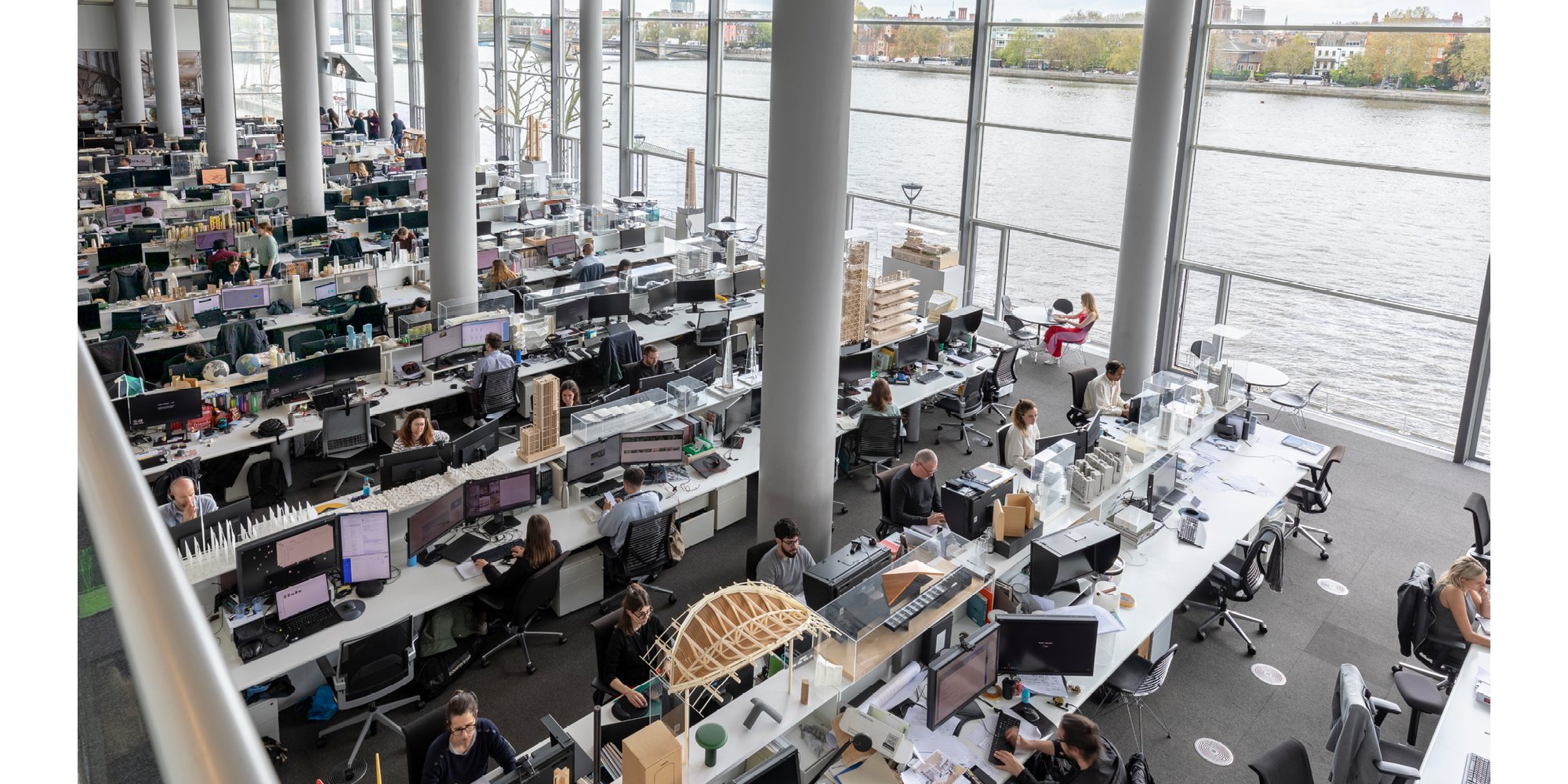 An elevated view of Foster + Partners main studio at its Riverside offices in Battersea (1990). Photographed soon after the practice moved in, the long worktables are still free of computers.