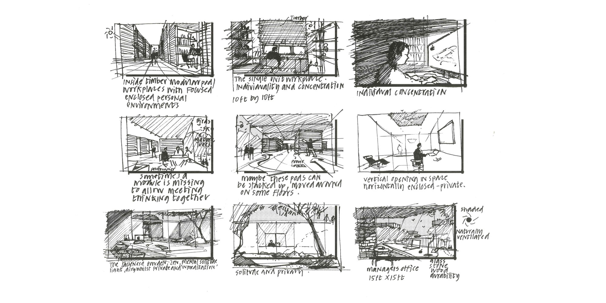 Similar to storyboarding, sketching is the communal grammar of the team. Members often sketch during conversations and reviews with the architects and with one another – translating between the verbal and the non-verbal, the stated and the implied. This receptivity to sketching allows ideas to germinate and, in turn, to influence and contribute to the design process. The relative freedom permitted by sketching is important for the team. As Nicte reflects: