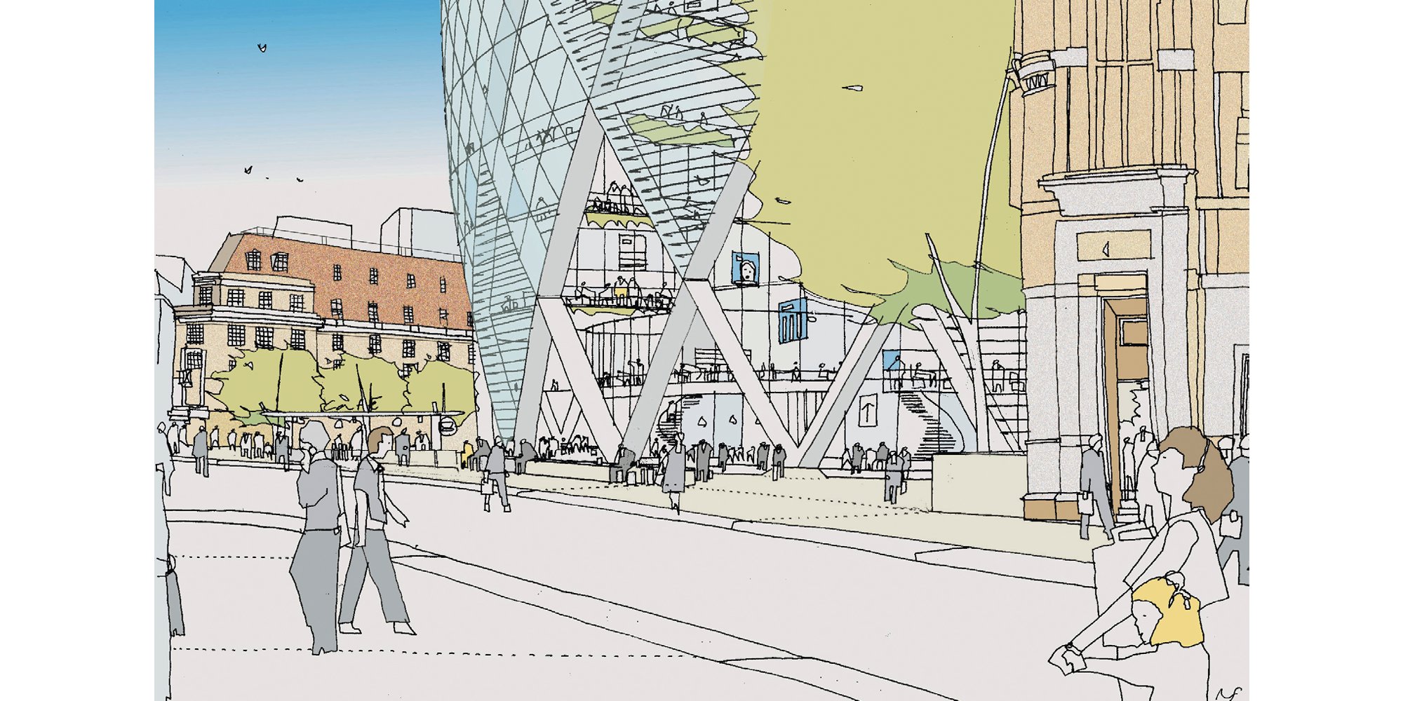 Public realm eye level handdrawing of 30 St Mary Axe (London, 2004) by Narinder Sagoo. © Narinder Sagoo / Foster + Partners