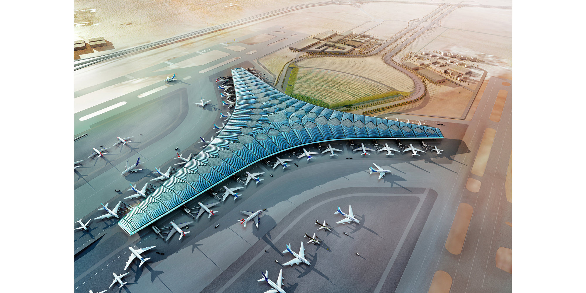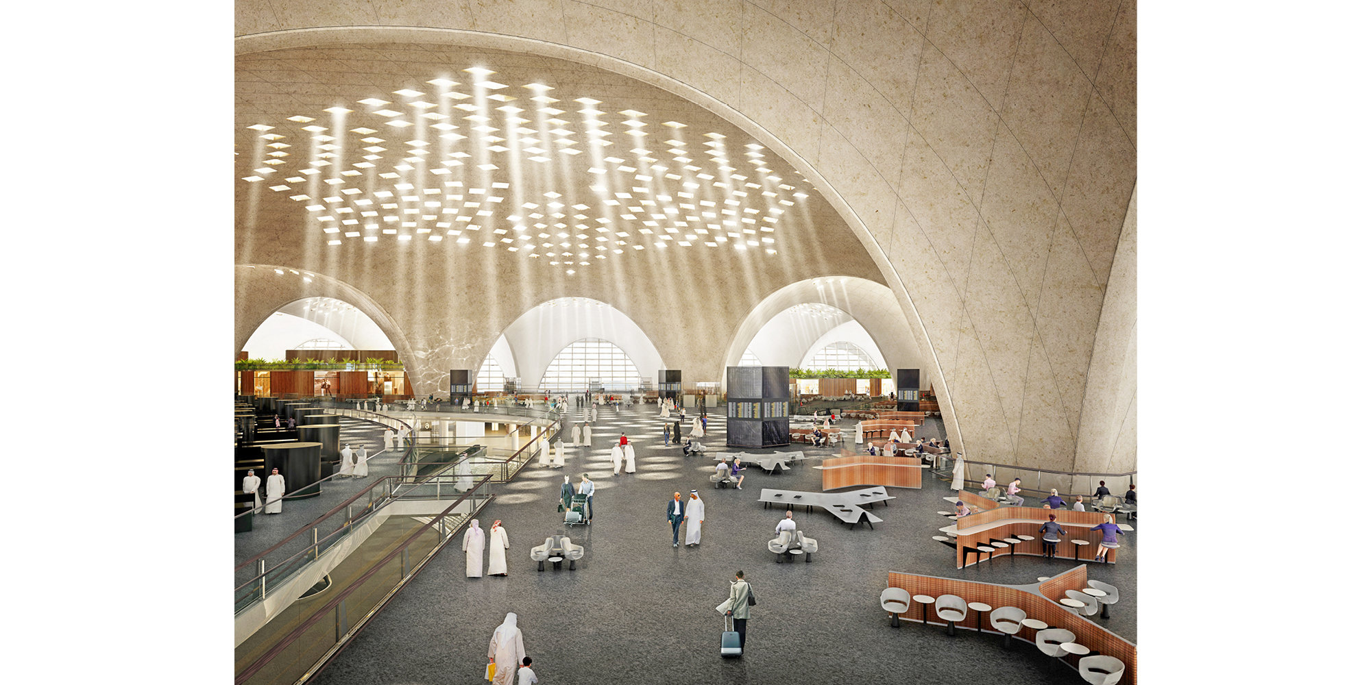 Drawing on the region's culture of hospitality and welcoming guests to Kuwait, the design establishes an elegant and memorable arrival sequence for passengers, which includes a baggage reclaim area surrounded by cooling cascades of water. The design also features a grand new landside access sequence from the south. Close to the building, the landscaping is a lush oasis, with strands of drier planting and species native to the desert climate extending further away from the terminal.