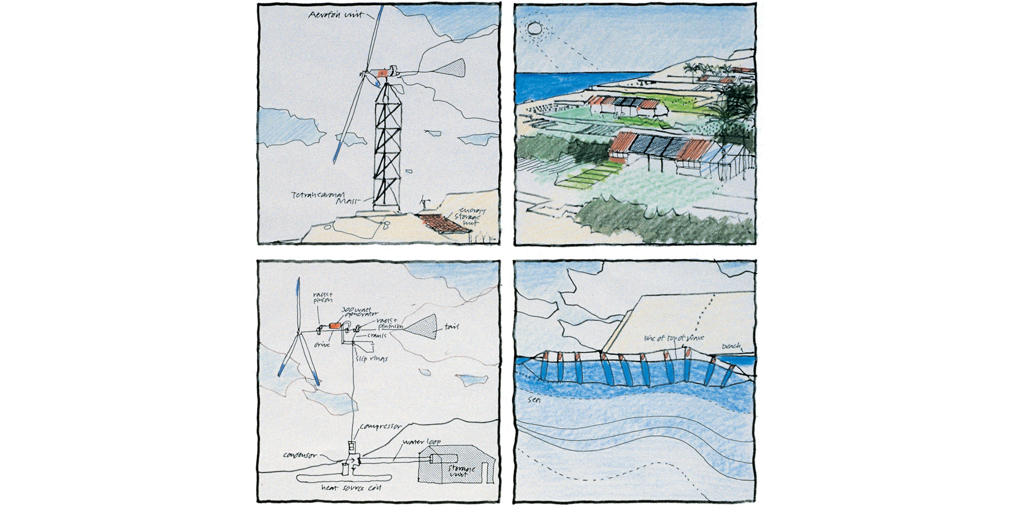 A sequence of sketches of the Gomera Case Study by Birkin Haward. The combination of almost constant sunshine and reliable winds made the island a perfect test-bed for alternative energy sources. © Birkin Haward / Foster + Partners
