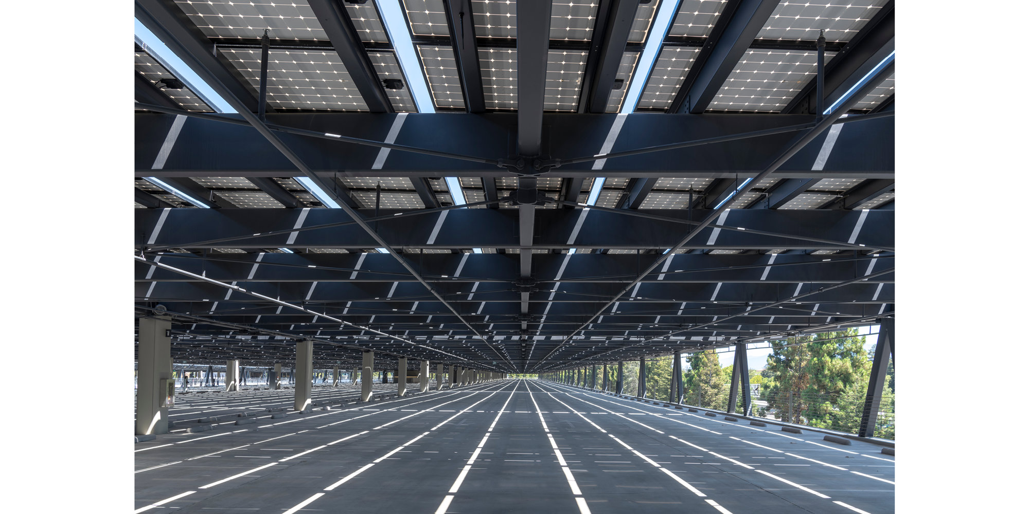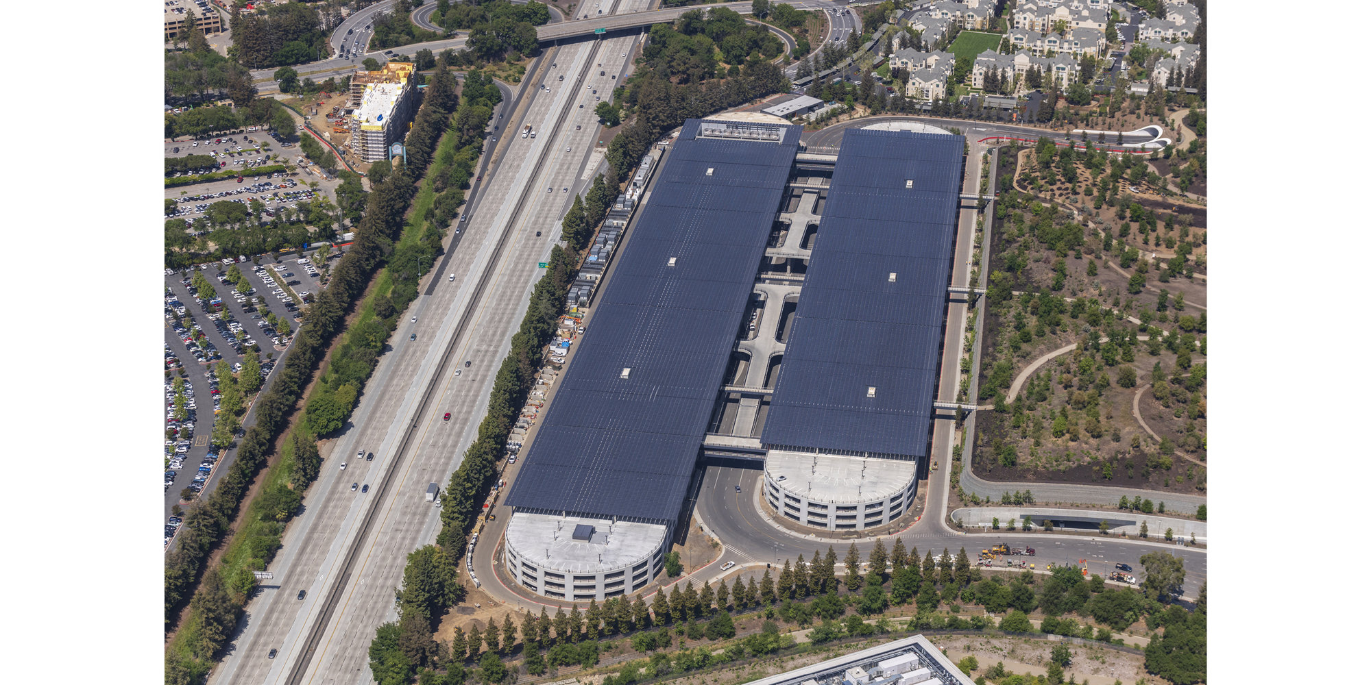 Solar panels blend into car parking infrastructure at Apple Park. © Nigel Young / Foster + Partners