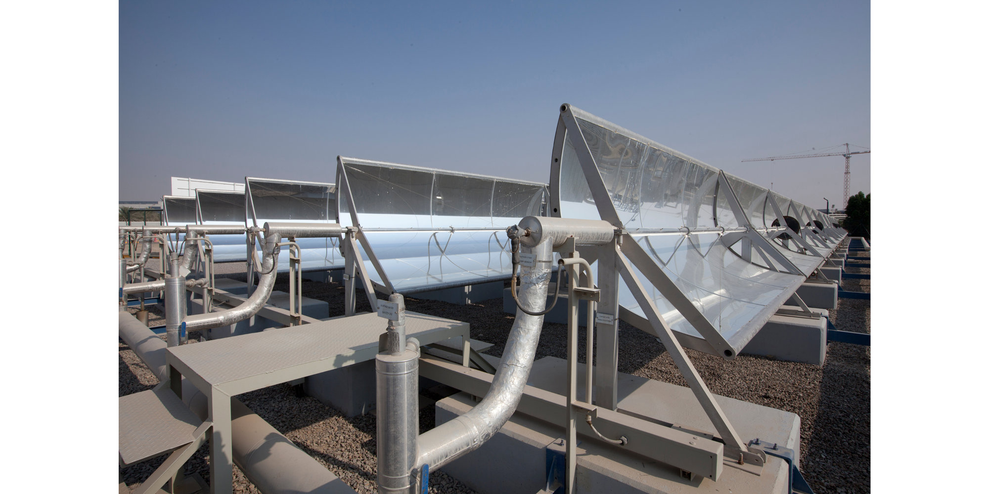 The Beam-Down Solar Thermal Concentrator at Masdar. Ground-level, reflective heliostats track the path of the sun during the day and continuously reflect and focus its rays towards a central reflector at the top of a tower. This reflector then redirects the light to a lower focal point close to ground level. The system was constructed in Masdar City in 2009 in order to investigate the potential of the unconventional design, which uses ‘Beam-Down’ optics and a heliostat construction is a departure from regular central-receiver solar tower designs. © Nigel Young / Foster + Partners