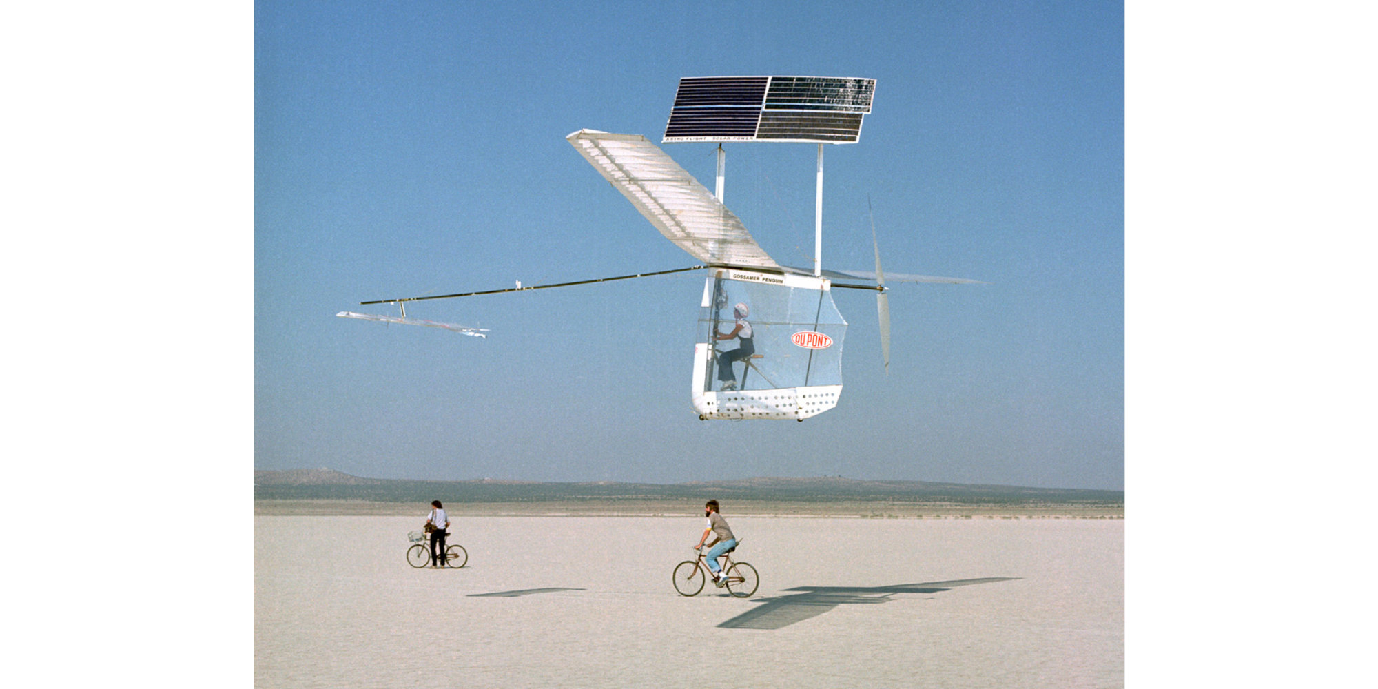 Solar-powered Gossamer Penguin, piloted by Janice Brown (1948–), in flight at NASA’s Dryden Flight Research Center on July 25, 1979.