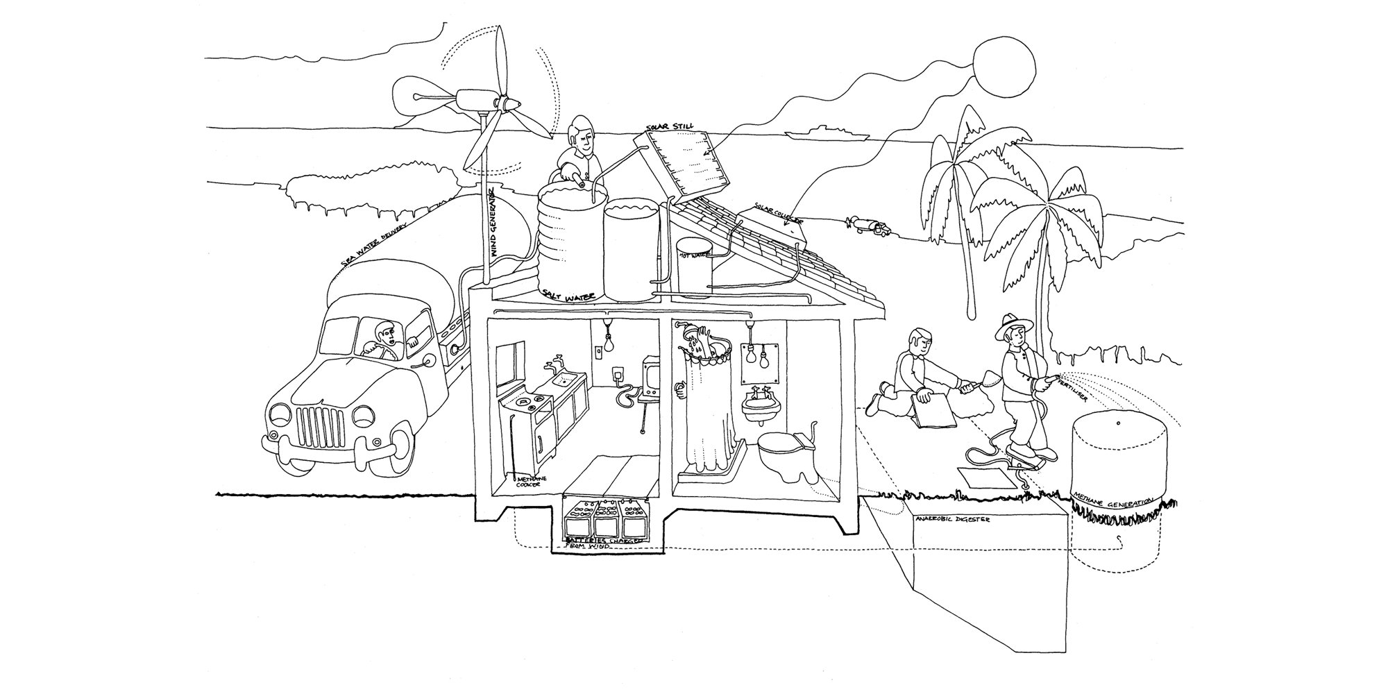 Drawing of a home on Gomera and how it could be supported by natural resources; wind power generates electricity for lighting; sea-water deliveries allow drinking water to be distilled in solar stills; and anaerobic generators digest household waste to create methane gas for cooking. © Birkin Haward / Foster + Partners