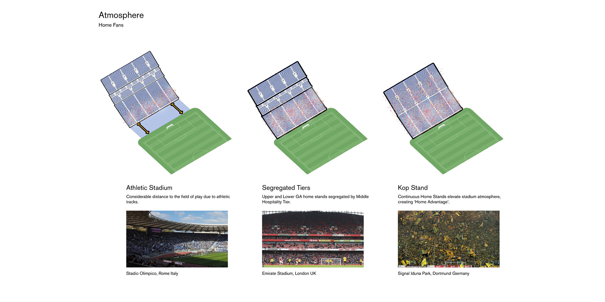The evolution of stadium home stand and its effect on atmosphere. Early stadiums designs had athletic tracks that distanced fans from the pitch; the introduction of hospitality in the middle tier also separated lower tier and upper tier home fans; today the 'Kop' stand model offers a dedicated uninterrupted stand. © Foster + Partners