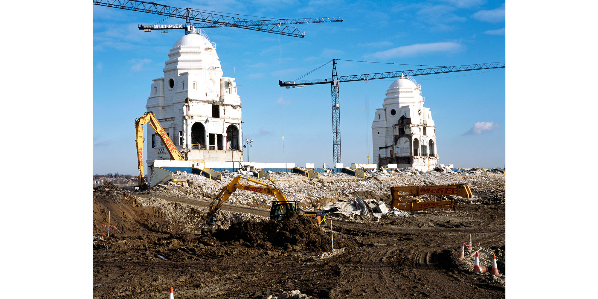The giant German excavator 'Goliath' clears the site; the twin towers remain in the background – the last pieces to go. © Nigel Young / Foster + Partners