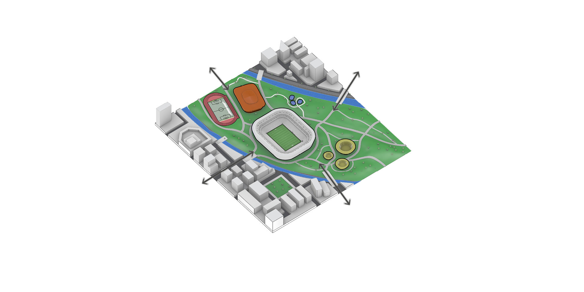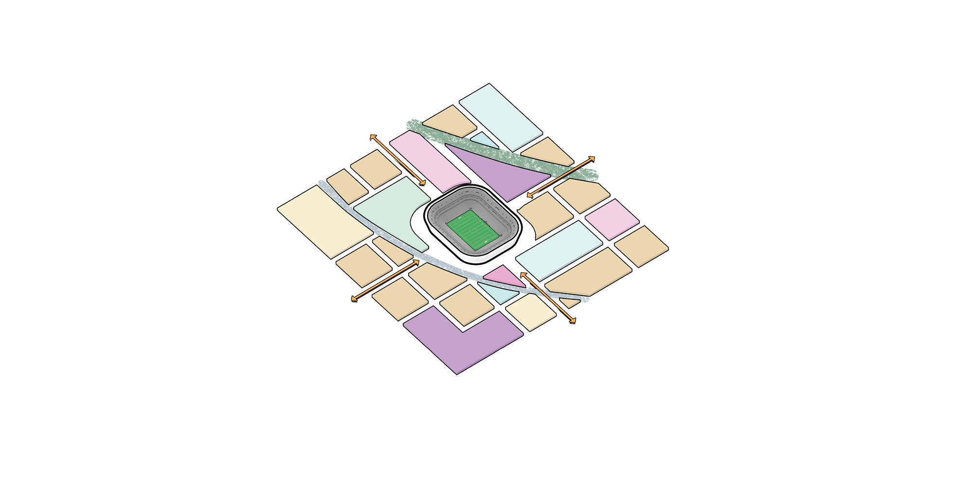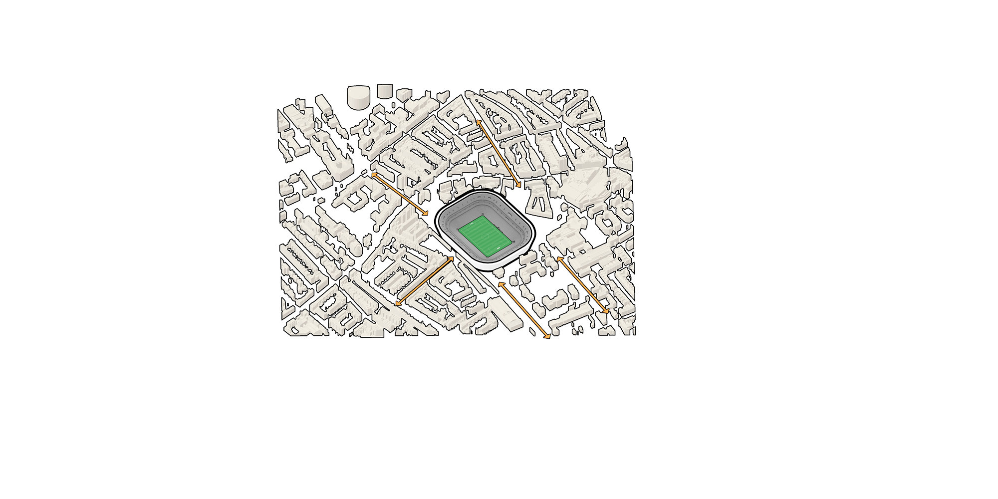 One way of blurring the boundary between stadium and city is to broaden the scope of what a stadium can be – a programmatic expansion enabling the stadium to be visited every day of the week. By considering the spaces around the stadium with the same care and attention as the stadium itself, we can enhance and extend the matchday experience. Introducing a walkable precinct, for example, enables and encourages fans to gather before and after the match, building anticipation and fostering connections between supporters. These spaces have the important added bonus of providing for the rest of the population too, making the stadium and its locale a destination for every day of the week.