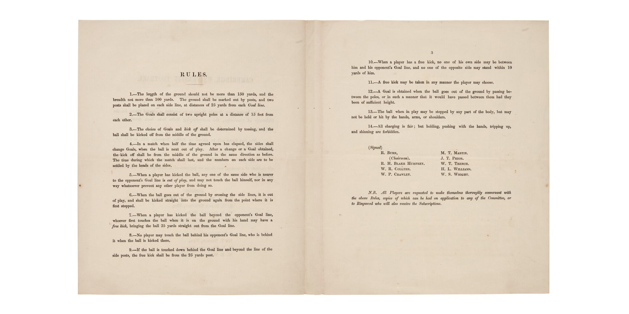 Cambridge University Football Rules, 1863. This leaflet is believed to be the first publication of the rules of football that formed the basis of the first rules of the football association. 'The length of the ground should not be more than 150 yards, and the breadth not more than 100 yards.' Source: Sotheby’s