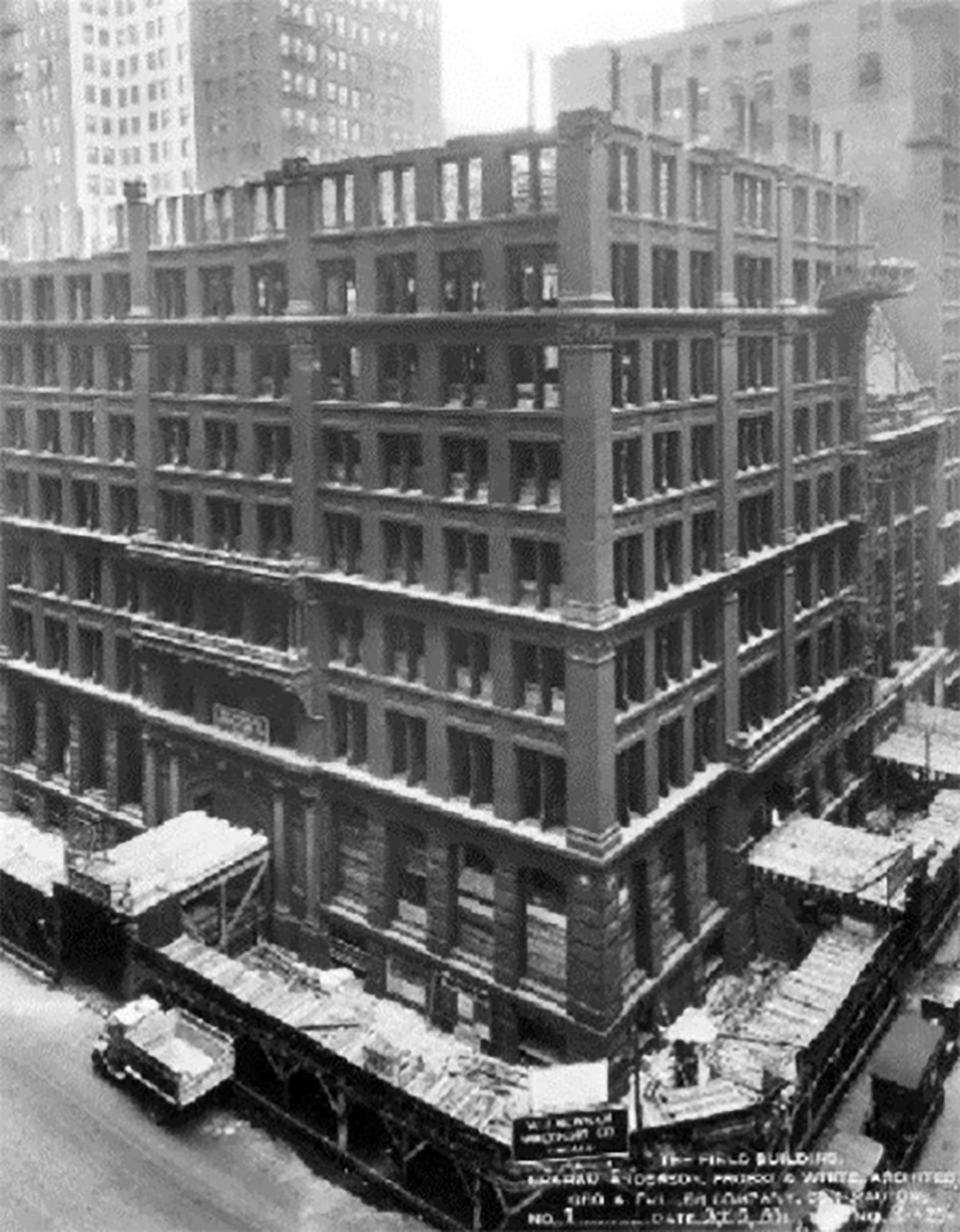 While Le Baron Jenney’s Home Insurance Building is often seen as the first skyscraper, buildings such as the Reliance Building, 1895, were more unequivocal in their use of a steel skeleton. Shown here under construction and completed, the steel-framed Reliance Building was primarily designed by American architect Charles B. Atwood. The façade is composed of plate-glass bay windows surrounded by terracotta cladding. © Tango Images / Alamy Stock Photo